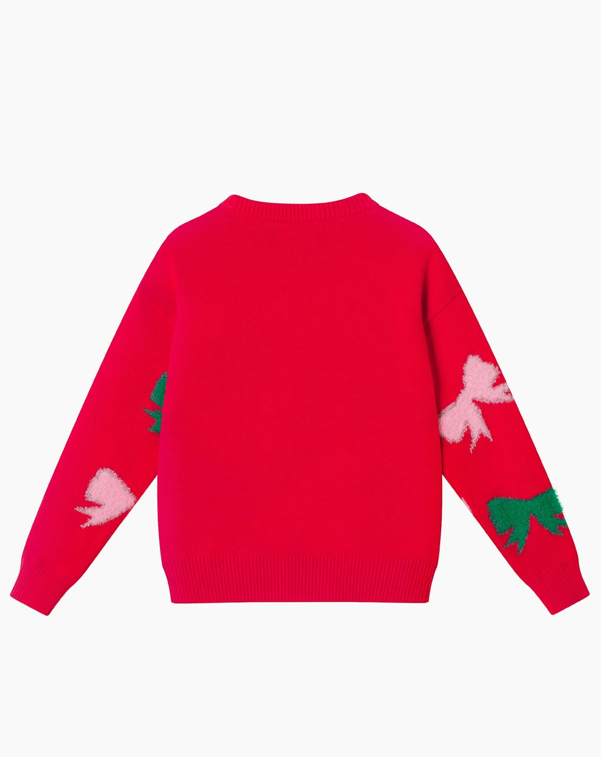 This festive statement sweater brings maximum cheer with its fuzzy bow motif and bold holiday-ready colors. Soft to the touch and full of personality, it's made for moments when just a little extra flair is called for. The cozy knit keeps warmth in without weighing things down, and the ribbed trim adds polish at the edges. Whether it's a party, picture day, or just a cozy afternoon, this piece turns up the fun while keeping things comfy.