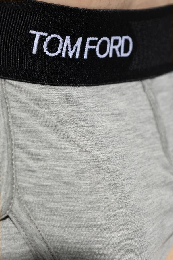 The design boasts a striking black waistband adorned with the iconic white "TOM FORD" logo, centrally placed for maximum visibility. The classic shape of these briefs is accentuated by distinct seams, underscoring durability and a flawless fit.