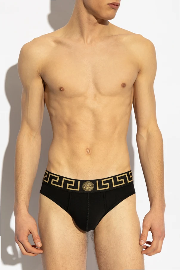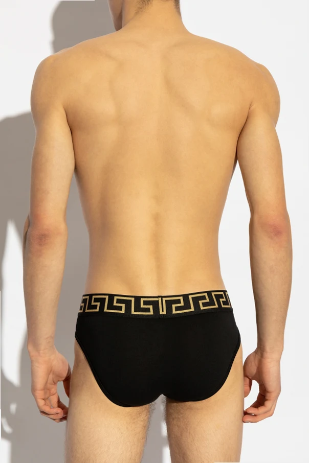 Introducing the Versace Two-Pack Briefs , a paragon of elegance and comfort. These exquisite briefs come in classic black and sophisticated gray, adorned with a distinctive waistband featuring a golden Greek meander pattern . At the center, the golden designer logo adds a touch of luxury, reflecting the opulence synonymous with the Versace brand.