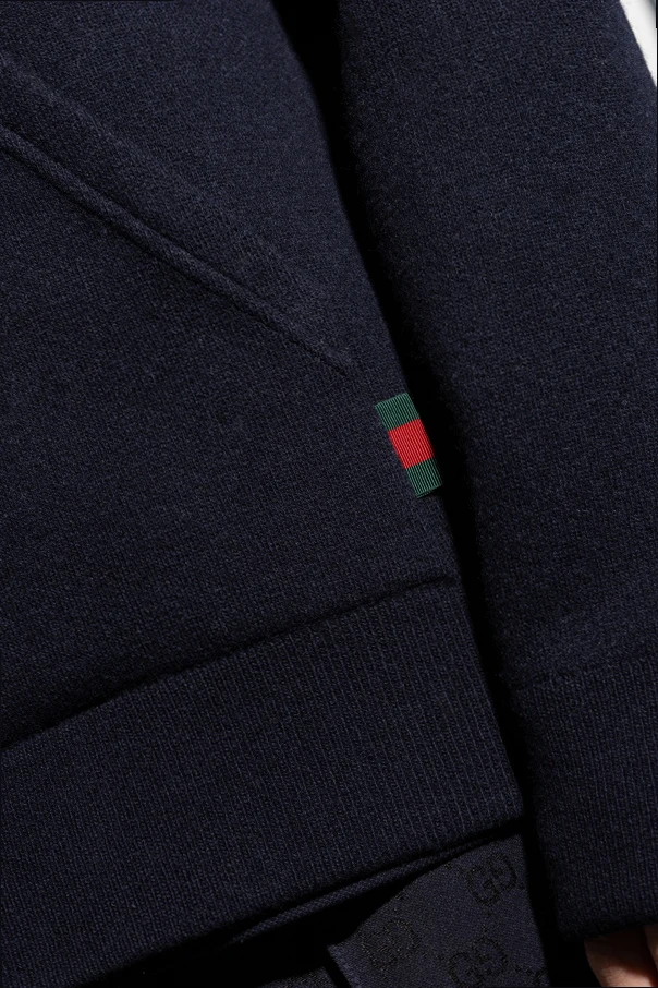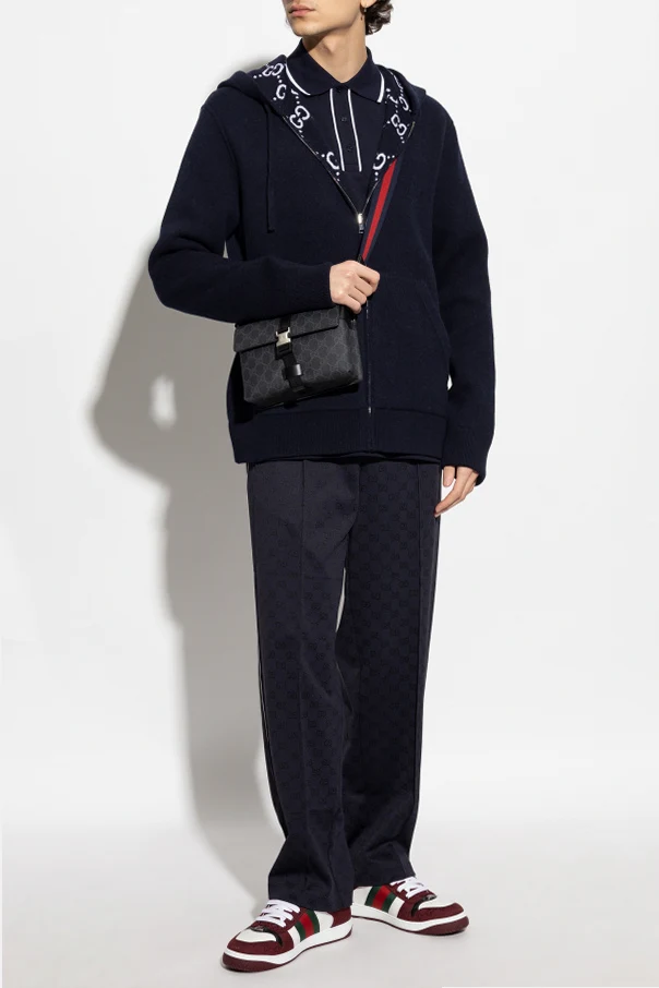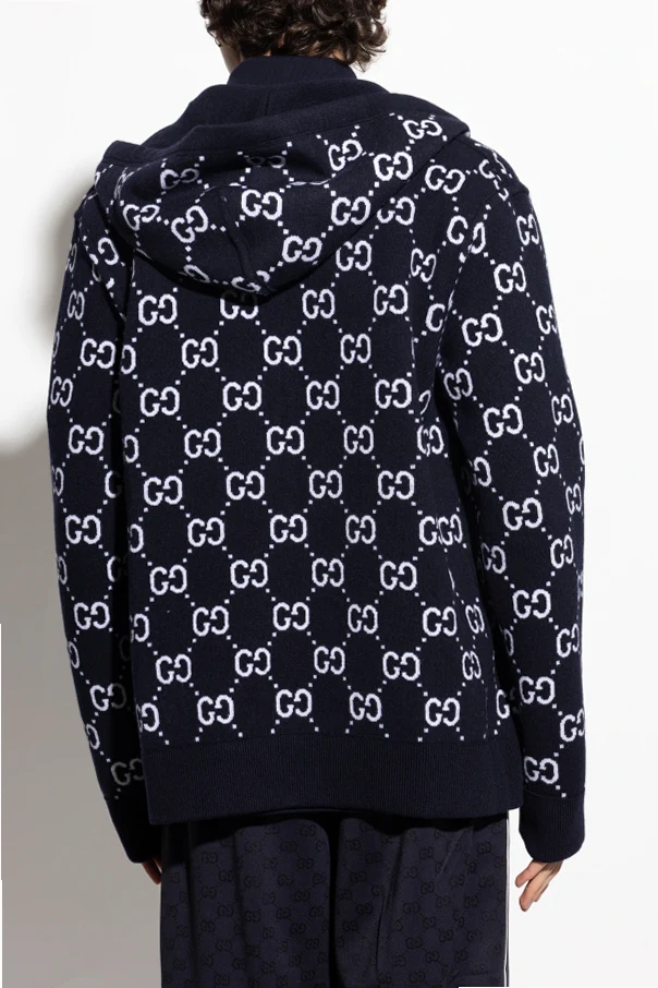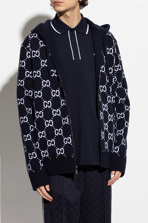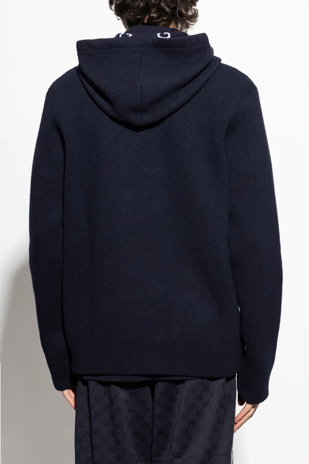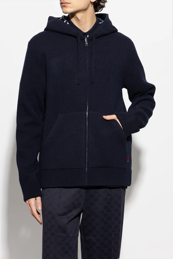 Introducing the Reversible Wool Jacket by Gucci , an epitome of luxurious elegance and modern design. This dark navy masterpiece is crafted from premium wool, featuring a classic hooded silhouette with a full-length zipper and front kangaroo pockets, exuding timeless sophistication.