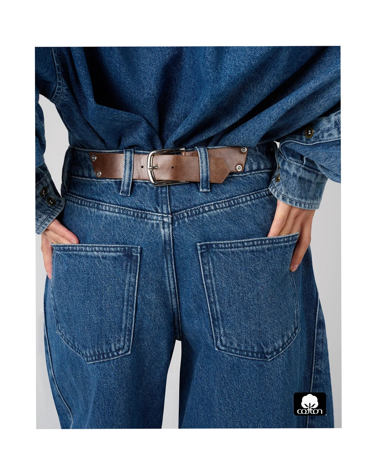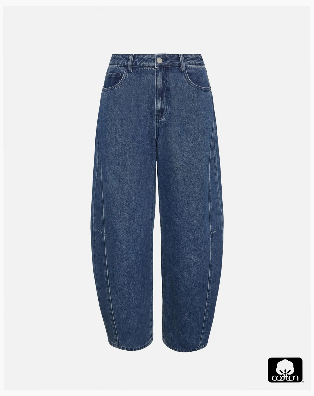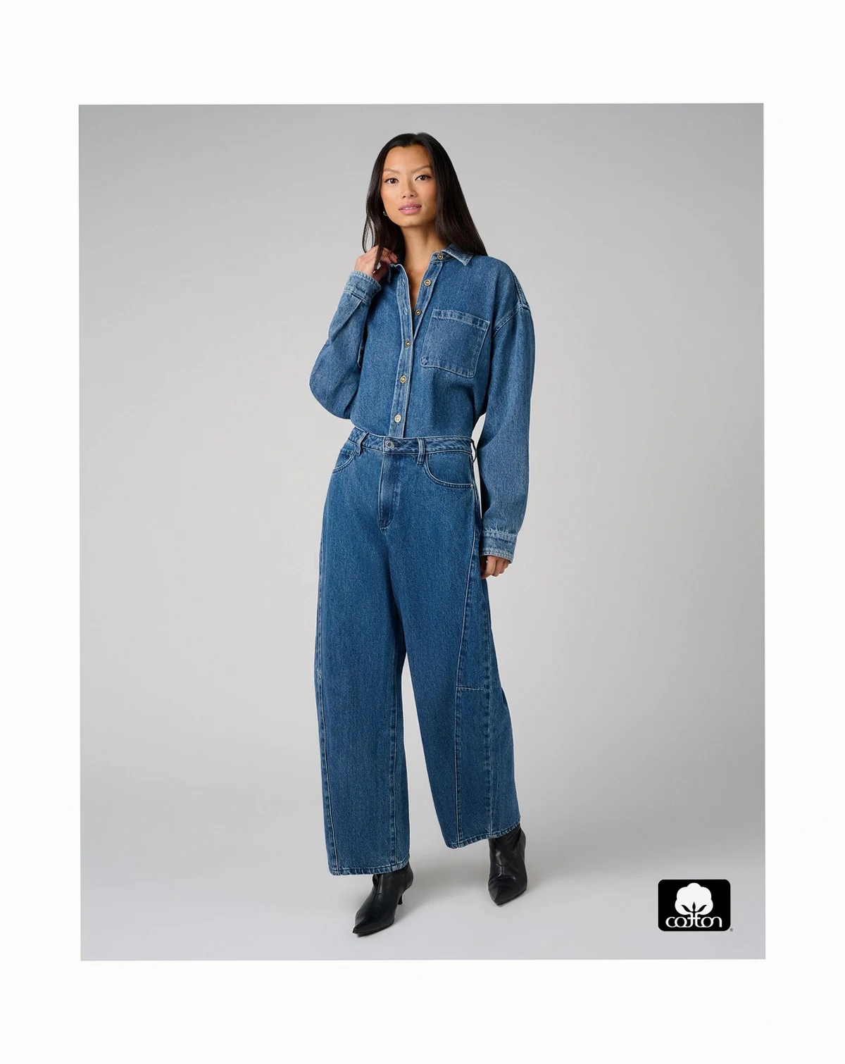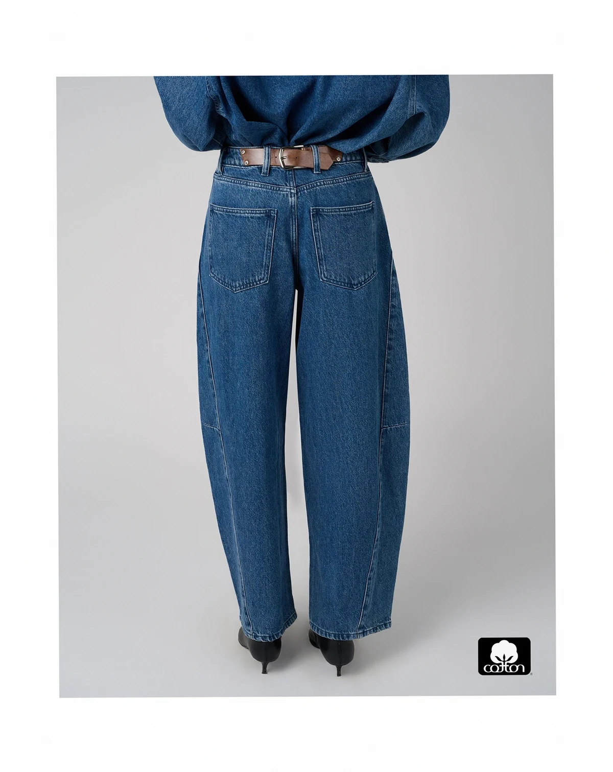 These barrel jeans feature a mid-rise waist with belt loops, pockets and a front-fly closure. They fit wide at the knee before easing into a barrel leg shape that tapers at the hems.