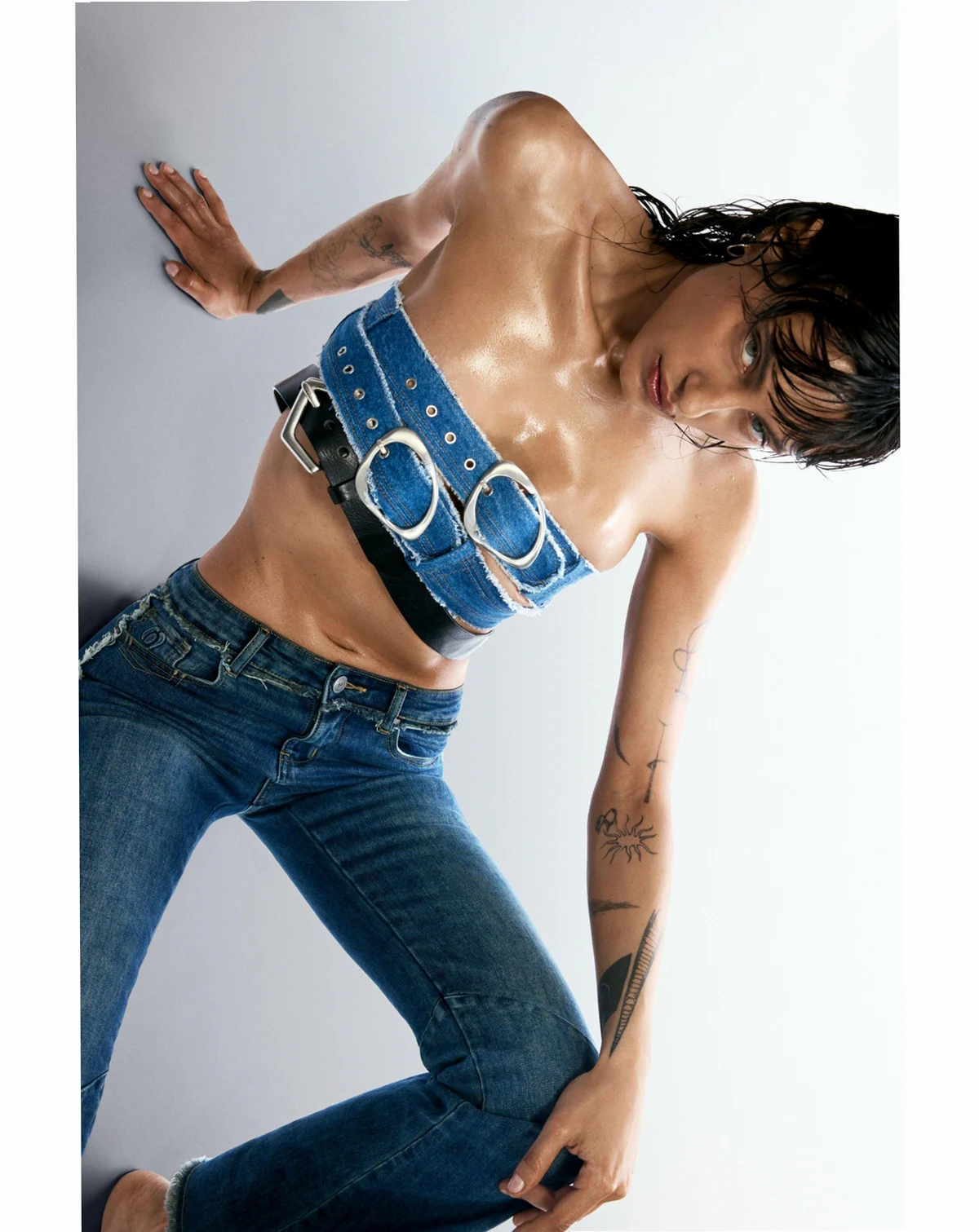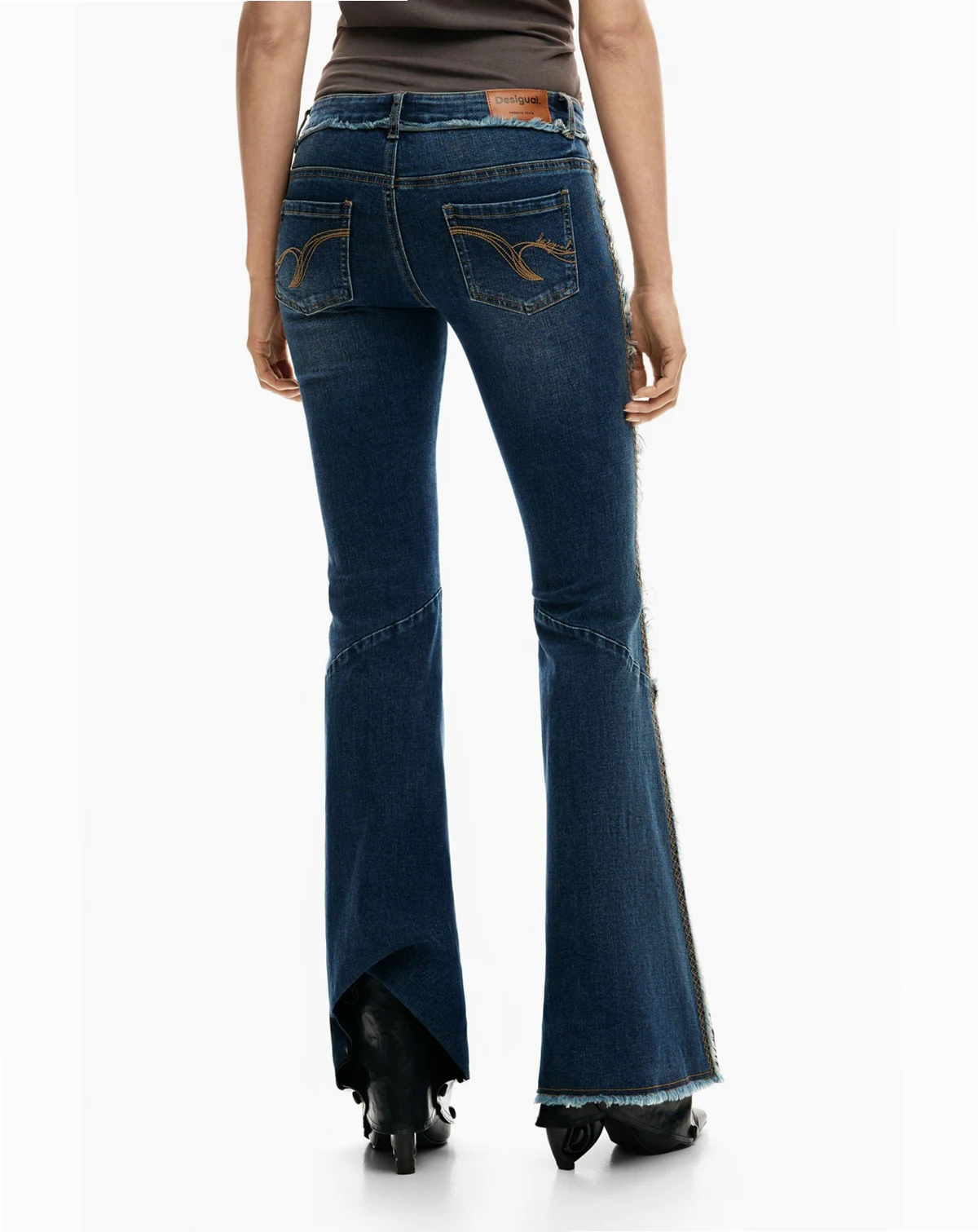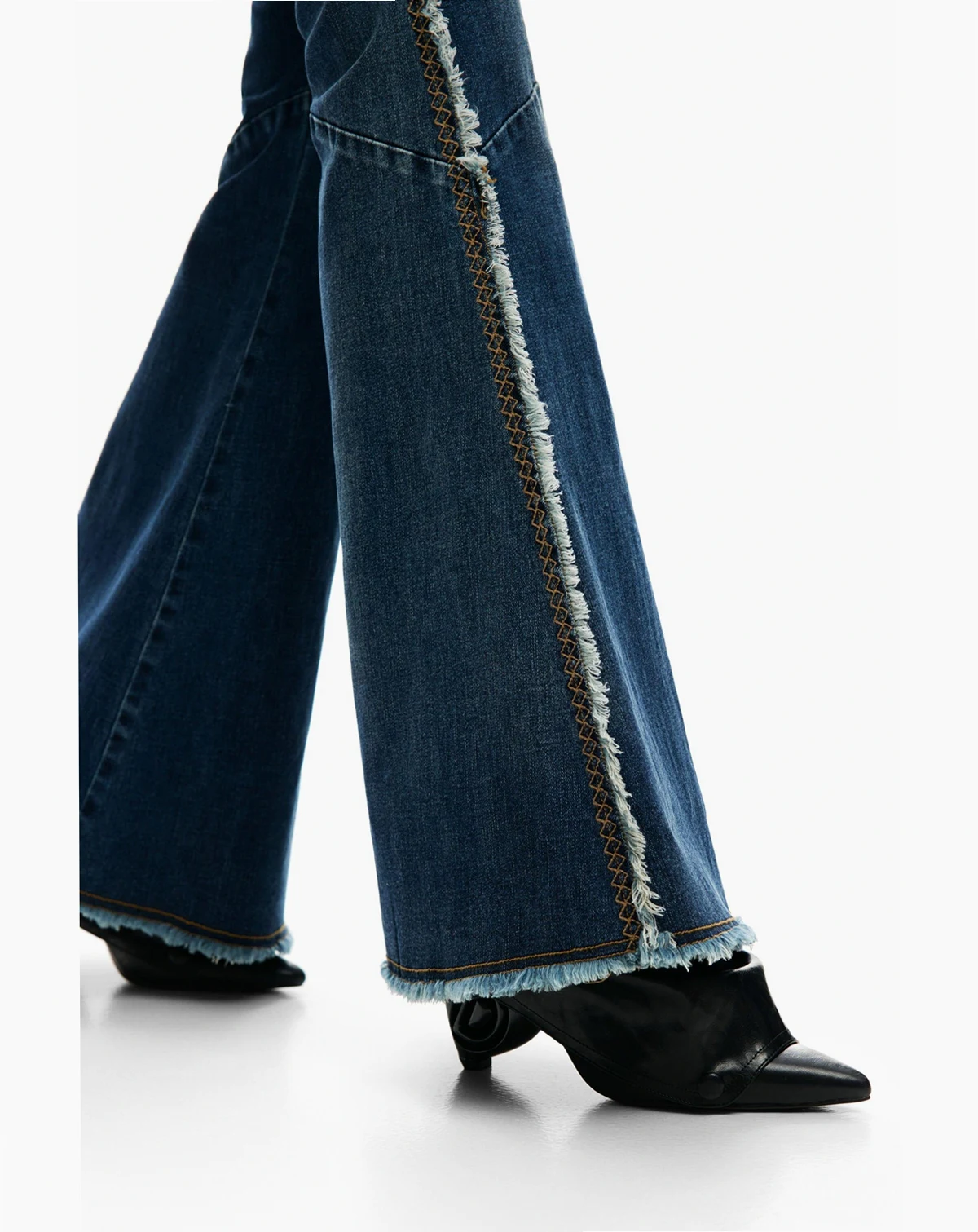 Flared-cut denim trousers with decorative stitching and frayed details on the sides.