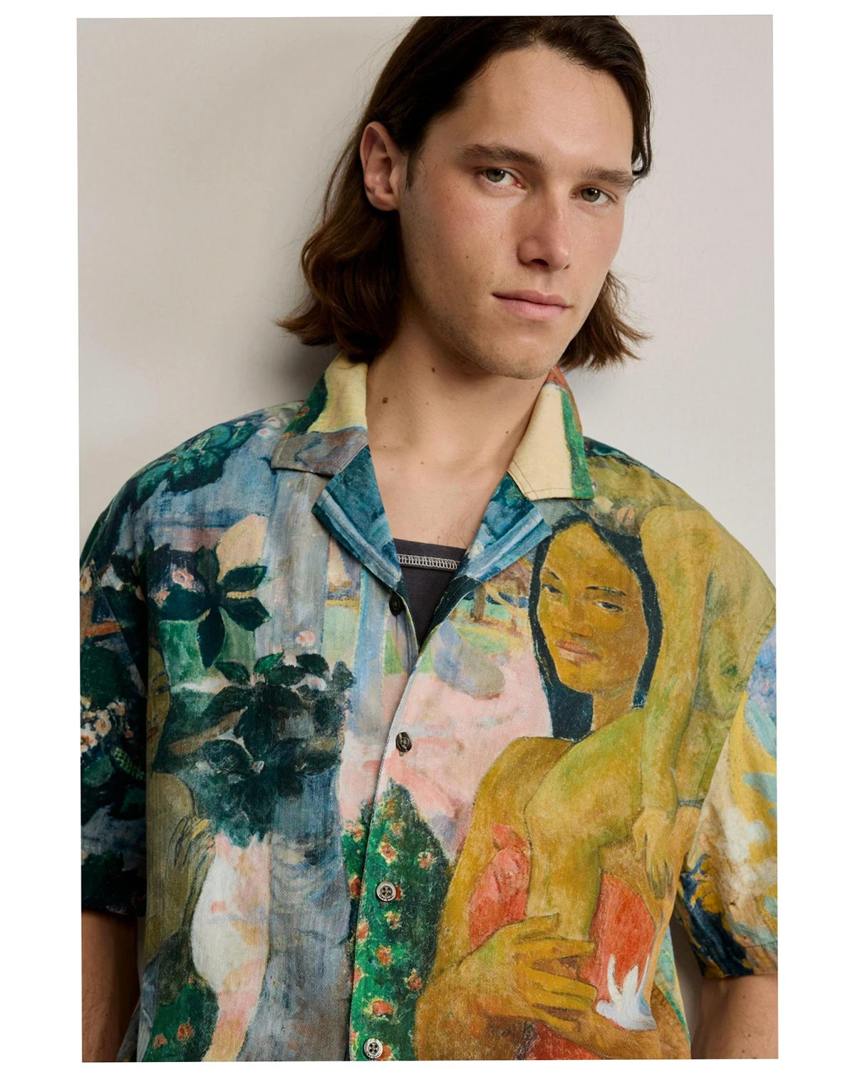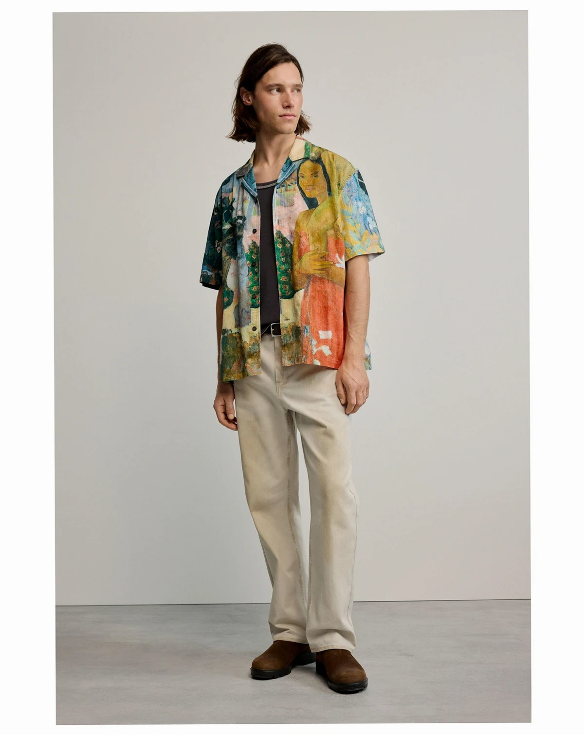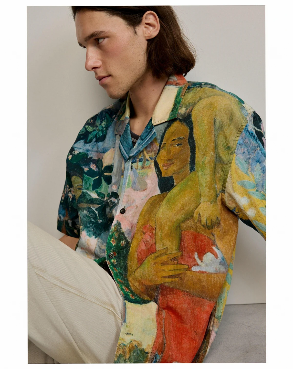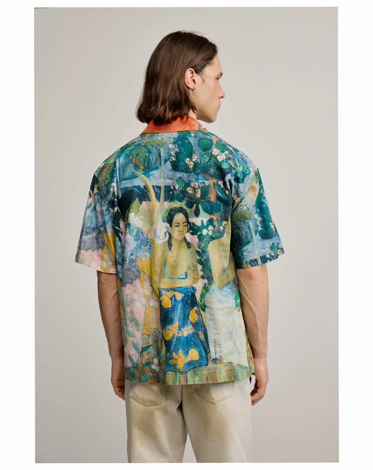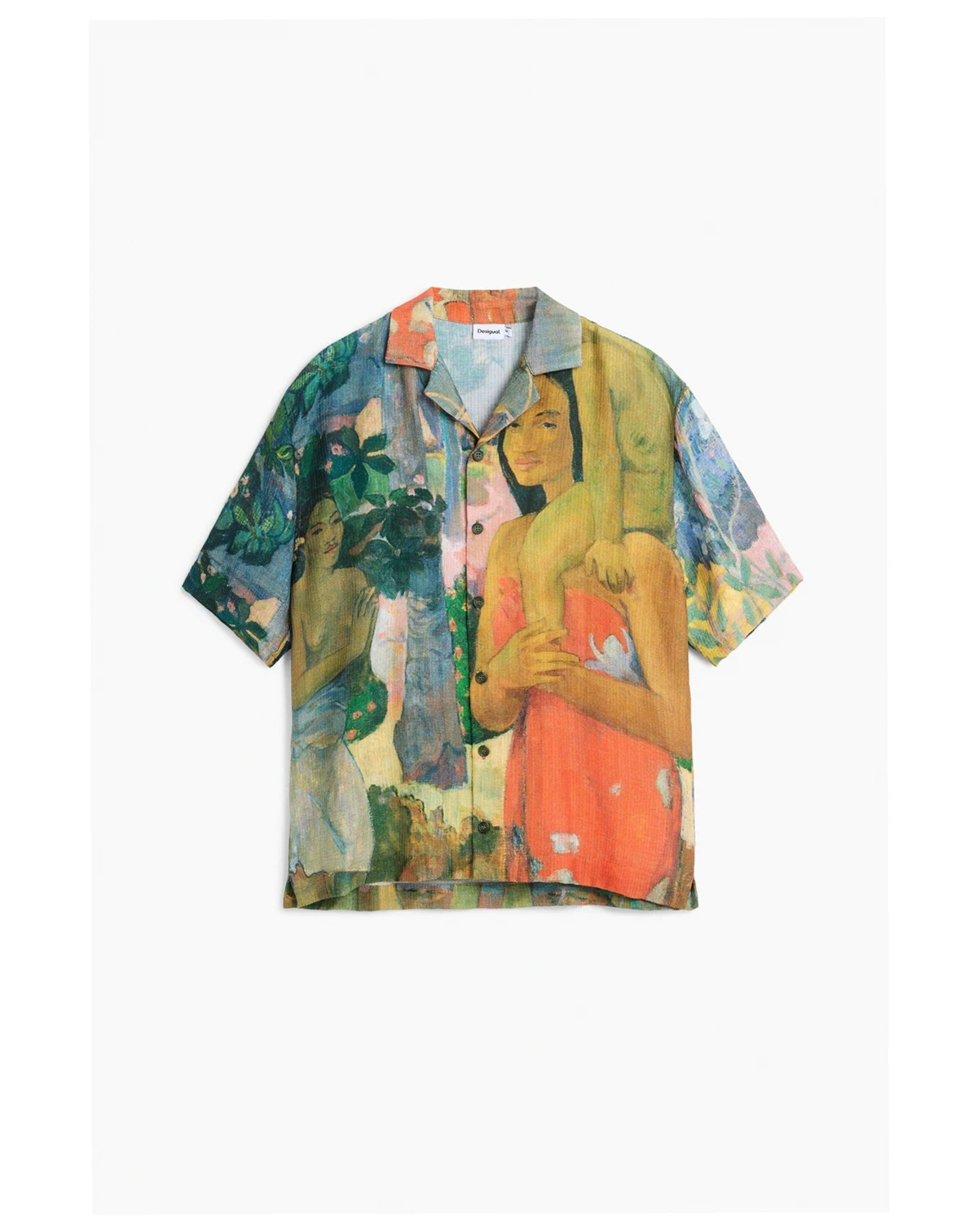 Short-sleeved shirt made of 100% cotton fabric with an abstract print in red and green tones. Shirt collar and front closure with matching visible buttons. Design with regular drape and straight cut.