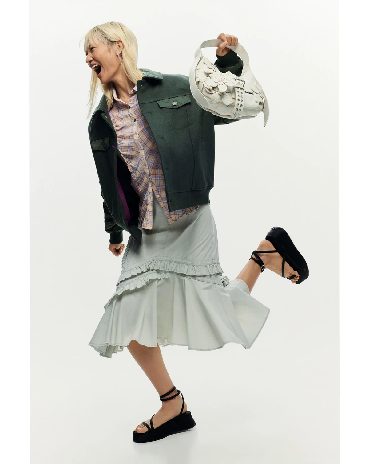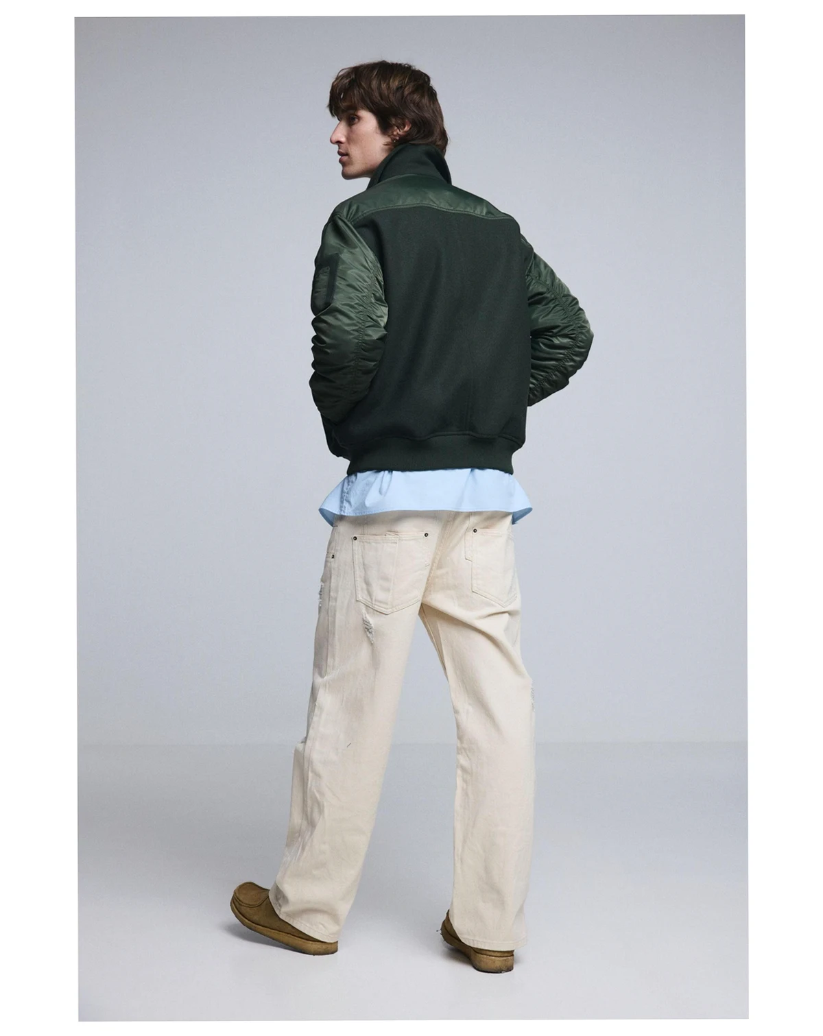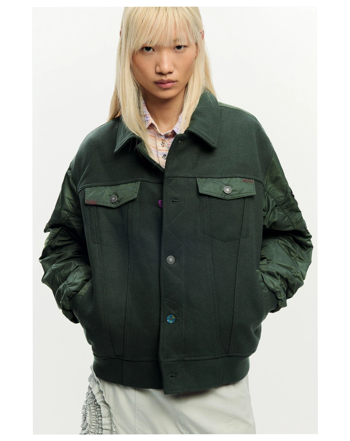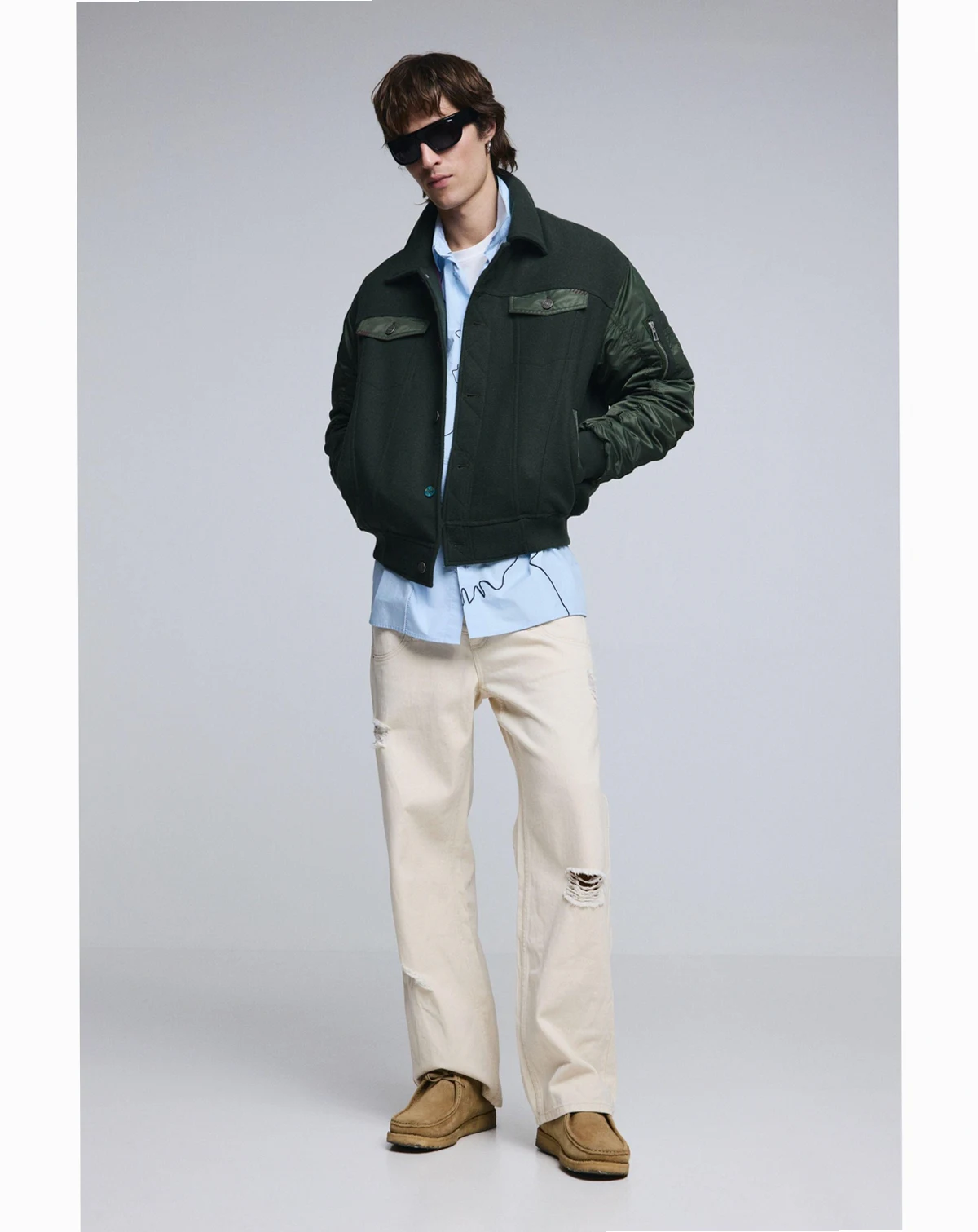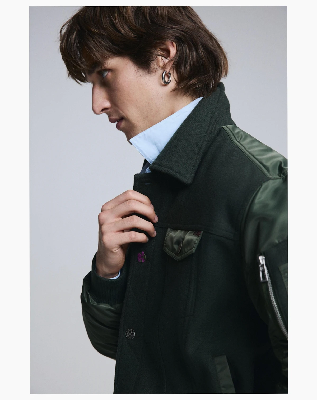 Hybrid jacket with ruched details on the bomber-inspired sleeves and coat-style body in cloth.
