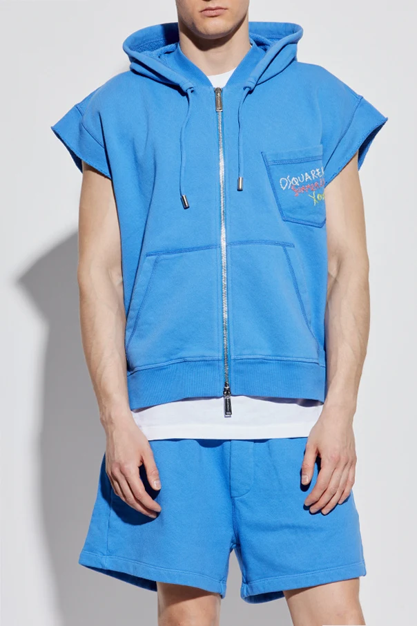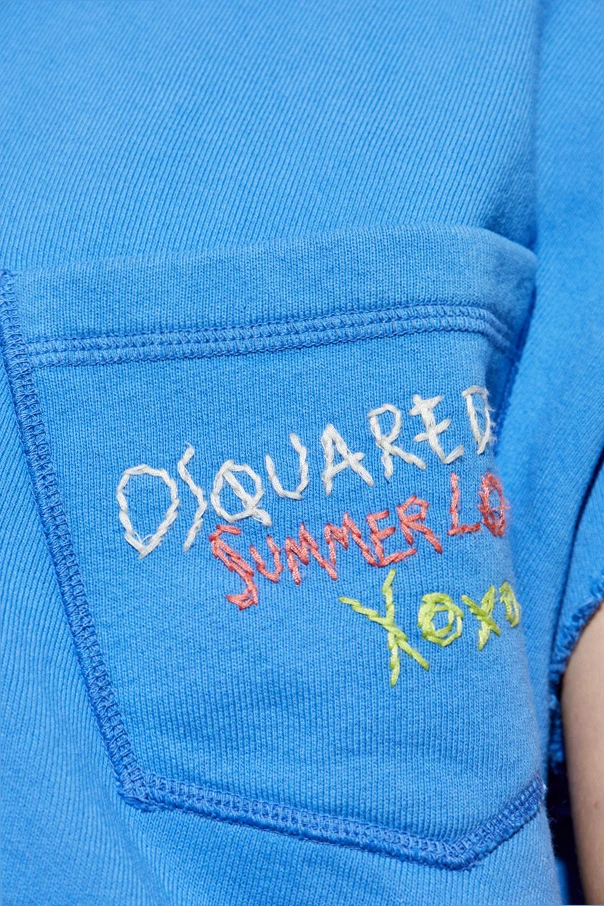 The design features a regular fit silhouette accentuated by a zip-up front and sleeveless construction, exuding an effortless, relaxed vibe. The vibrant, solid blue hue serves as an elegant canvas for the embroidered embellishments on the left front pocket. Intricate stitching spells out "DSQUARED2," "Summer Love," and "Xoxo," adding a dash of whimsy and exclusivity.