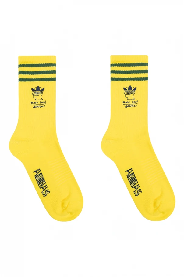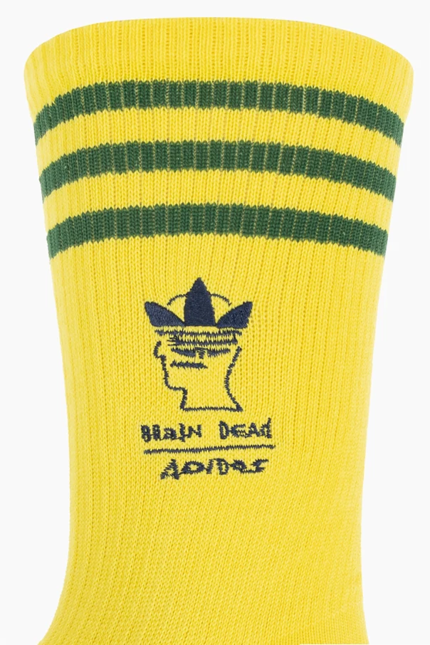 Introducing the adidas x Brain Dead socks , a testament to avant-garde fashion blending with unparalleled comfort. Enveloped in a striking yellow hue , these socks boast dual dark stripes at the top, making a bold statement. Imprinted with the distinctive Brain Dead logo, featuring its iconic head design, alongside "Brain Dead" and "adidas" inscriptions, these socks epitomize modernity intertwined with classic elements.