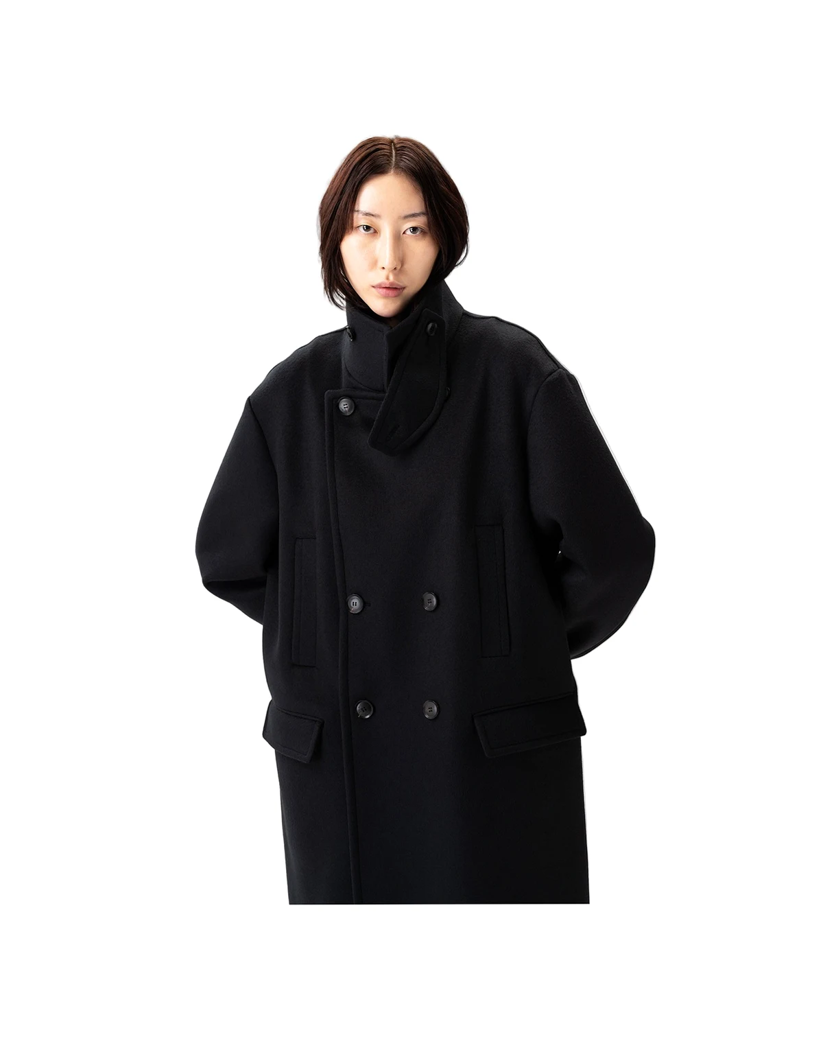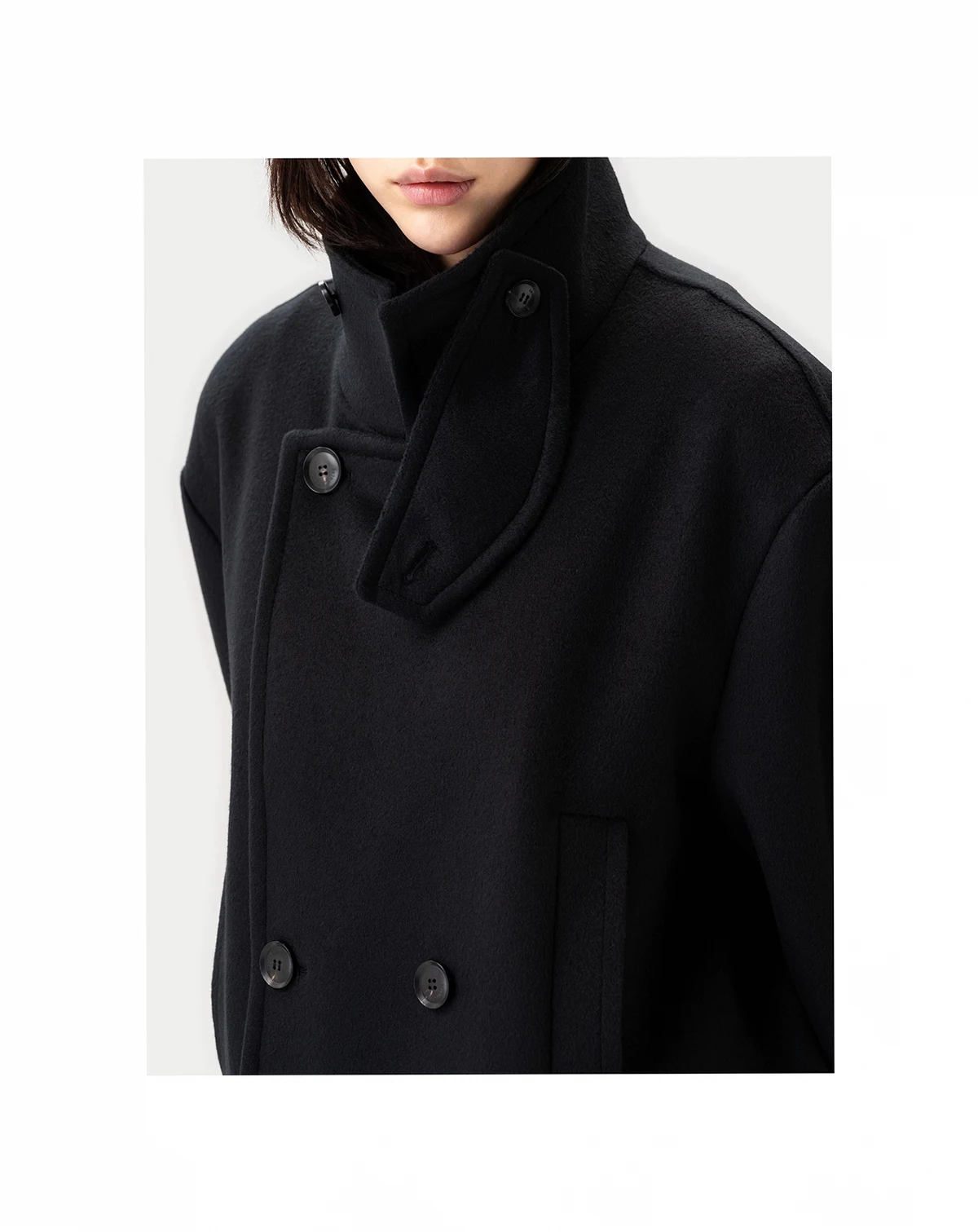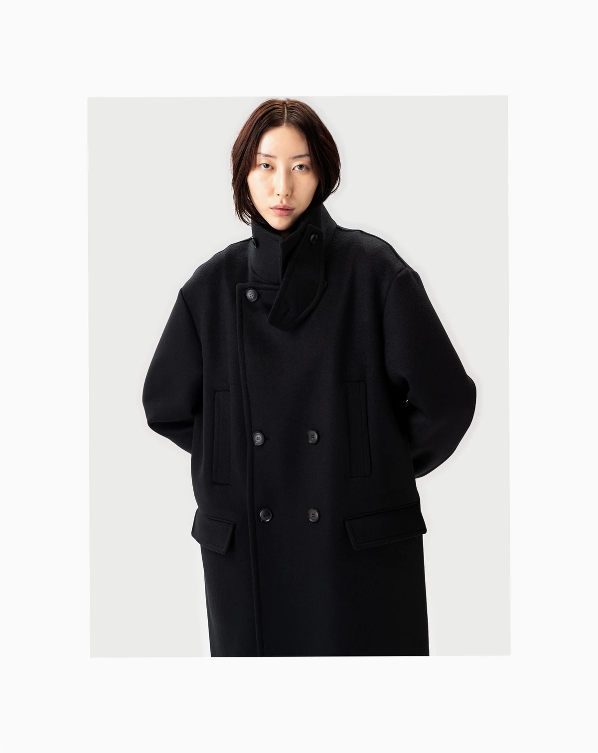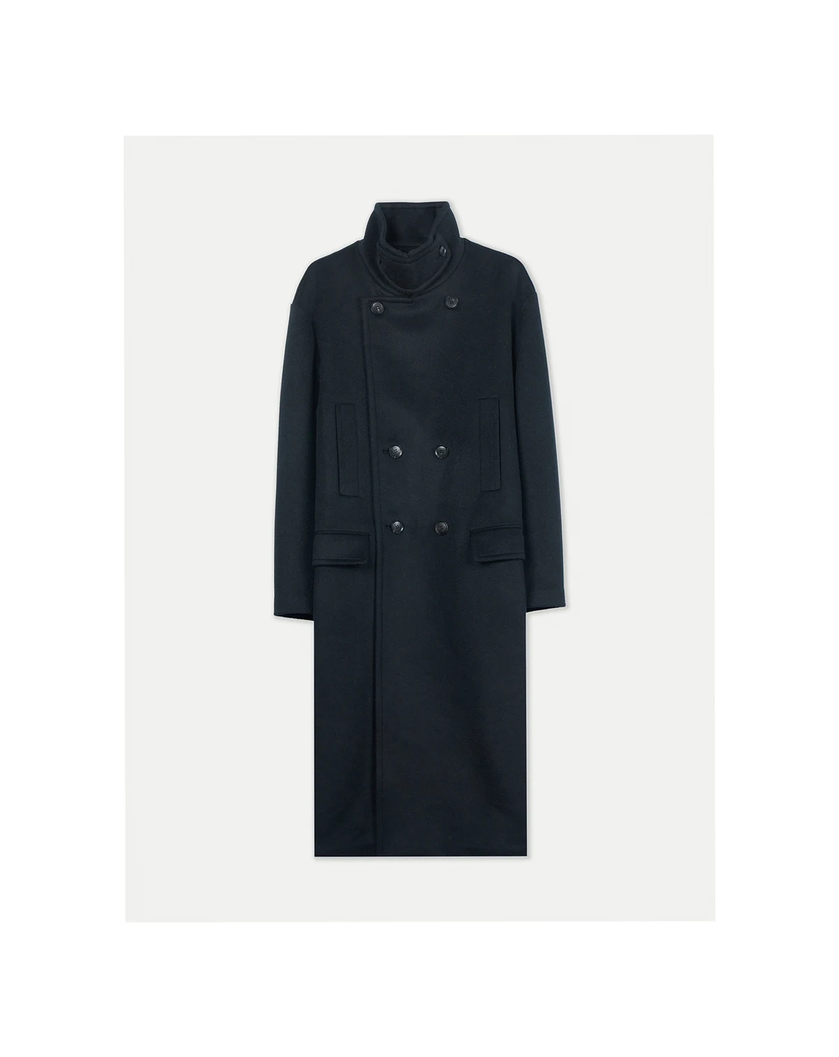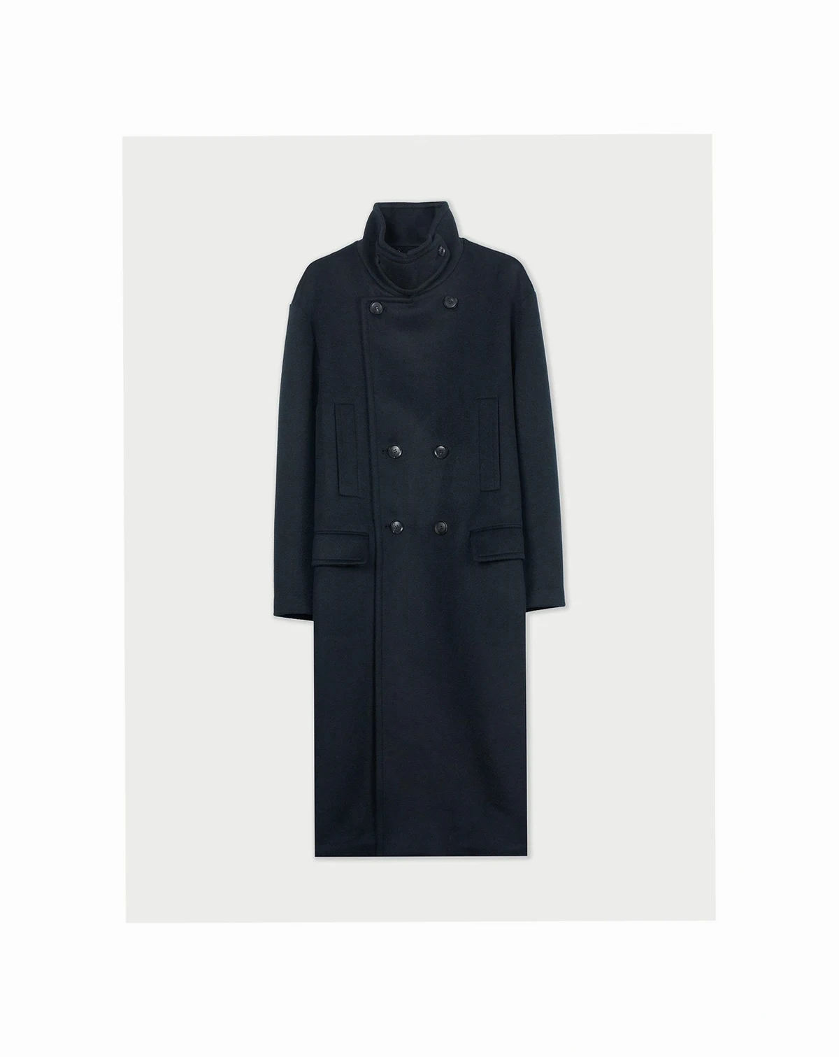 Inspired by the military trench coat, this piece reflects its classic details — the double-breasted front, broad shoulders, straight silhouette, epaulettes, and large flap pockets. Crafted from thick, breathable double-faced cashmere, it stands as a timeless signature piece of the F/W collection.