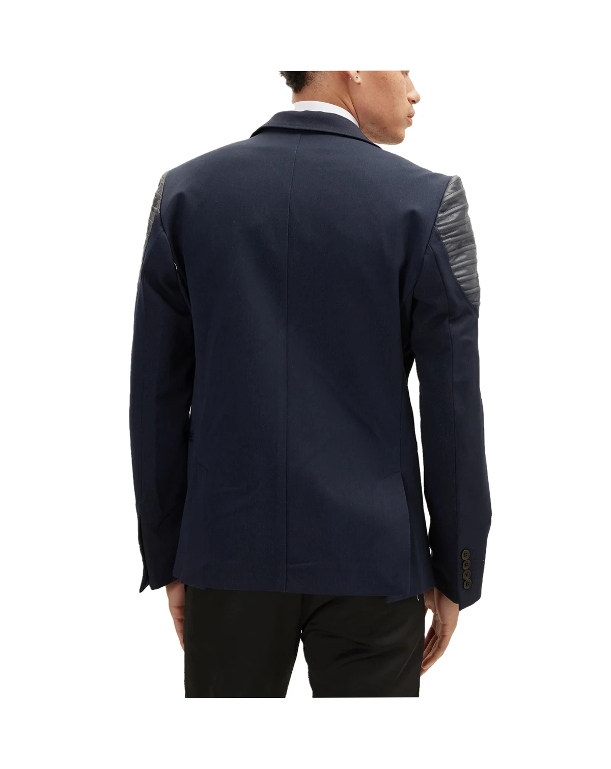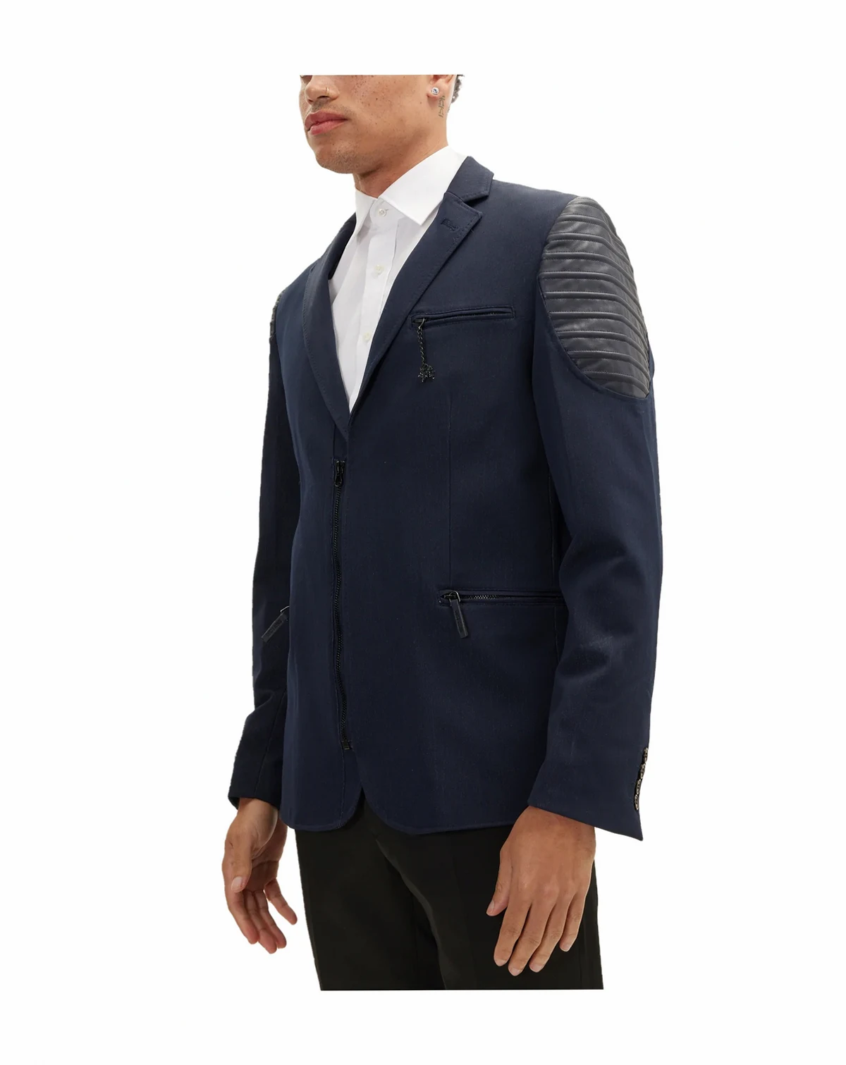 This powerful jacket is sure to make you stand out from the crowd. With half zipper closure, it accentuates the chest area. Sleeve moto details add extra flare and style. Zippered pocket details and logo chain on chest pocket. Modern, European fitted construction. A must have for the modern man.