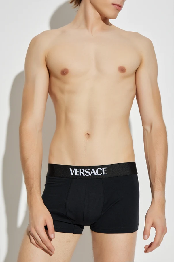 Experience the epitome of refined masculinity with the Versace Logo Boxer Briefs Three-Pack . Impeccably crafted in a smooth blend of premium cotton and elastane, these tailored short-cut trunks offer a silhouette-enhancing fit that ensures both comfort and elegance. The understated black fabric, adorned solely with a wide, elastic waistband featuring the iconic contrasting white VERSACE logo, achieves a minimalist aesthetic that exudes confidence and timeless sophistication.