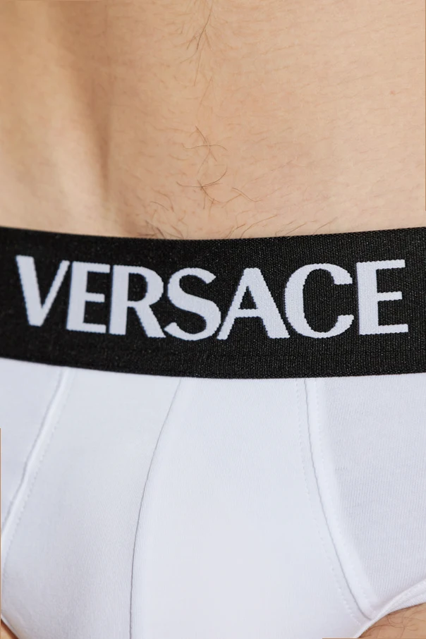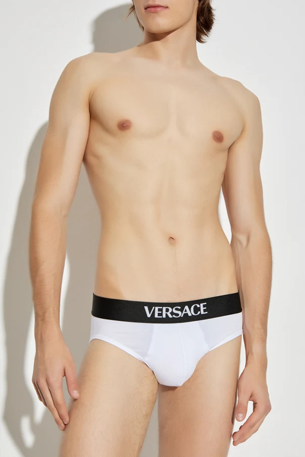 The design showcases a sleek, uninterrupted white canvas, accentuated by a bold, wide black waistband. Commanding immediate attention, the signature VERSACE logo is prominently displayed at the center, reflecting the maison’s commitment to distinction and contemporary elegance. Meticulously double-stitched at the front and crotch, these briefs ensure remarkable durability and an exacting fit.