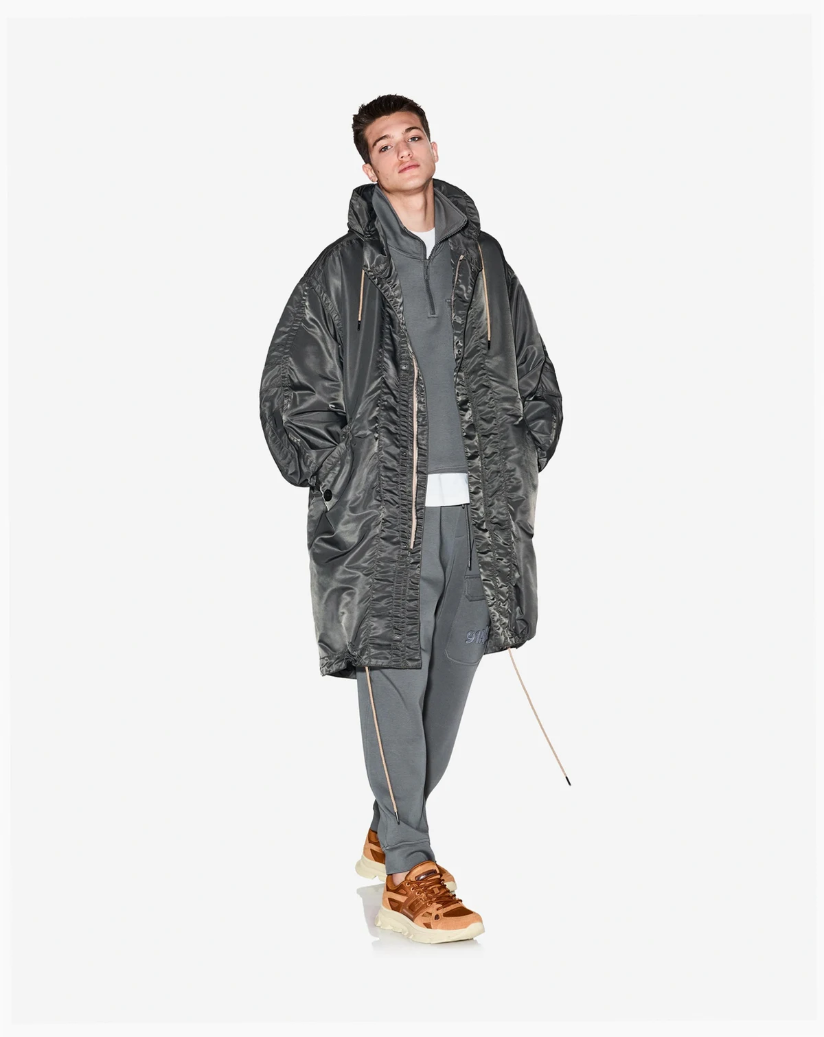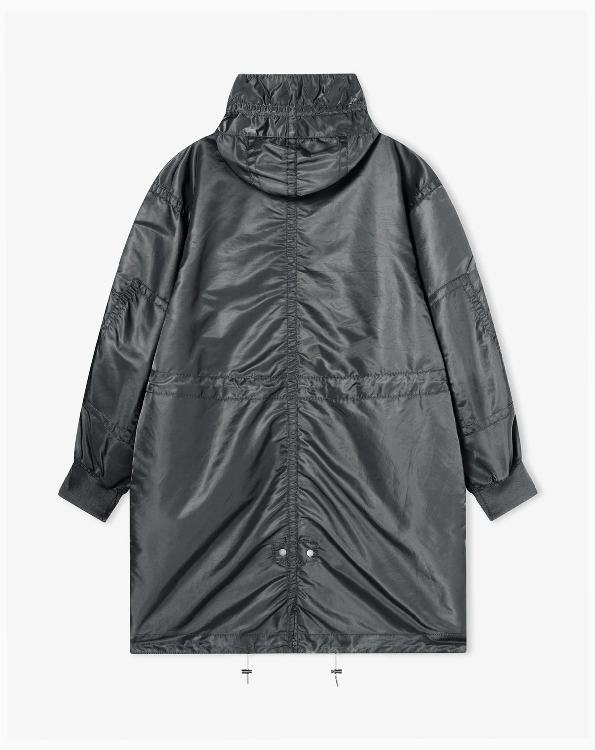 Long trench coat with high collar, buttoned flap pockets, ribbed cuffs, and adjustable drawstrings. Designed for warmth and sleek style—perfect for layering in cold weather.