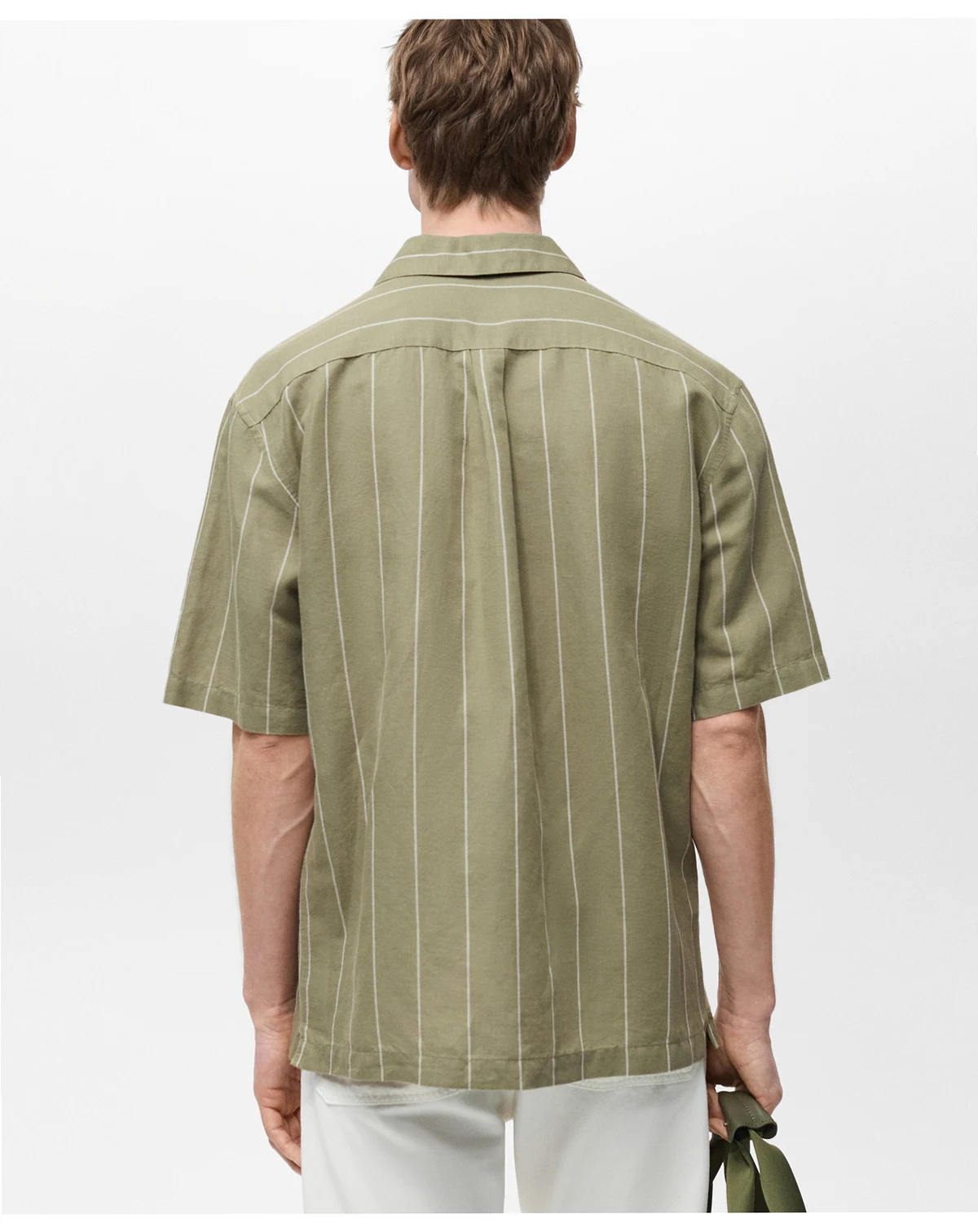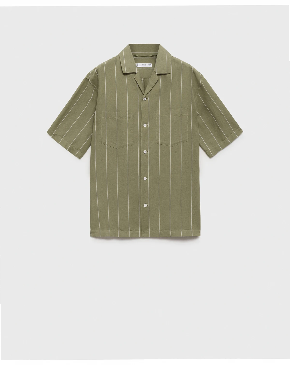 Subtle stripes meet relaxed refinement in the Linen Bowling Shirt with Pinstripes from Mango. This regular fit shirt features pinstripe design and straight hem with side slits.