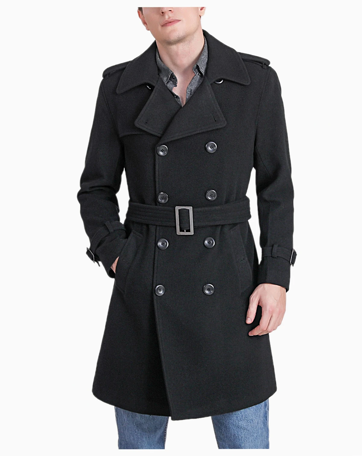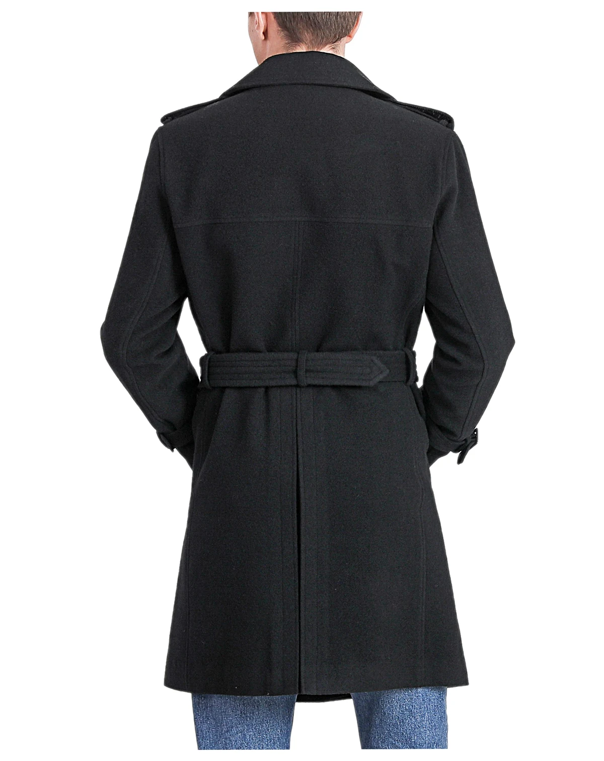 Military-inspired double-breasted trench coat in soft touch wool blend and accented by shoulder epaulettes and coordinating belt.