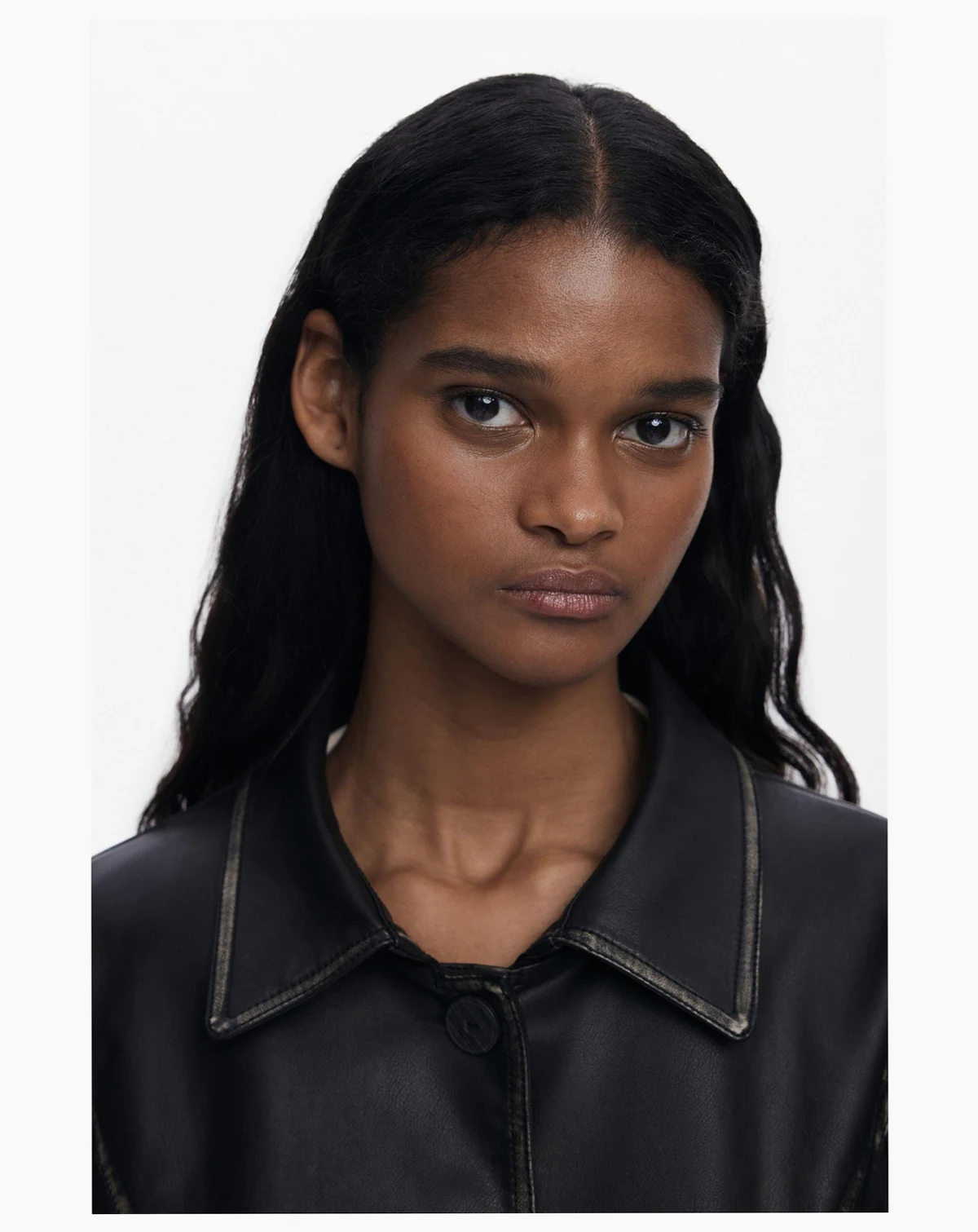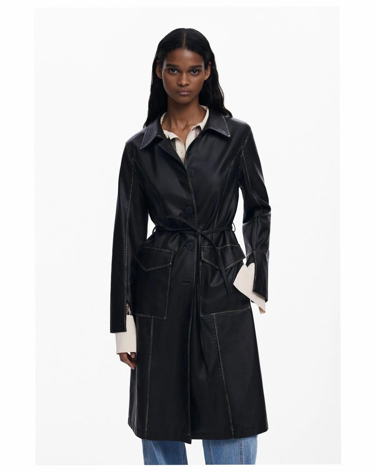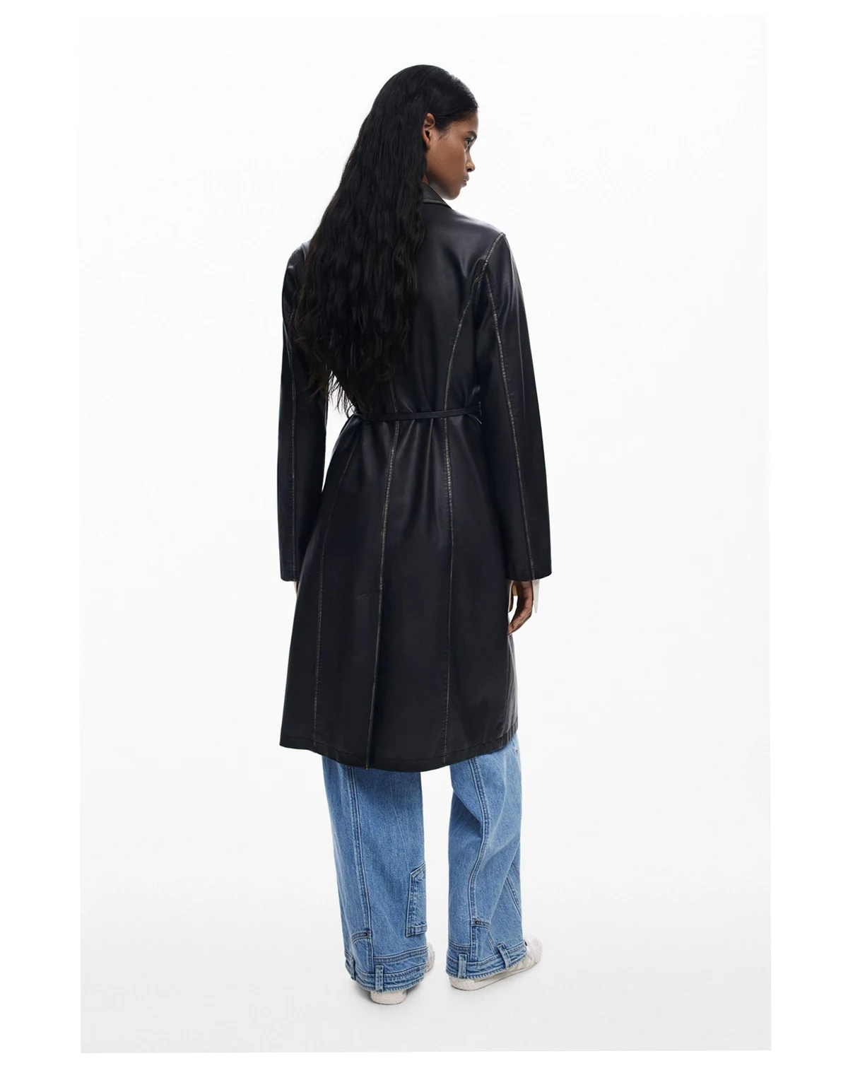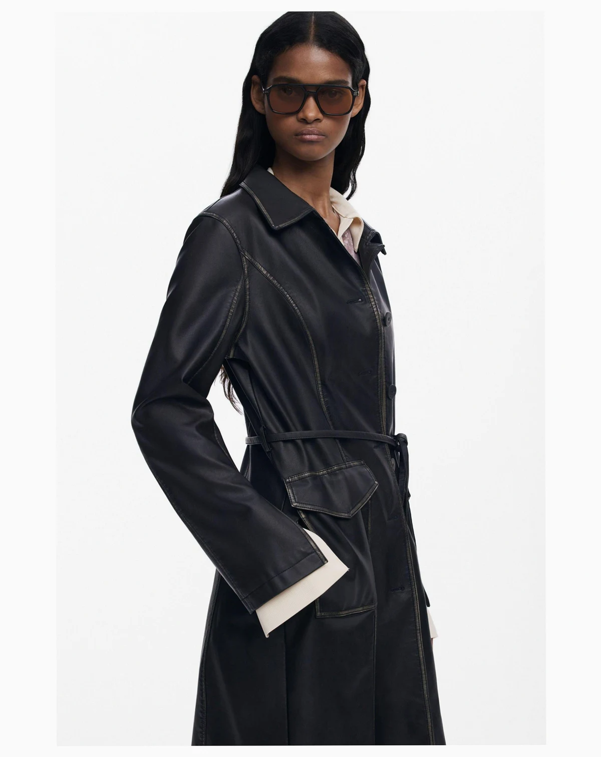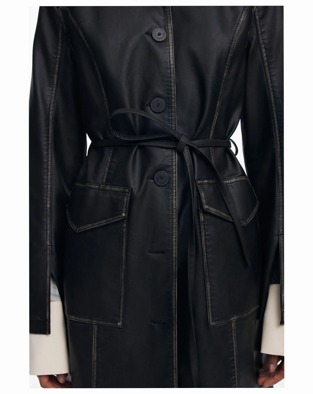 Long jacket knitted in worn leather effect with large front pockets, button closure, and removable drawstring at the waist.