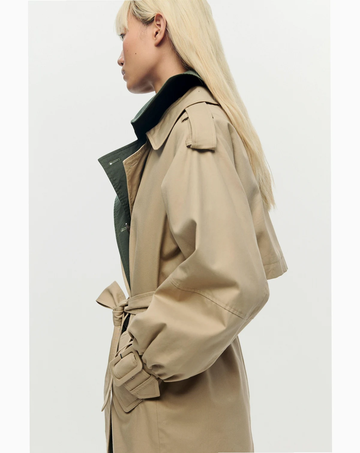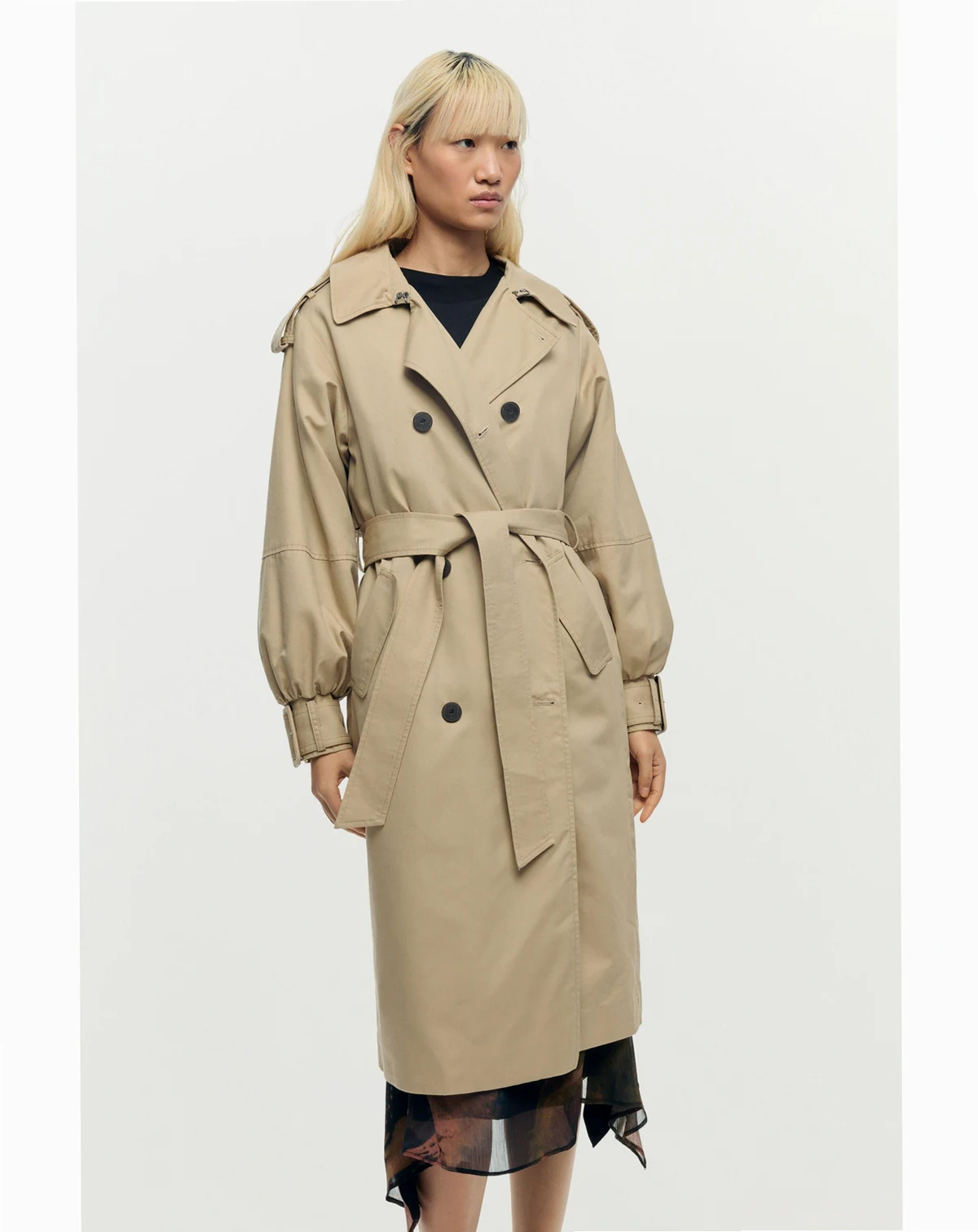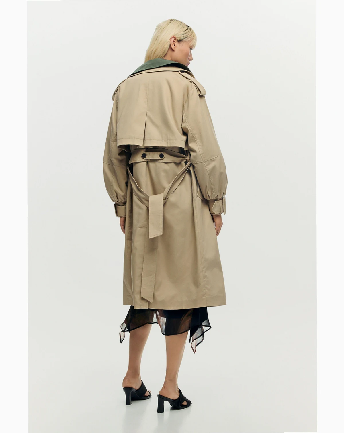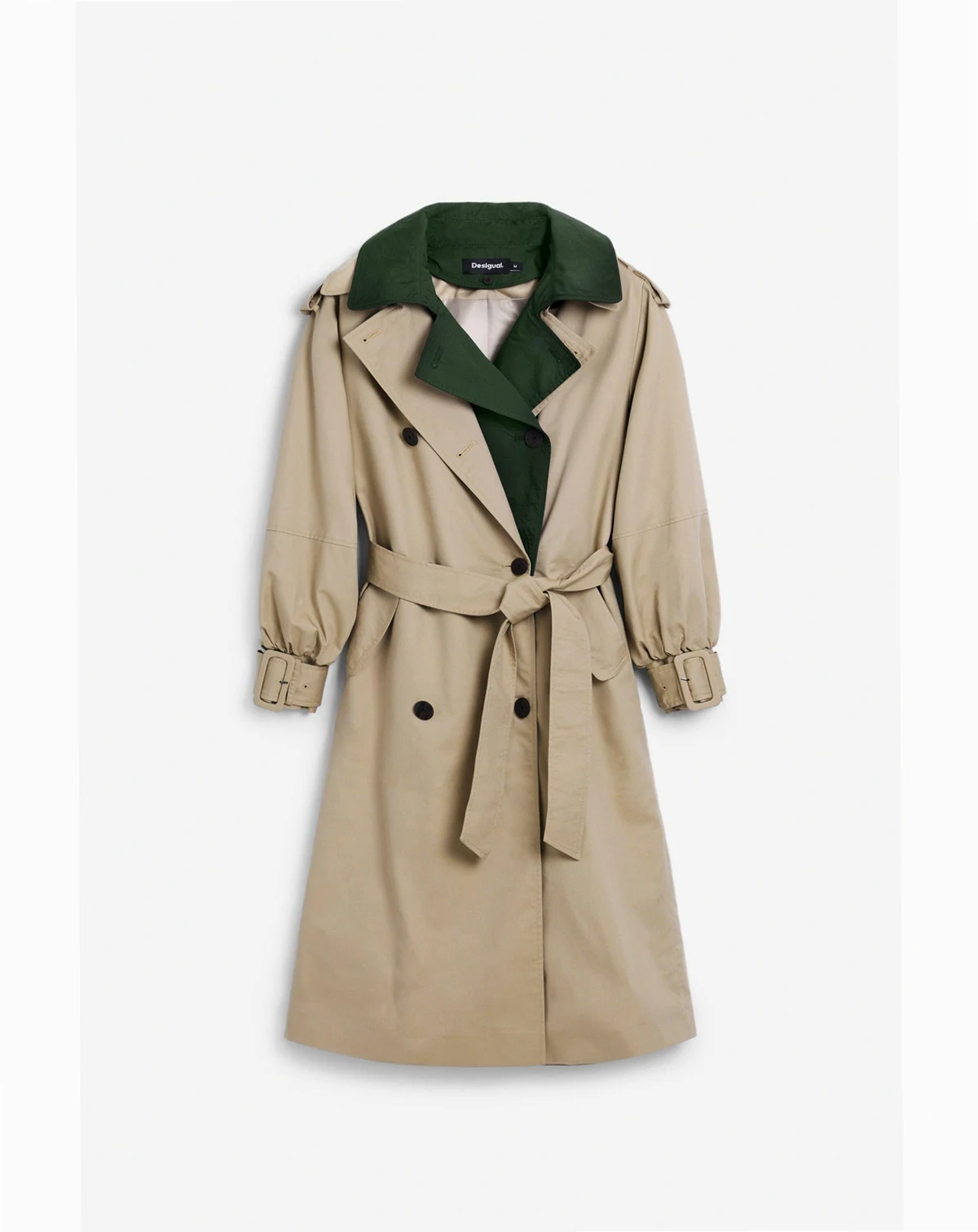 Long double-breasted trench coat with double removable lapel, sleeve tabs and decorative buttons.