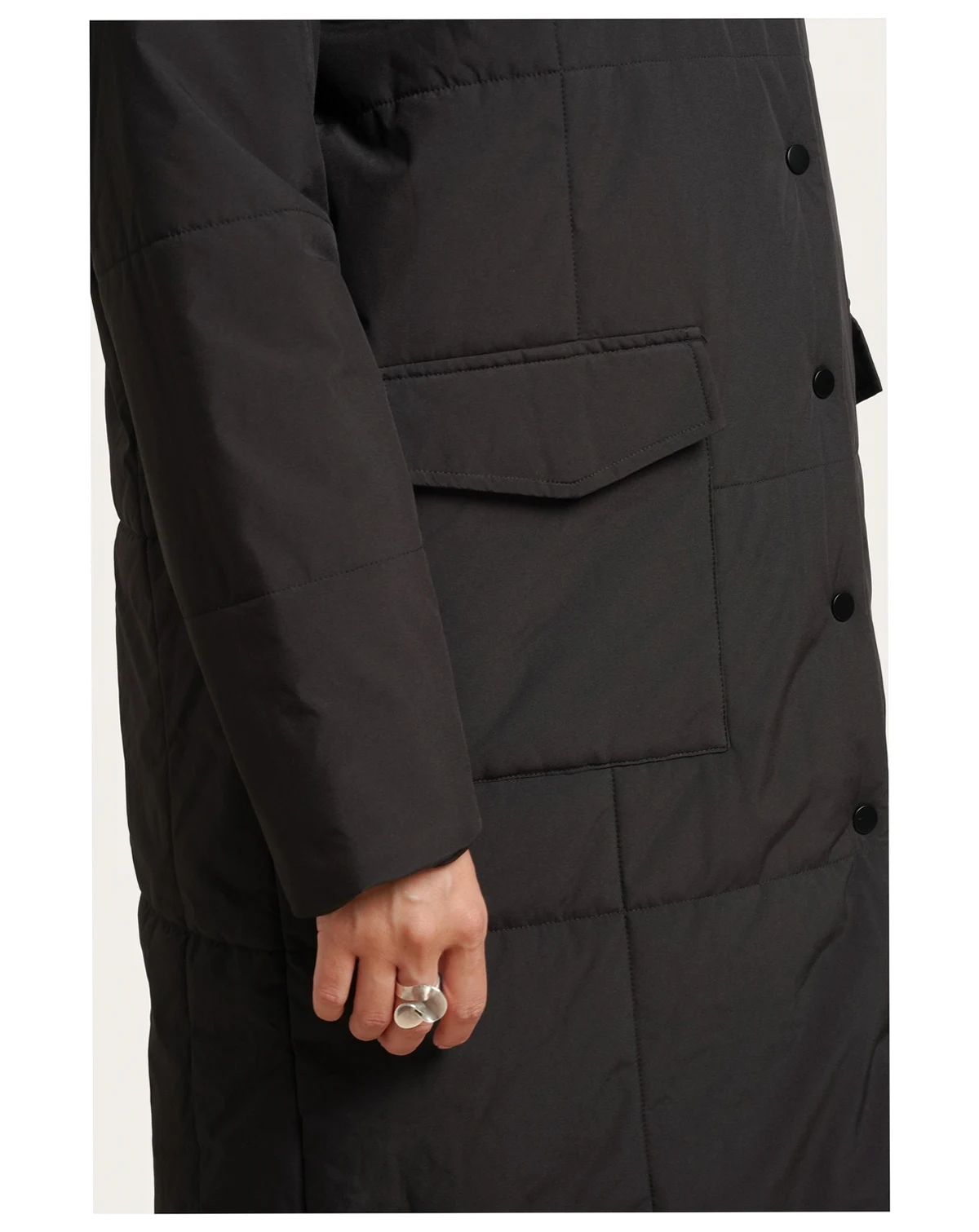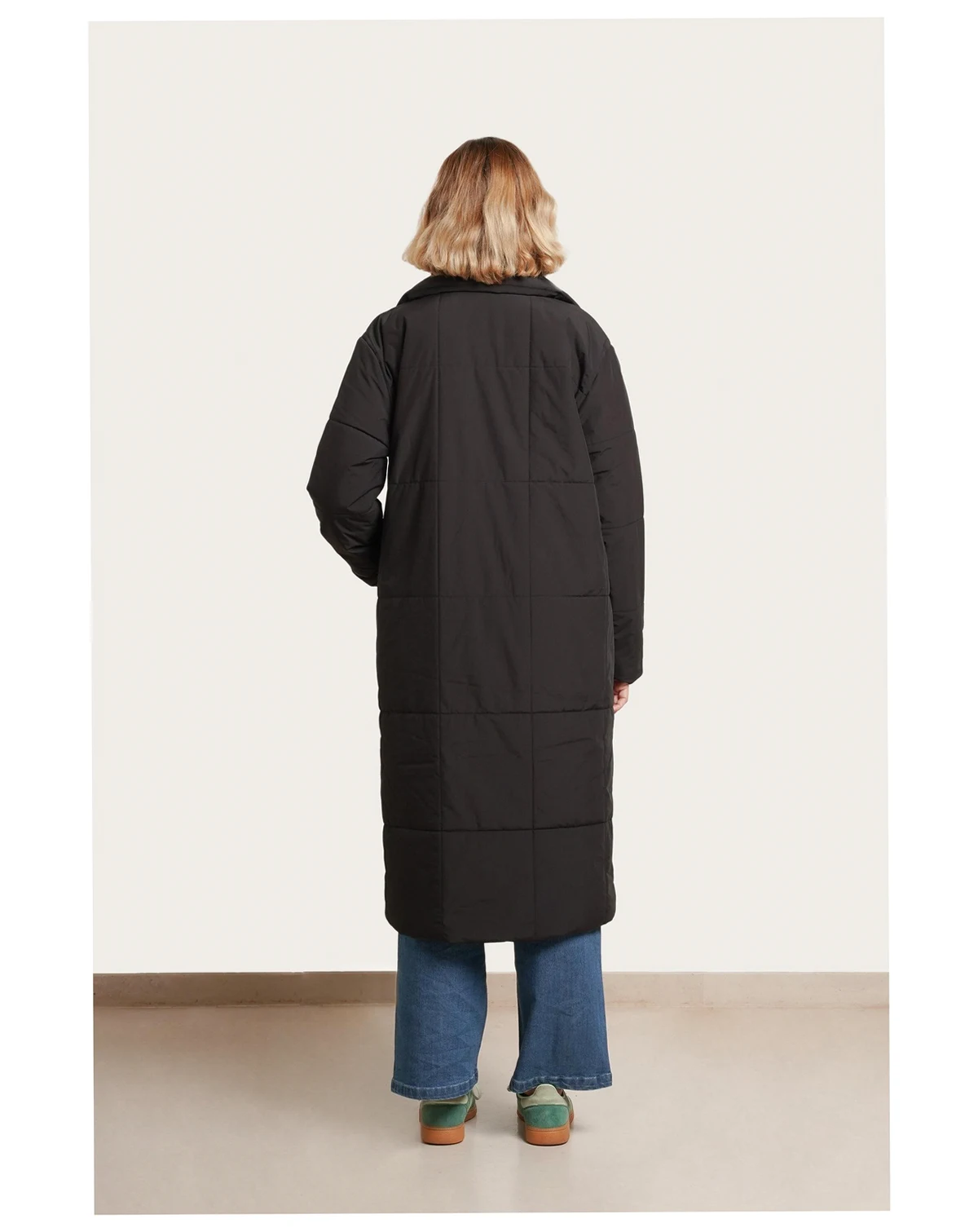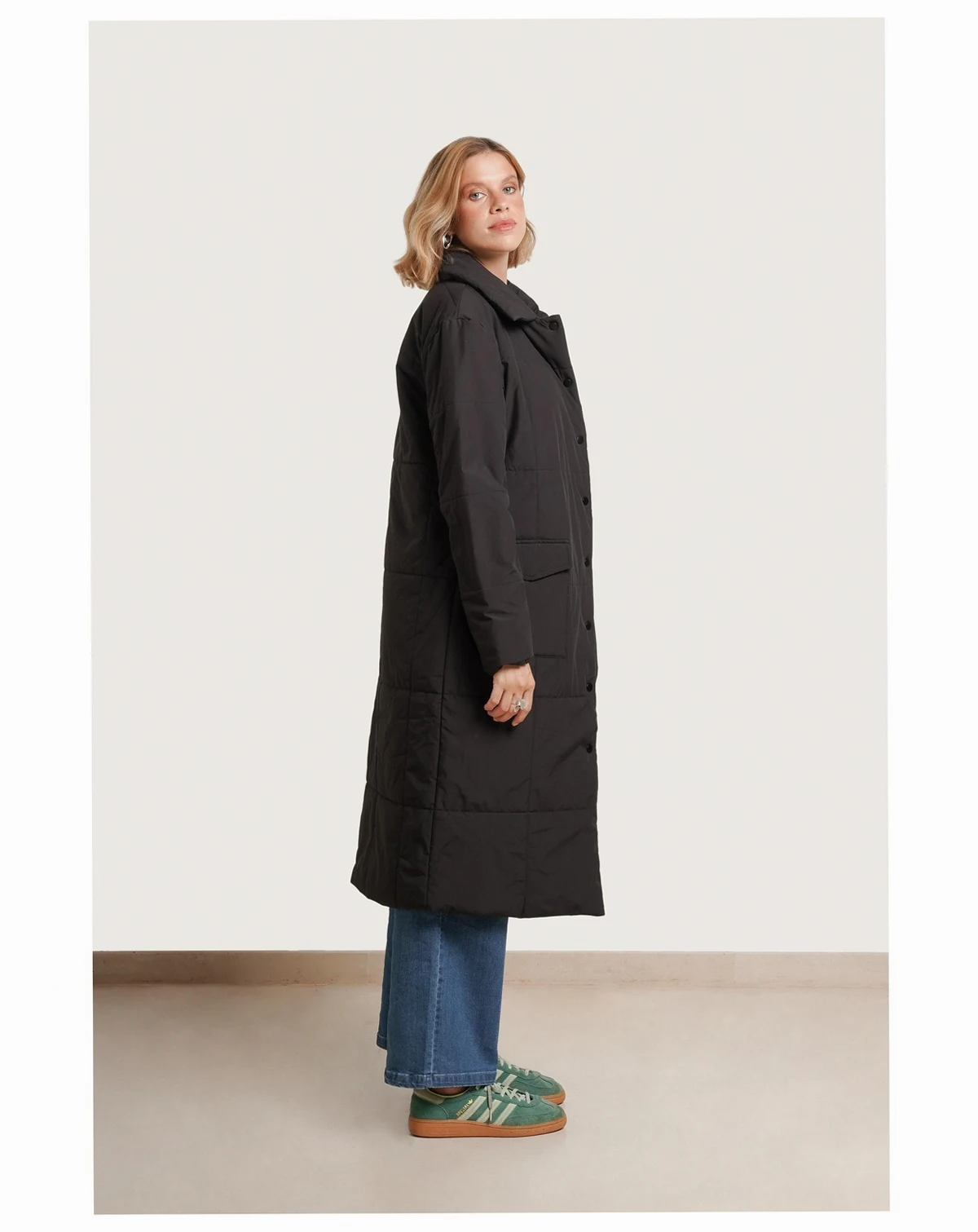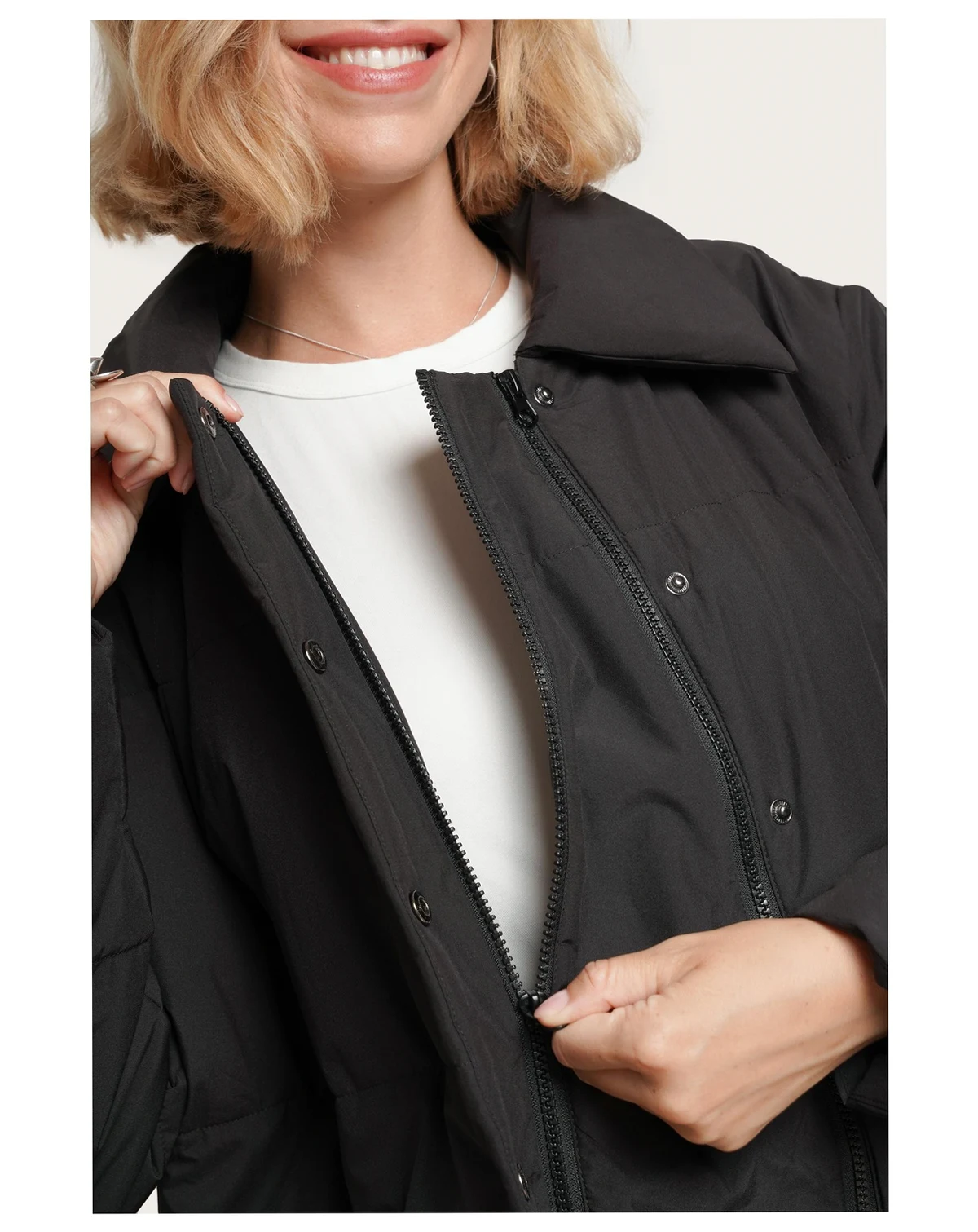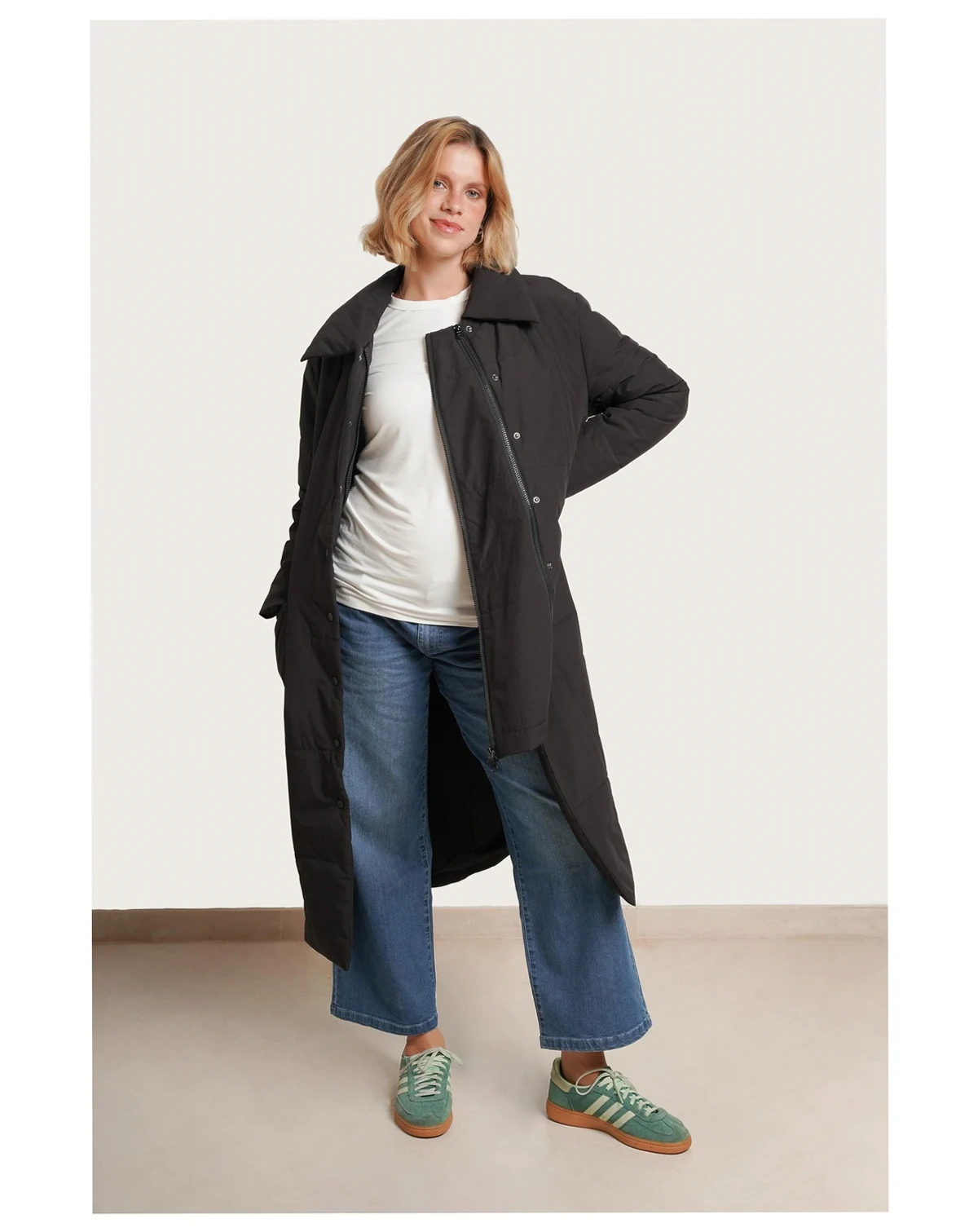 Your go-to for staying warm without the bulk. This slim-fit puffer hugs your curves (no puffy marshmallow vibes, we promise) and features a zip-in panel for your growing bump. Knee-length for extra coverage and in versatile black, it goes with everything. Flattering, comfortable, and perfect for those chilly days when you want to feel cozy without feeling weighed down.