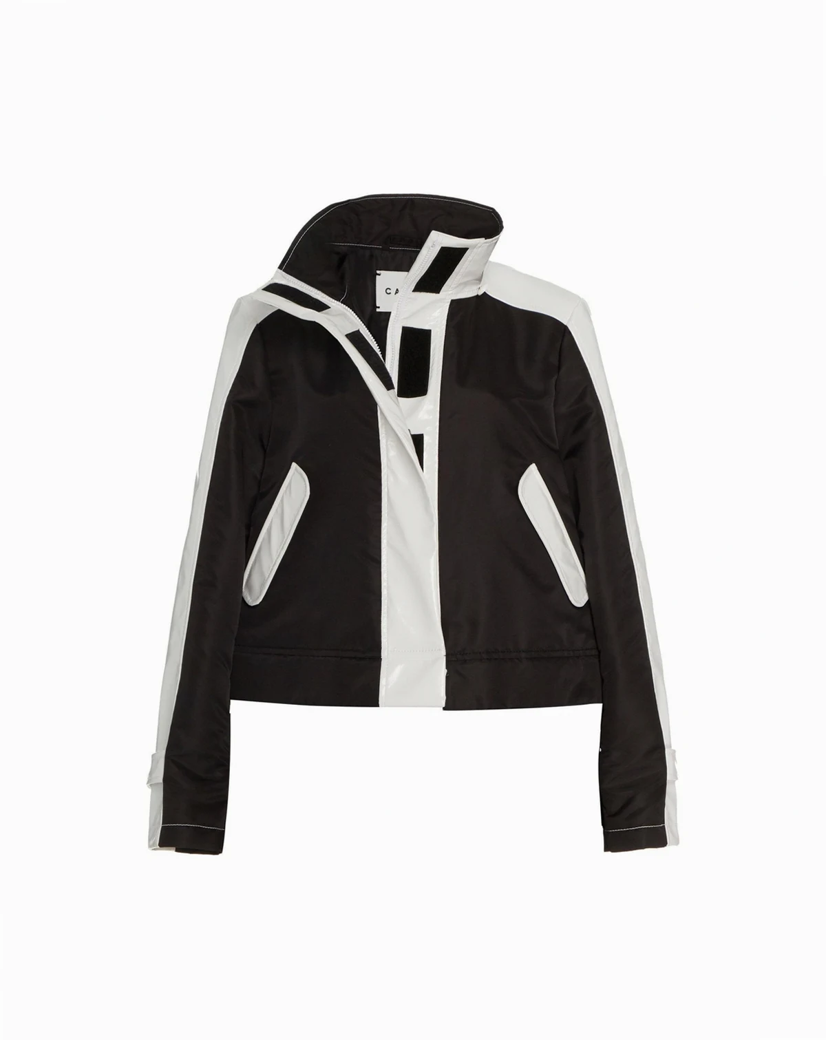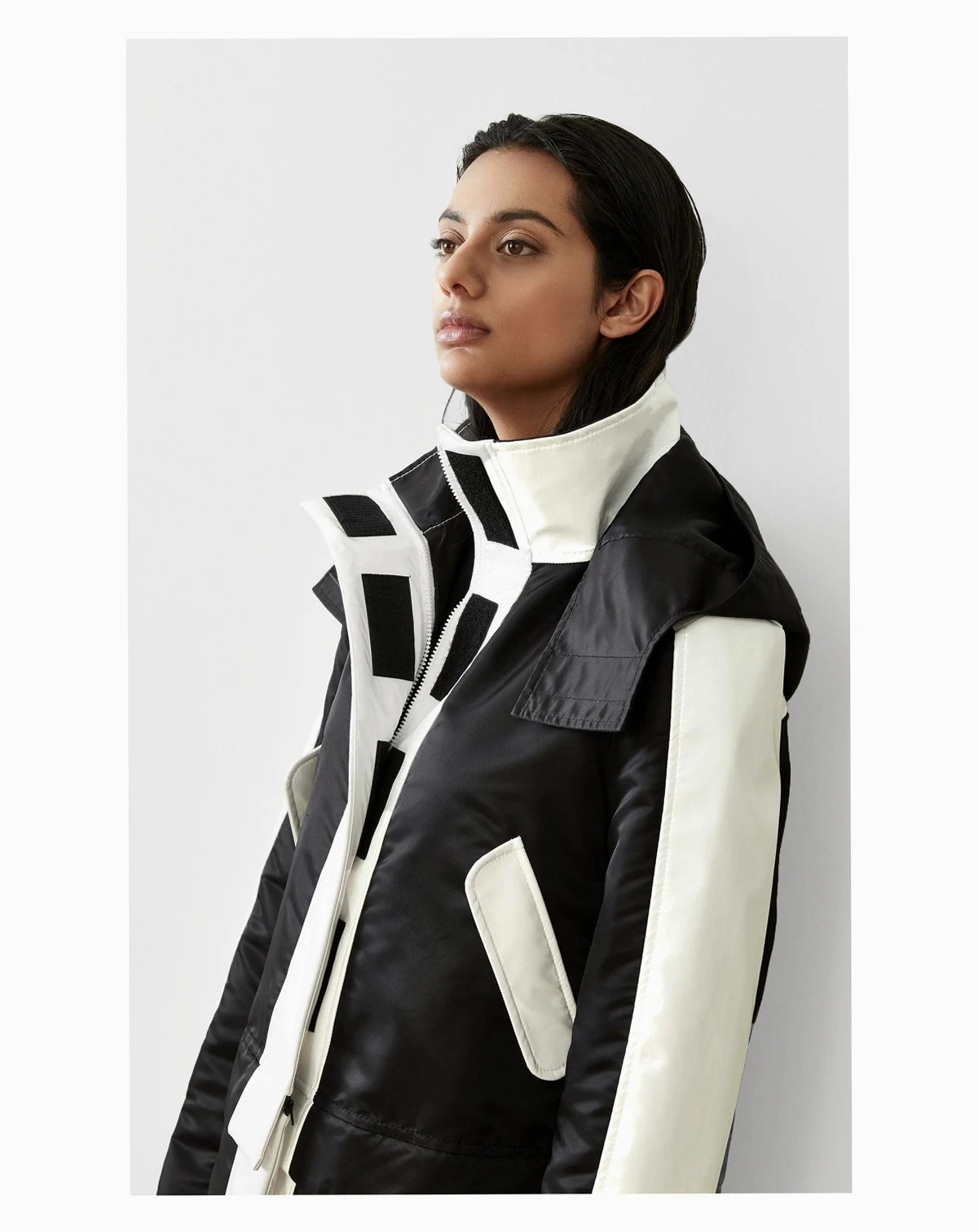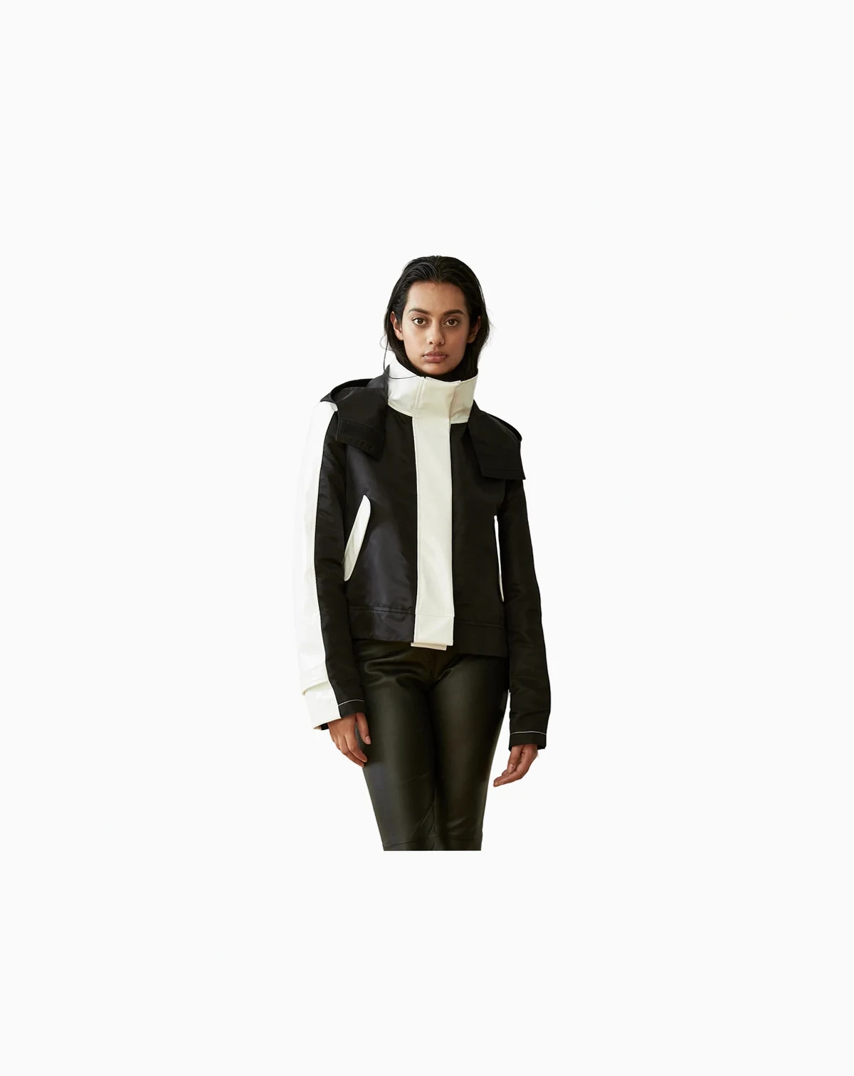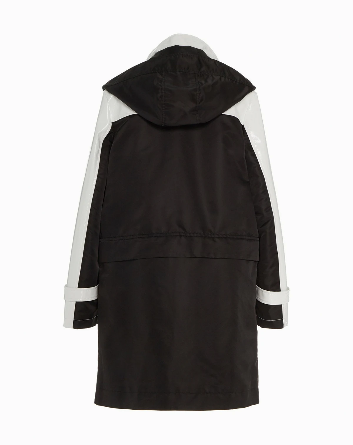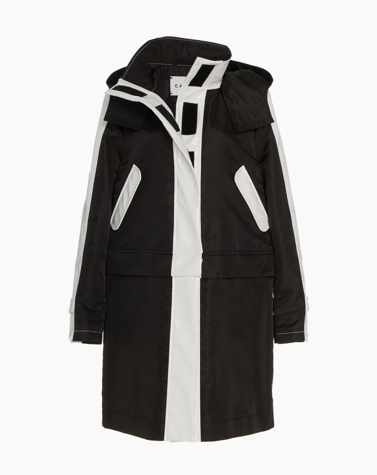 2 raincoats in 1! Made from water-resistant cotton gabardine, this CAALO raincoat has a removable hood and can be worn short, long, or half zipped. Ethically and sustainably produced in NY's Garment District.