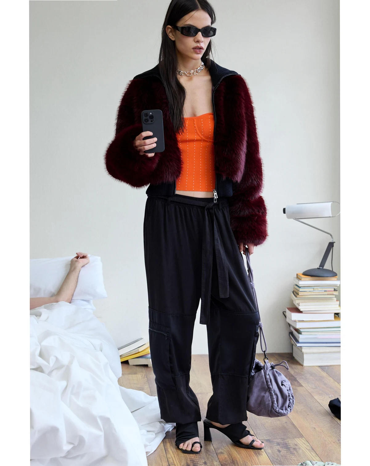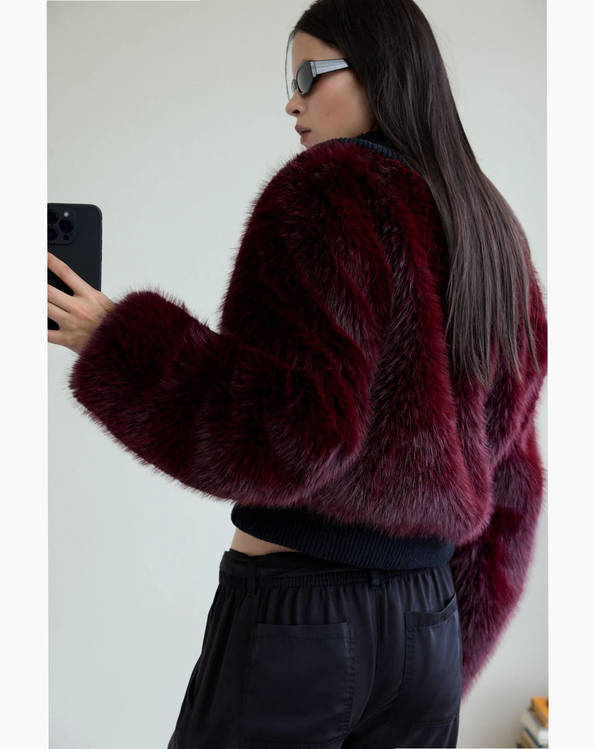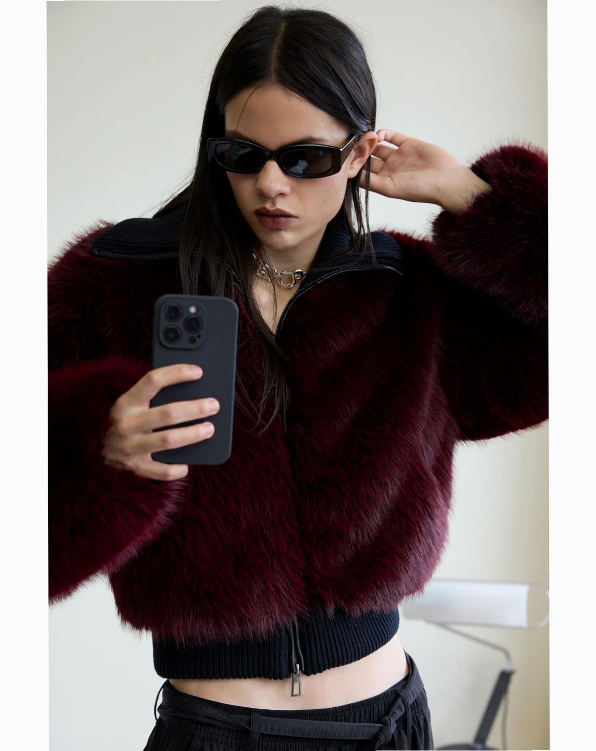 Short faux fur bomber jacket, knit collar, and zipper closure in raspberry color.