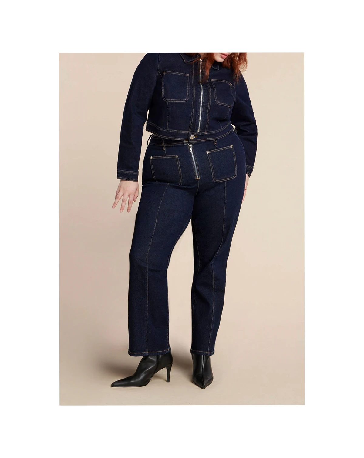 A sleek front zipper and cropped cut modernize this denim jacket. Its stretch-denim construction, contrast stitching, patch pockets, and sharp collar will bring a cool edge to every look.98% Cotton 2% Spandex. Close fit. Front zipper, shirt collar. Long fitted sleeve. Patch pockets. Crop length20" from highest point of shoulder on size 18Stretch comfort denim. Wash before wearing. Machine wash cold gentle cycle with like colors. Only non-chlorine bleach when needed. Tumble dry low. Cool iron as needed.