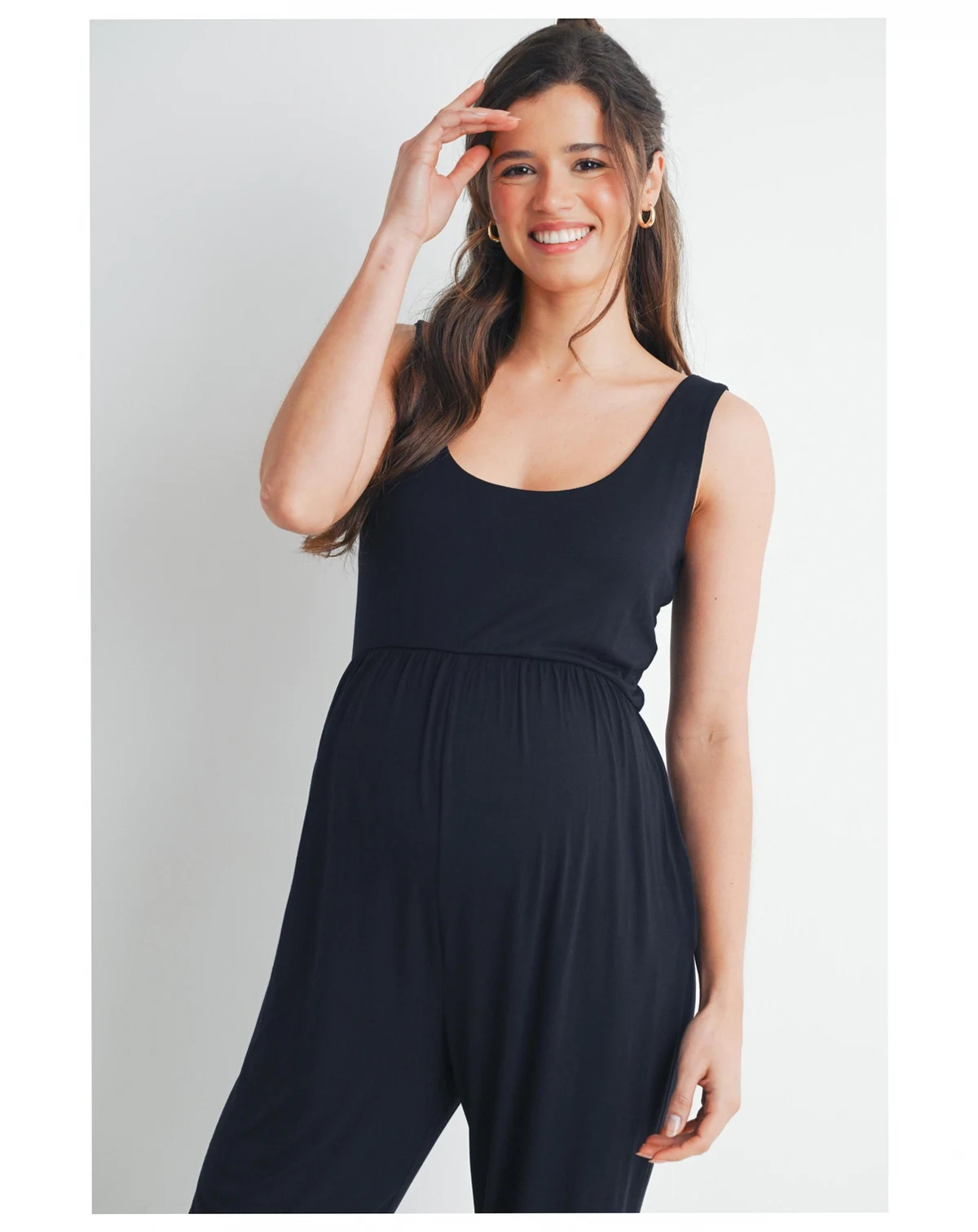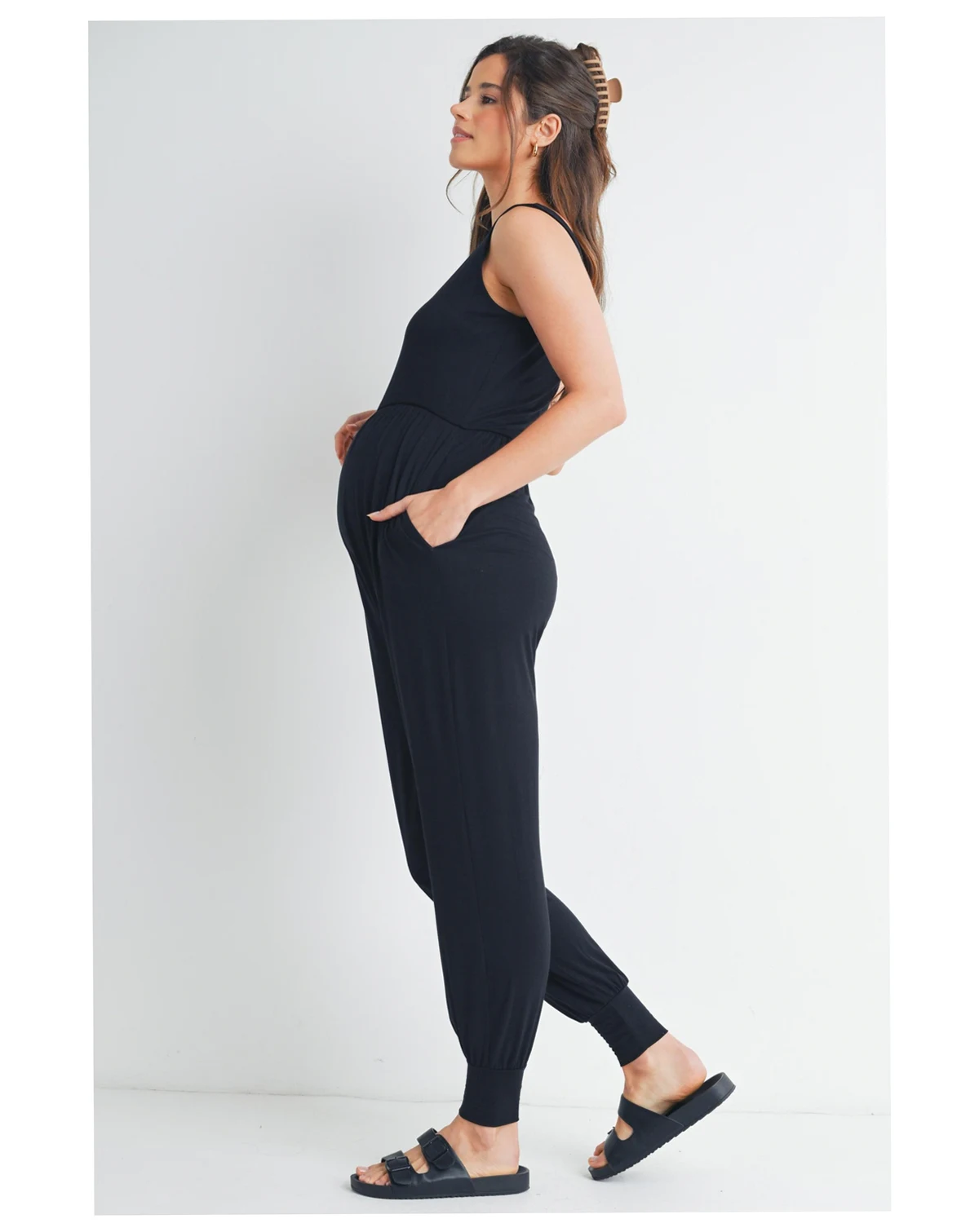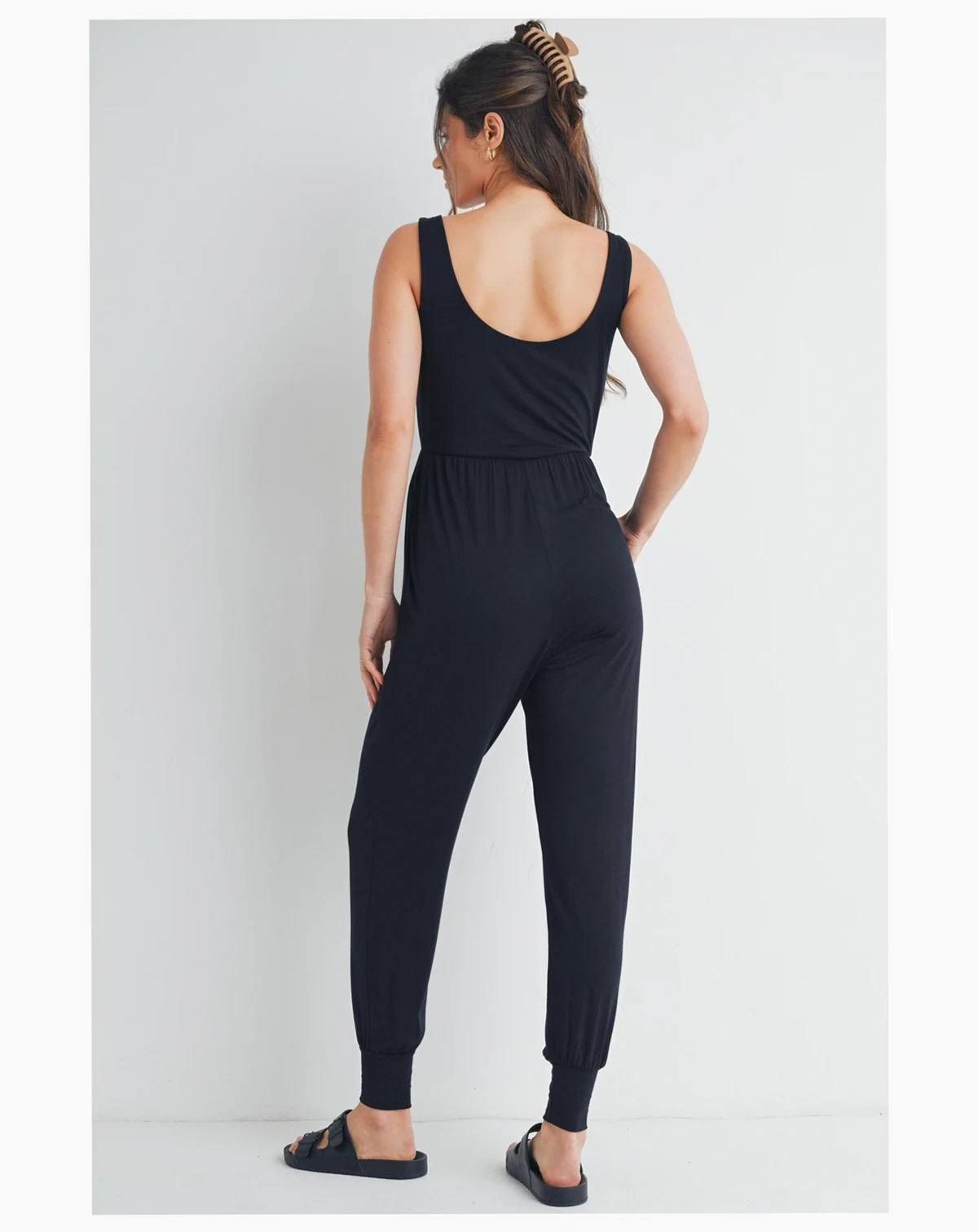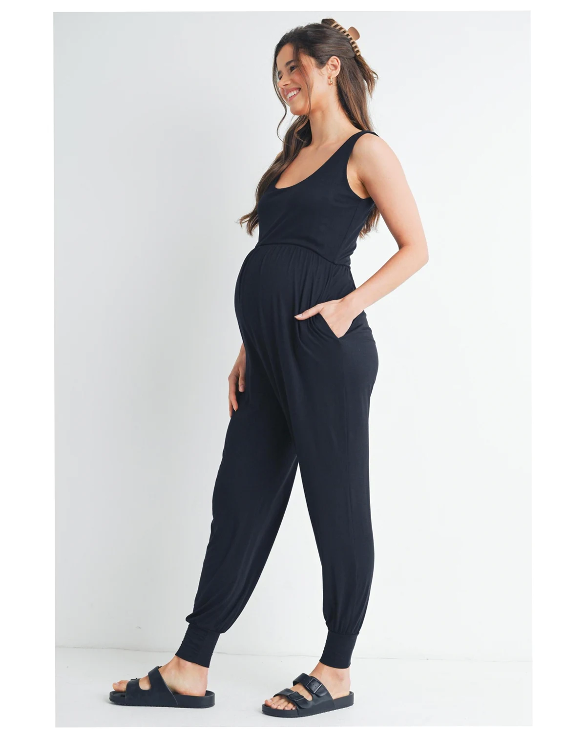 Meet your new everyday essential. This sleeveless maternity jumpsuit is designed to keep up with you through every stage of pregnancy and beyond. The relaxed silhouette features a roomy, bump-friendly waist and tapered legs with cuffed ankles for a polished yet laid-back look. Thoughtful details like functional side pockets and a scoop neckline make this one-piece as practical as it is stylish.