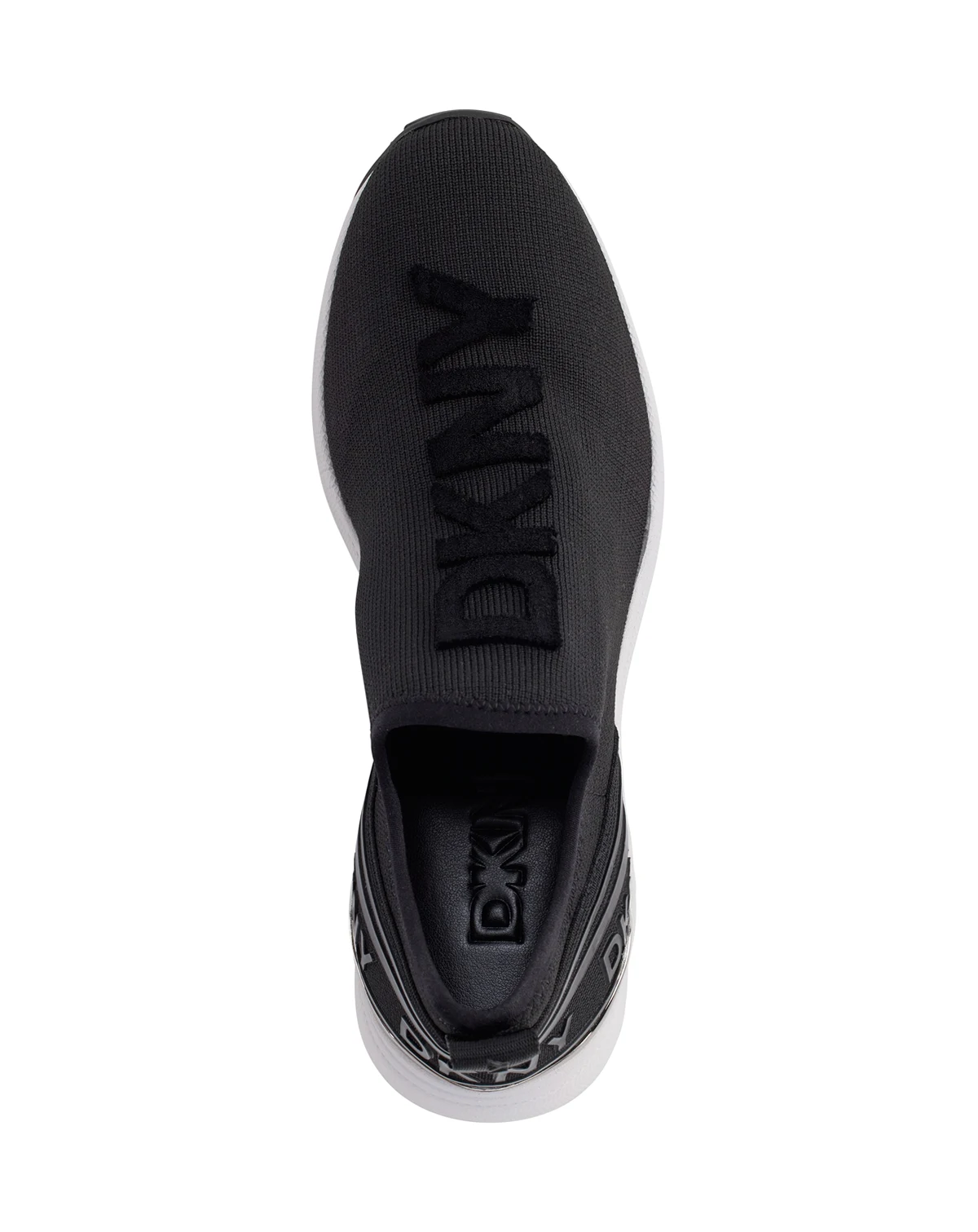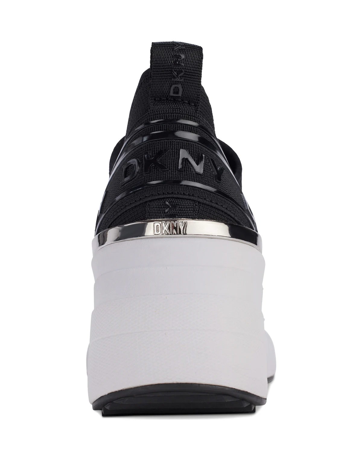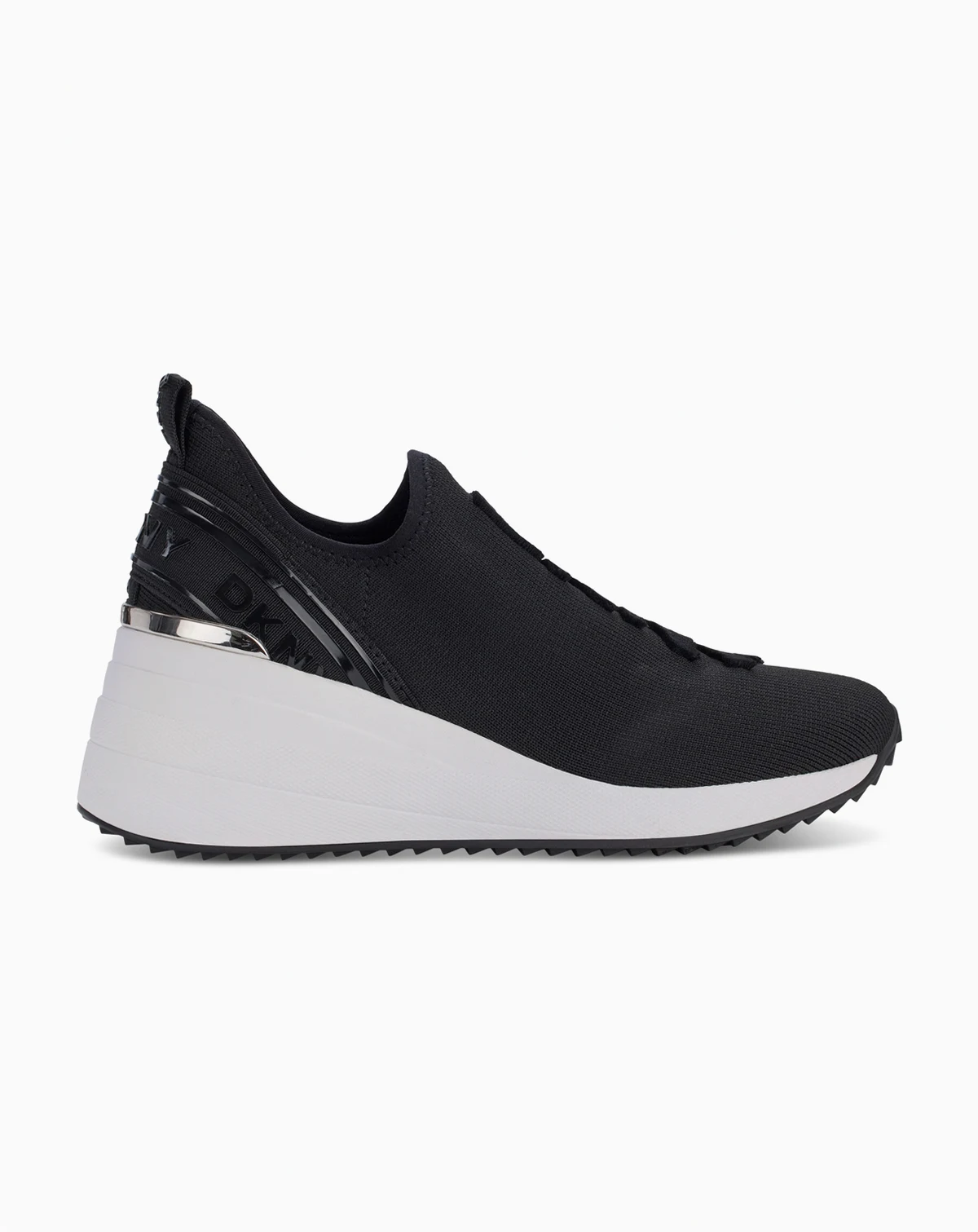 DKN Women's tonal logo details add a touch of signature sophistication to a sporty slip-on knit sneaker lifted by a contrasting wedge heel.