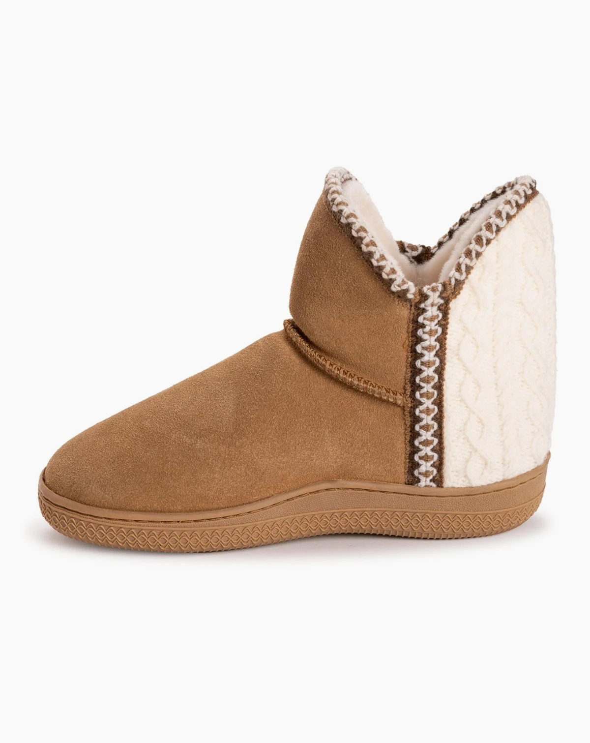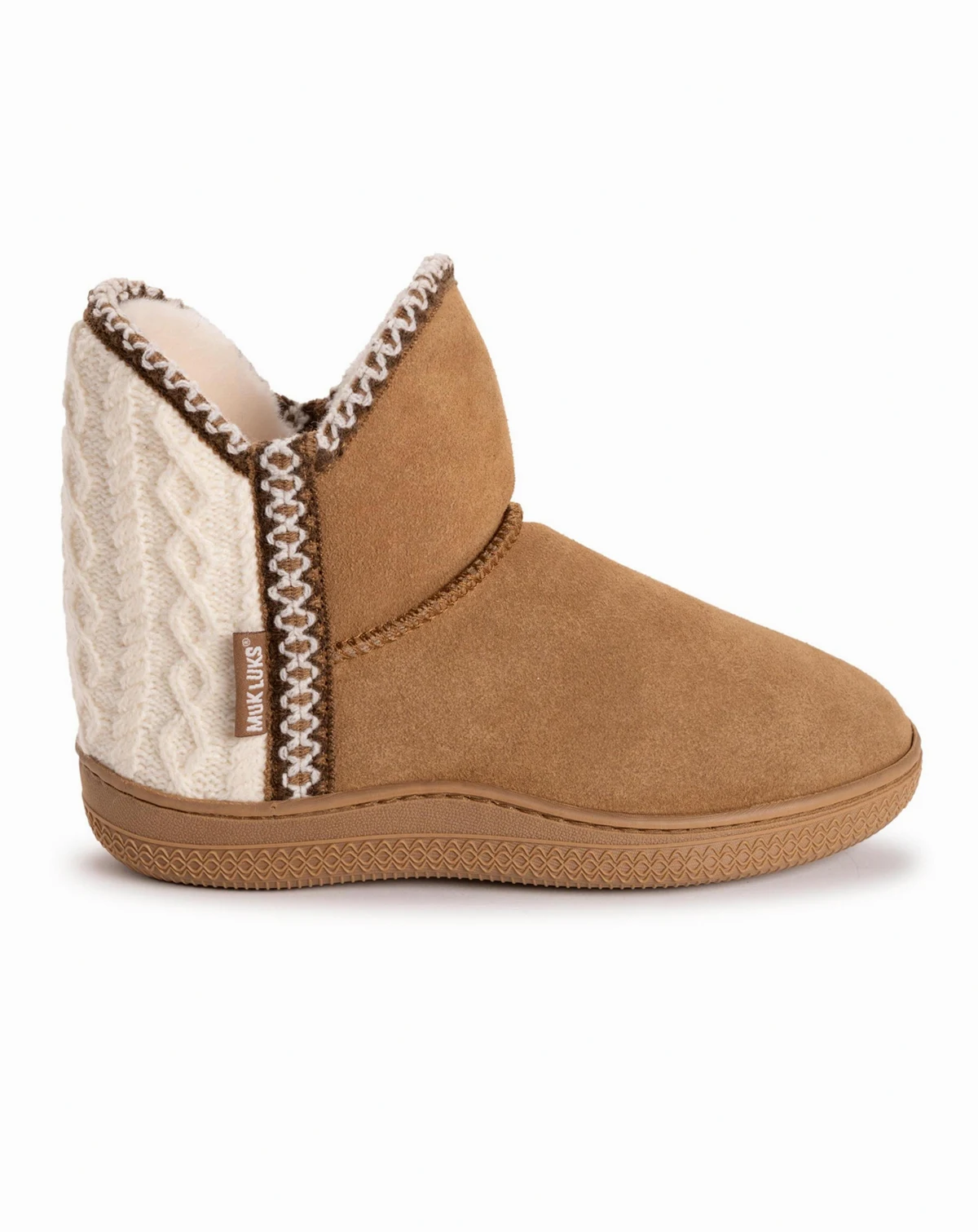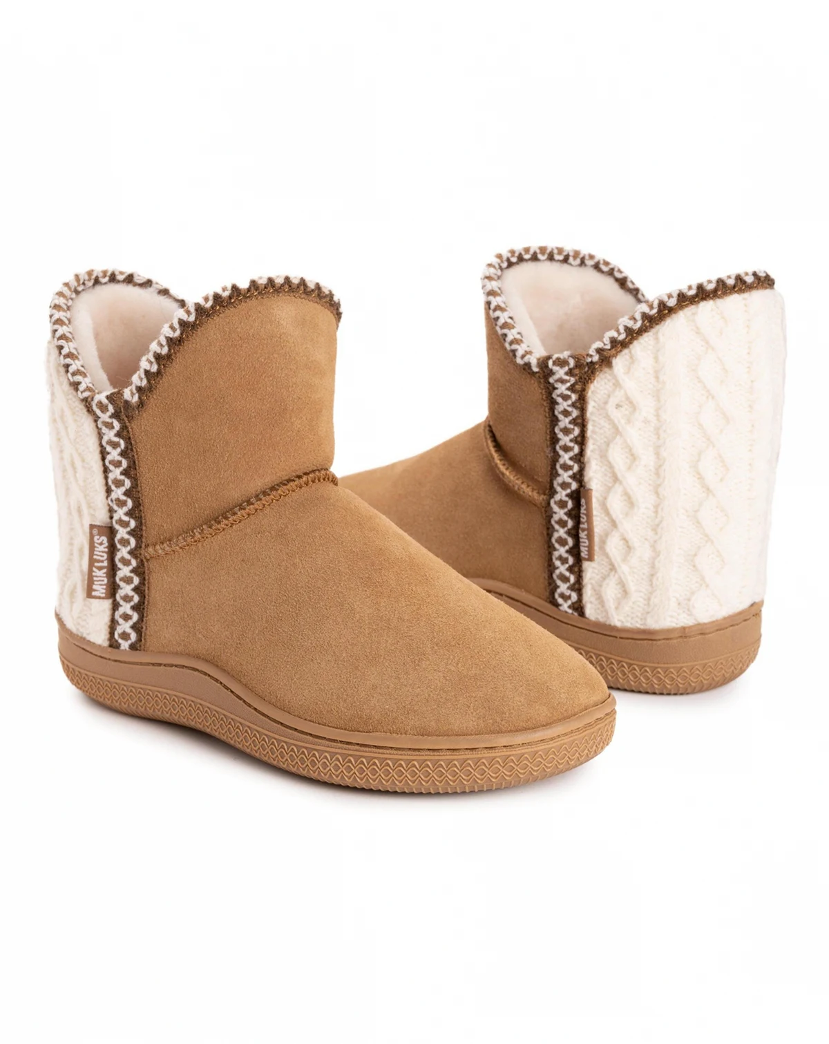 MUK LUKS Amira Paige slipper will be your new must-have for those days you want to be extra cozy. These taupe beauties feature a plush sherpa lining and knit detailing that is perfect for fall and winter. With a non-slip b ottom and soft suede construction, they're perfect for both indoor/outdoor use. Slip into comfort with the amira paige slipper- becuase your feet deserve nothing but the best