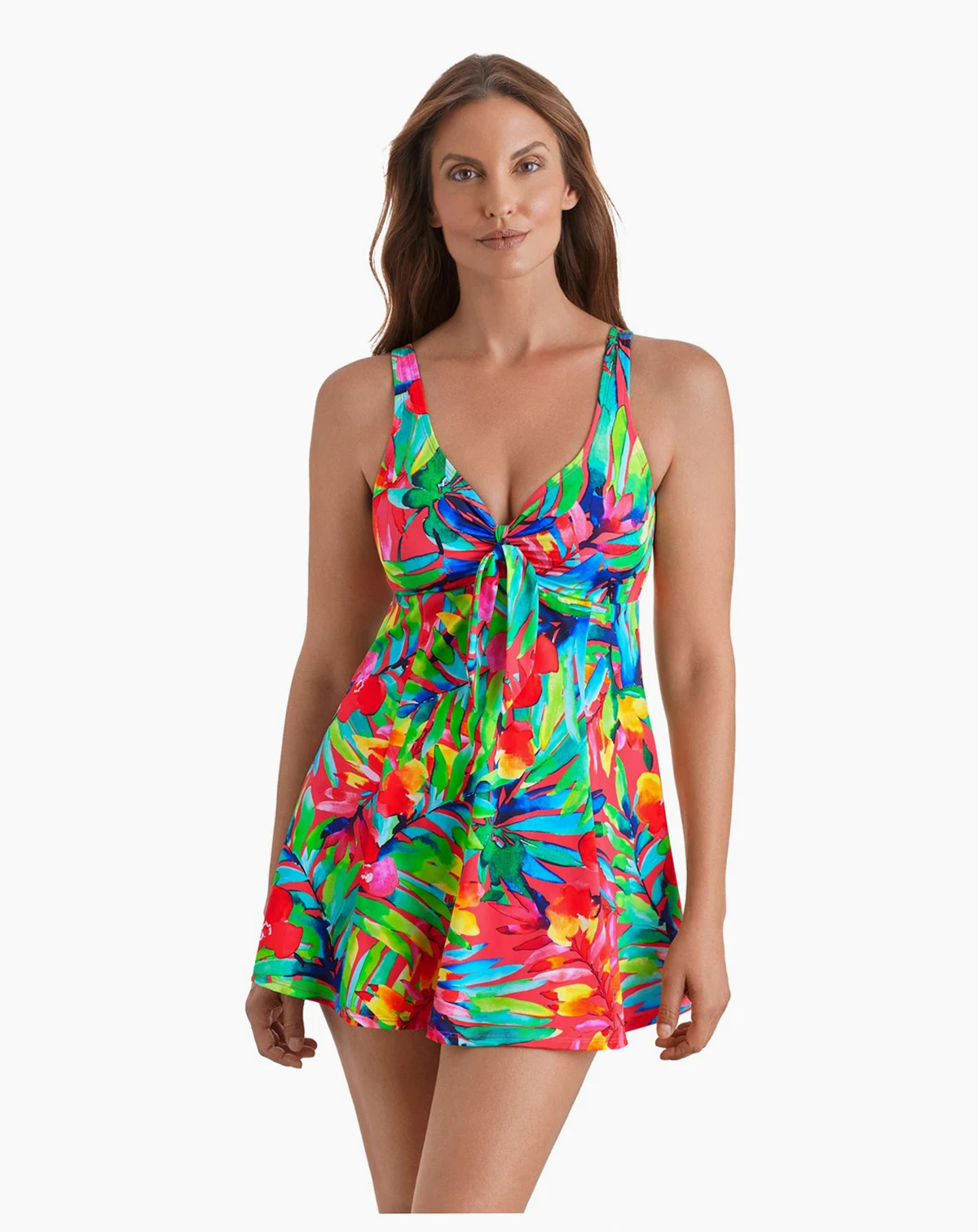 Make a splash in this colorful bow front swimdress from ShapeSolver Sport by Mimi Flamingo. Featuring adjustable straps and sewn-in soft cups for gentle shaping, it provides full coverage and a comfortable fit. The power mesh shelf bra adds support, while the vibrant allover print brings a lively, confident touch to your beach or poolside look.