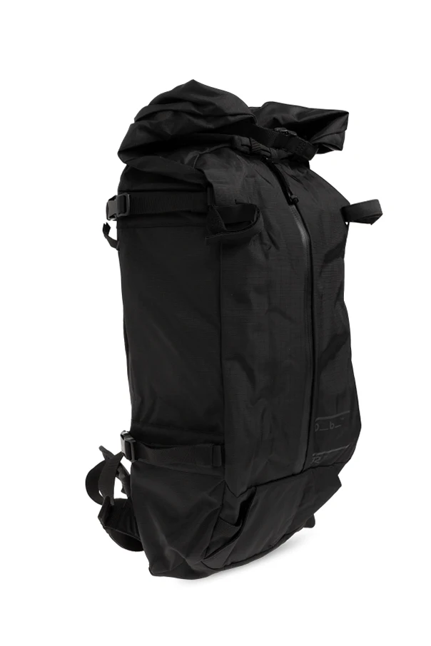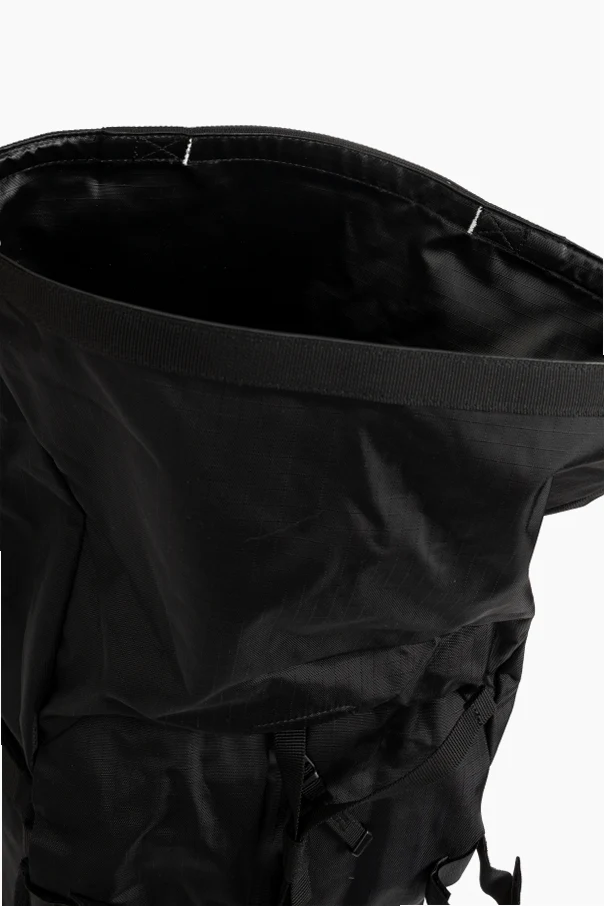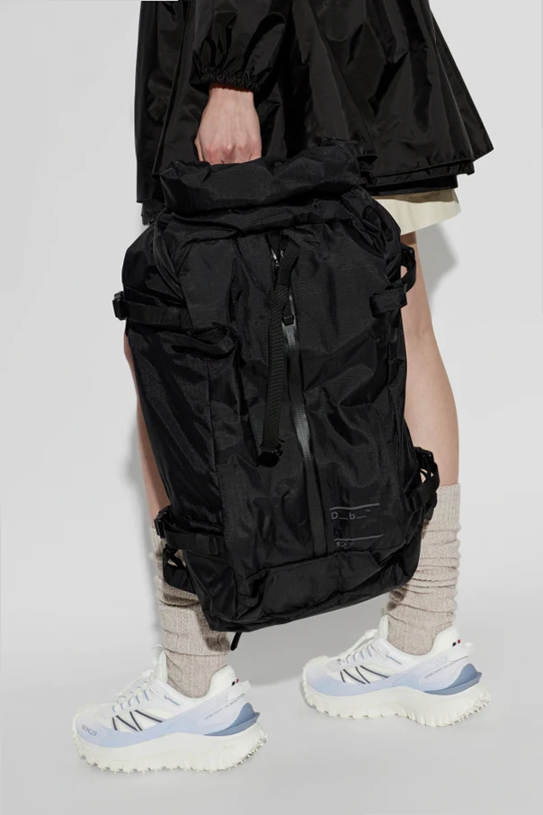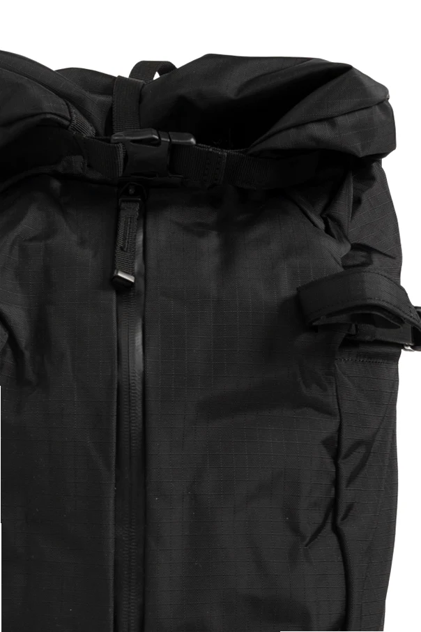 Presented in a sophisticated, unified black palette, the minimalist elegance is further elevated by a water-resistant zipper that runs centrally along the vertical profile, merging form and function. The innovative roll-top closure with a signature clasp and adjustable side compression straps provide effortless volume management and interior stability, making this backpack equally suited for urban sophistication and outdoor adventures. A discreet designer emblem completes its understated prestige.