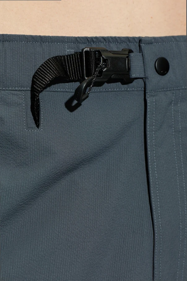 Crafted from a premium synthetic material with a water-repellent, quick-drying finish, the fabric’s subtle texture and smooth hand-feel speak to exceptional quality. The thoughtfully minimal design is punctuated by a discreet logo on the thigh, while practical elements include two slanted front pockets, two flap back pockets, and a secure dual-closure system—a classic button complemented by a technical belt with a modern buckle.