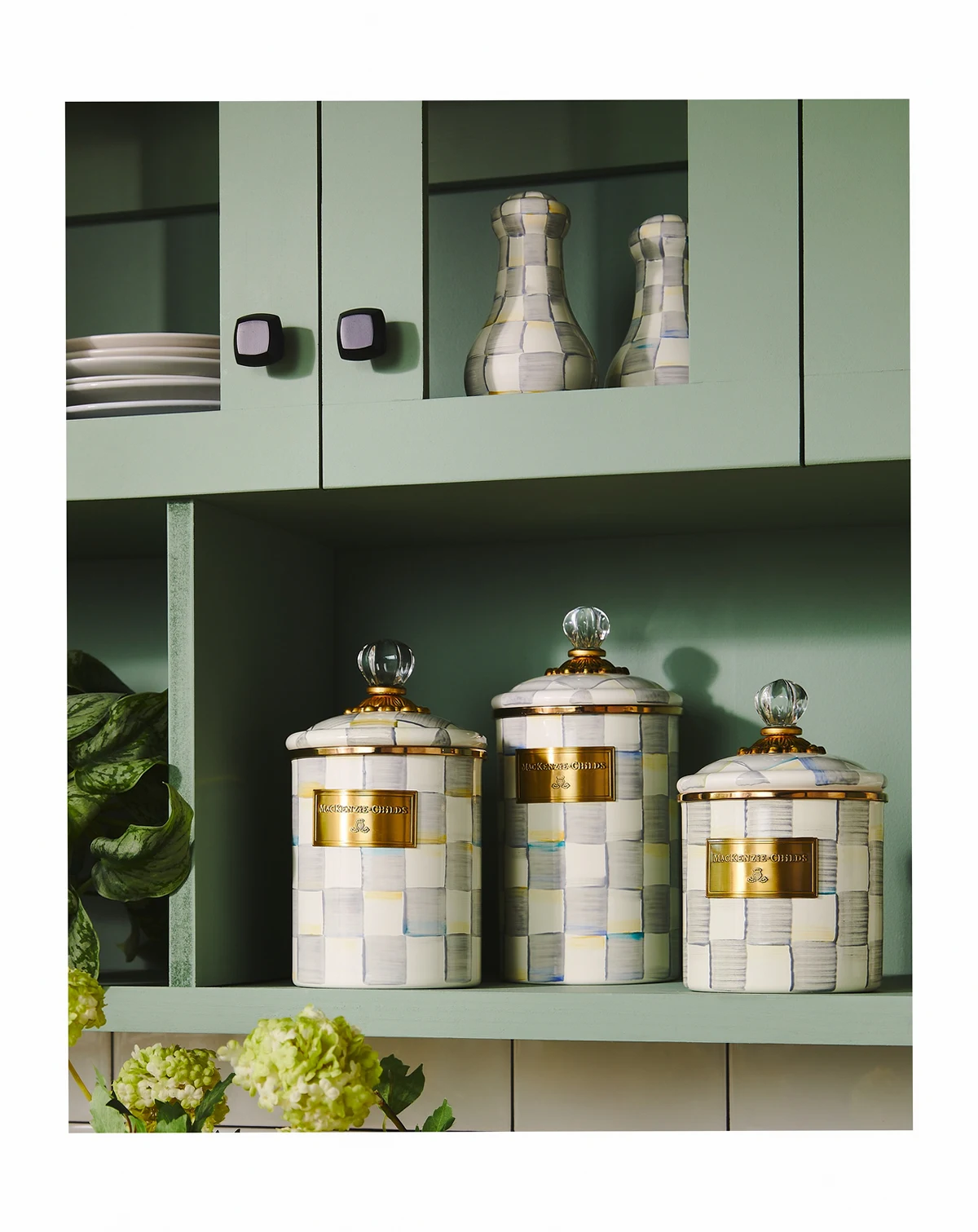 From pantry staples to cotton puffs, this small canister from Mackenzie-Childs is in sleek enameled steel with hand-painted Sterling Checks that make the practical stylish.