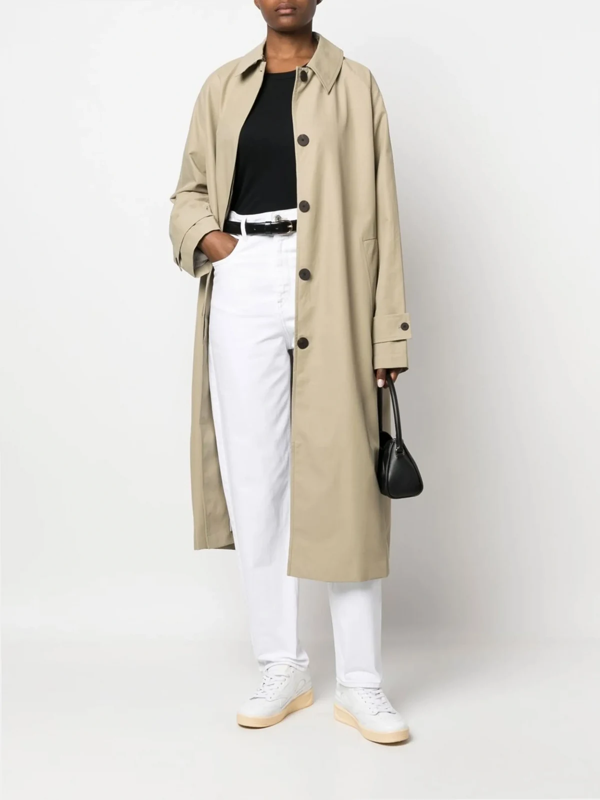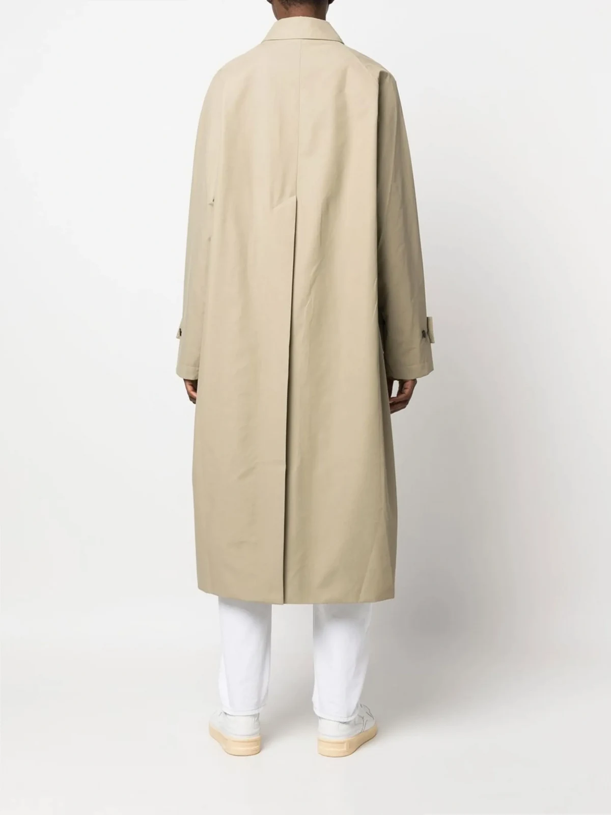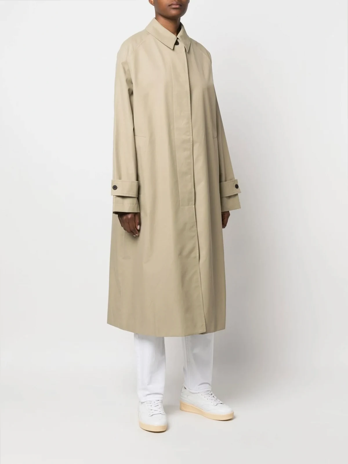 tan brown cotton blend water-repellent finish straight-point collar adjustable neck strap concealed front button fastening long raglan sleeves belted cuffs central rear vent full lining