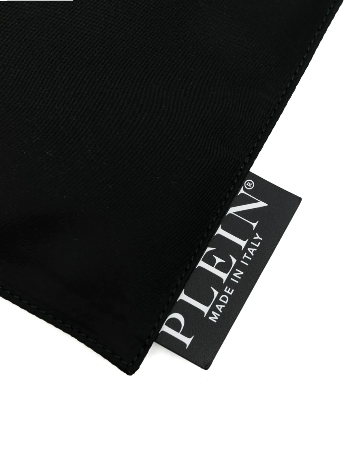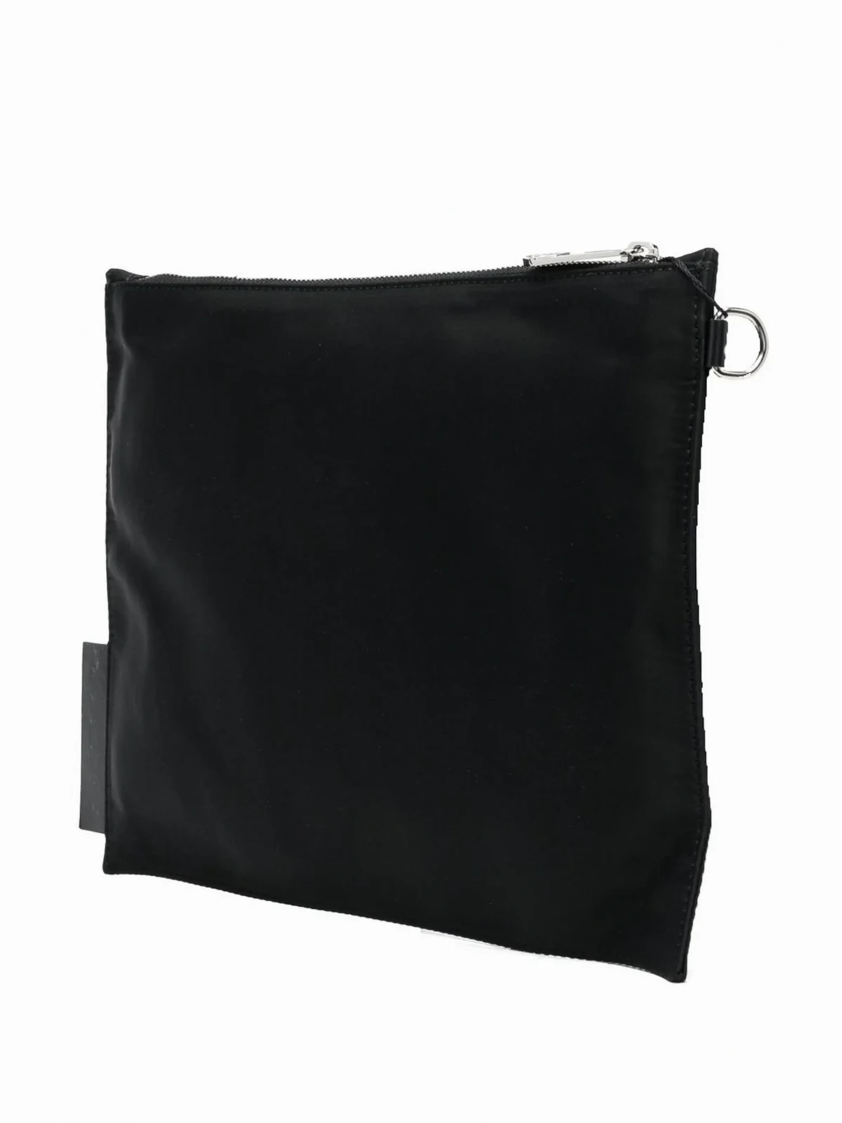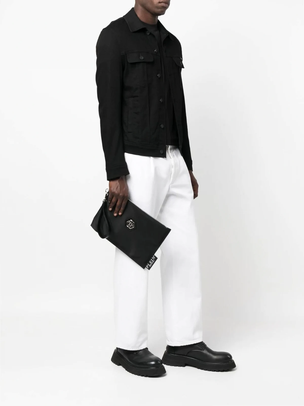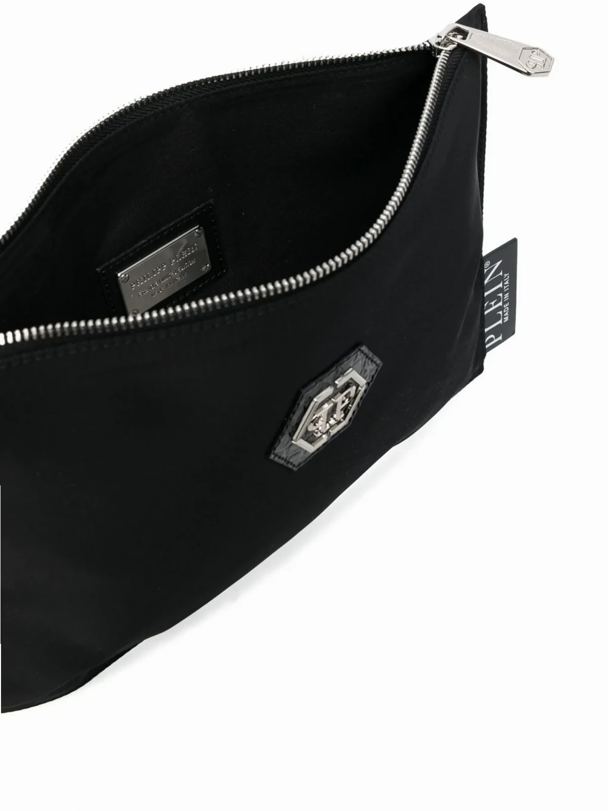 logo-plaque zip-up clutch bag from PHILIPP PLEIN featuring jet black, cotton blend, logo plaque, top zip fastening, wrist strap and main compartment.