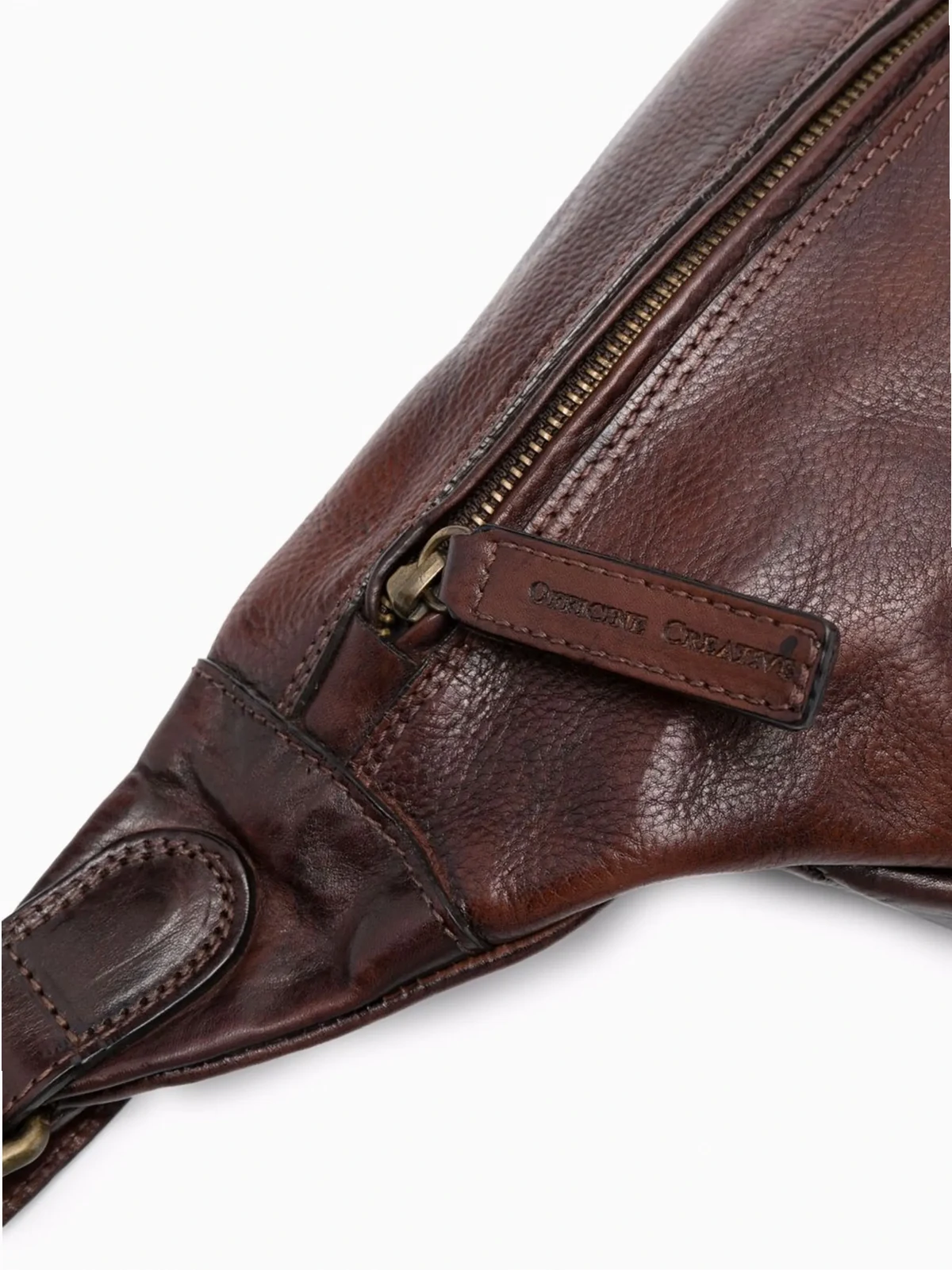 brown calf leather adjustable waist strap top zip fastening internal zip pocket