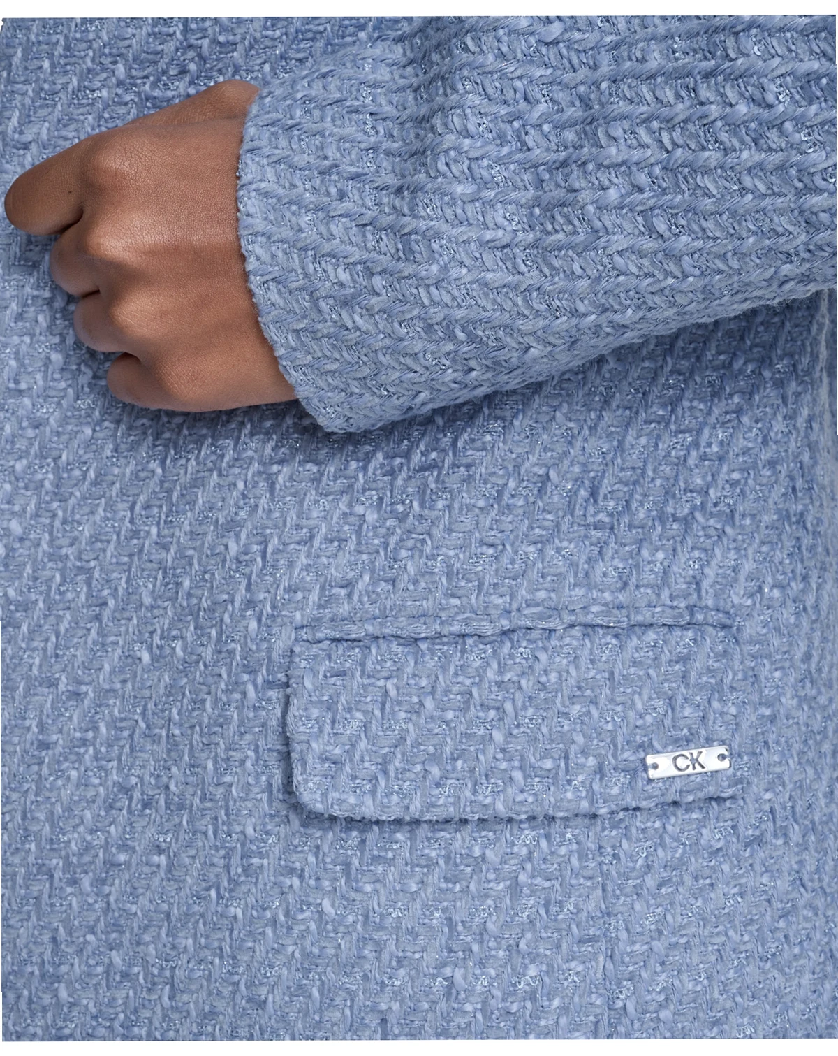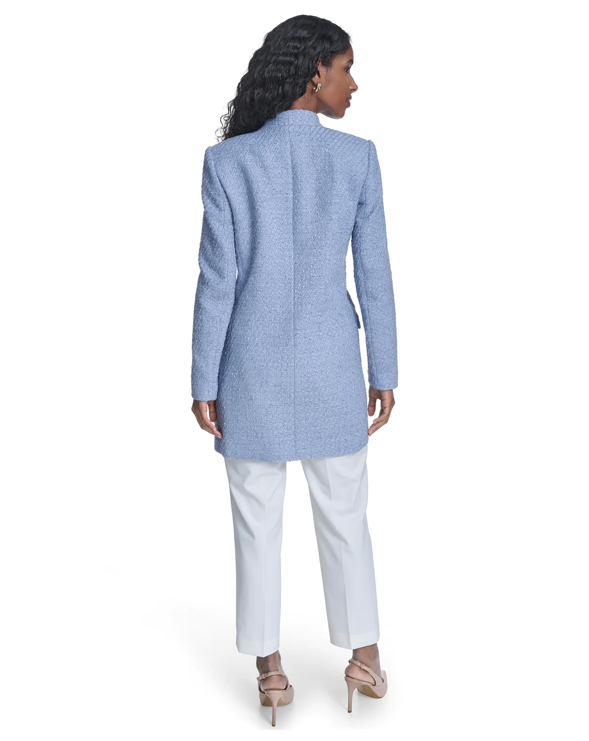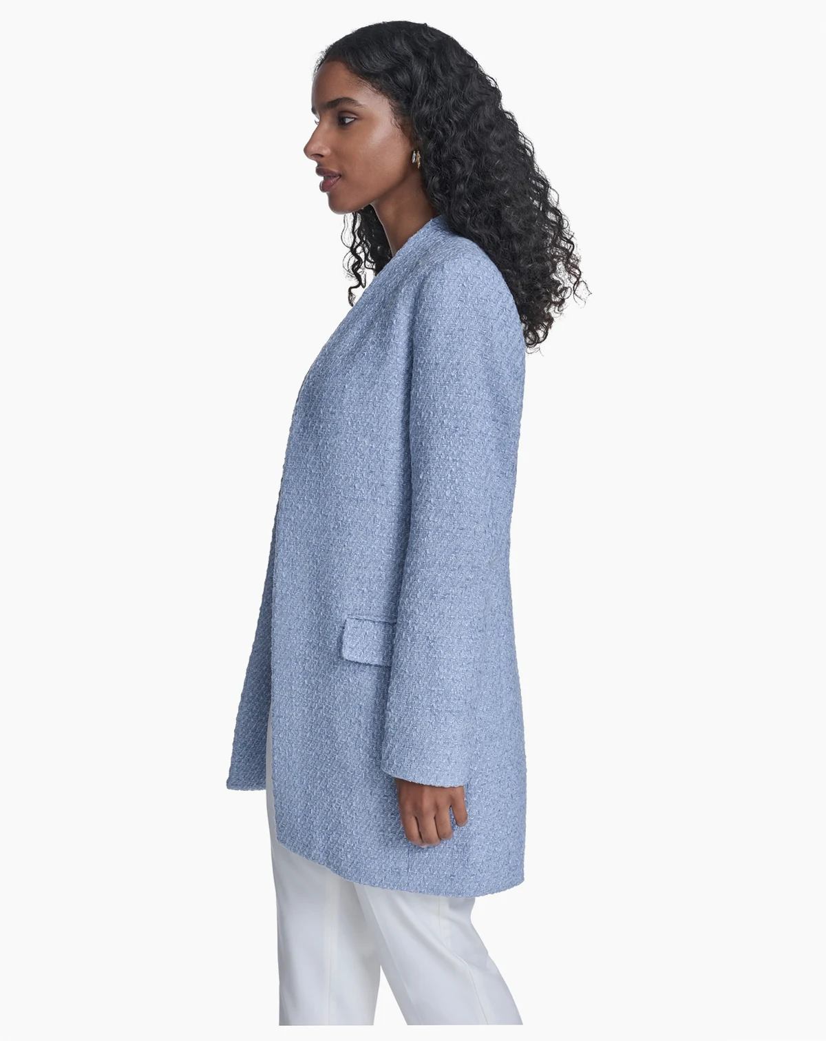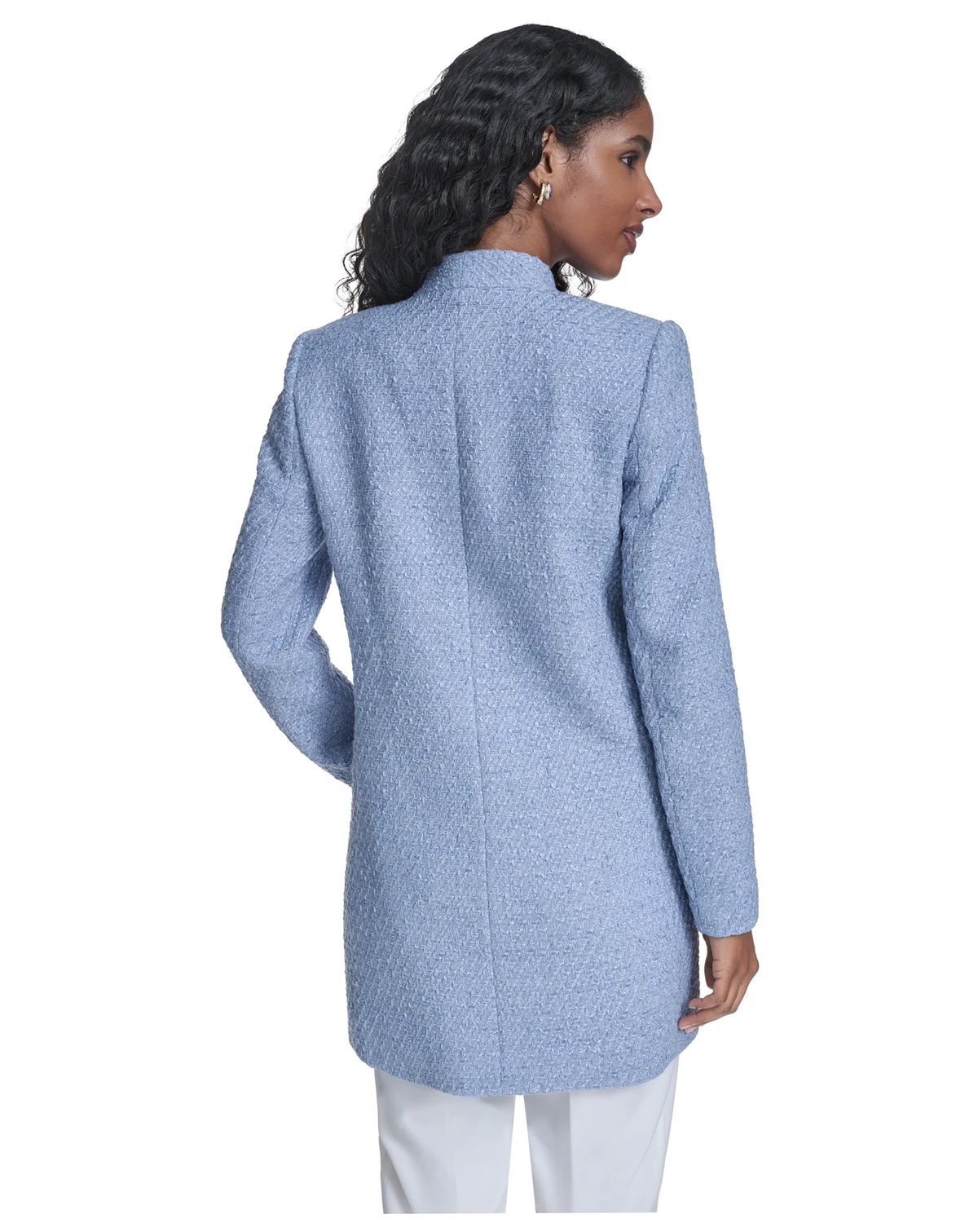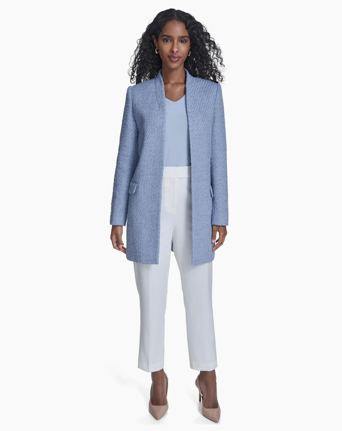 Layer with sophisticated style in this long open-front blazer from Calvin Klein, featuring a collarless neckline. Shoulder padding creates a modern and structured silhouette, while two front waist pockets add a practical and polished detail.