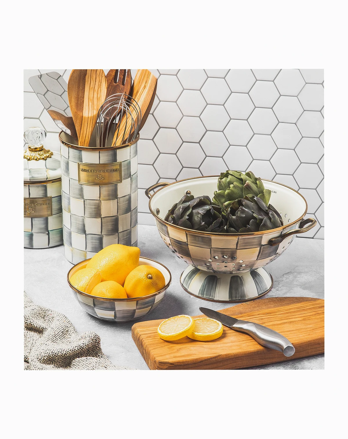 Extra-tall for easy access, this Mackenzie-Childs utensil holder features hand-painted Sterling Checks that add a signature accent to your kitchen.