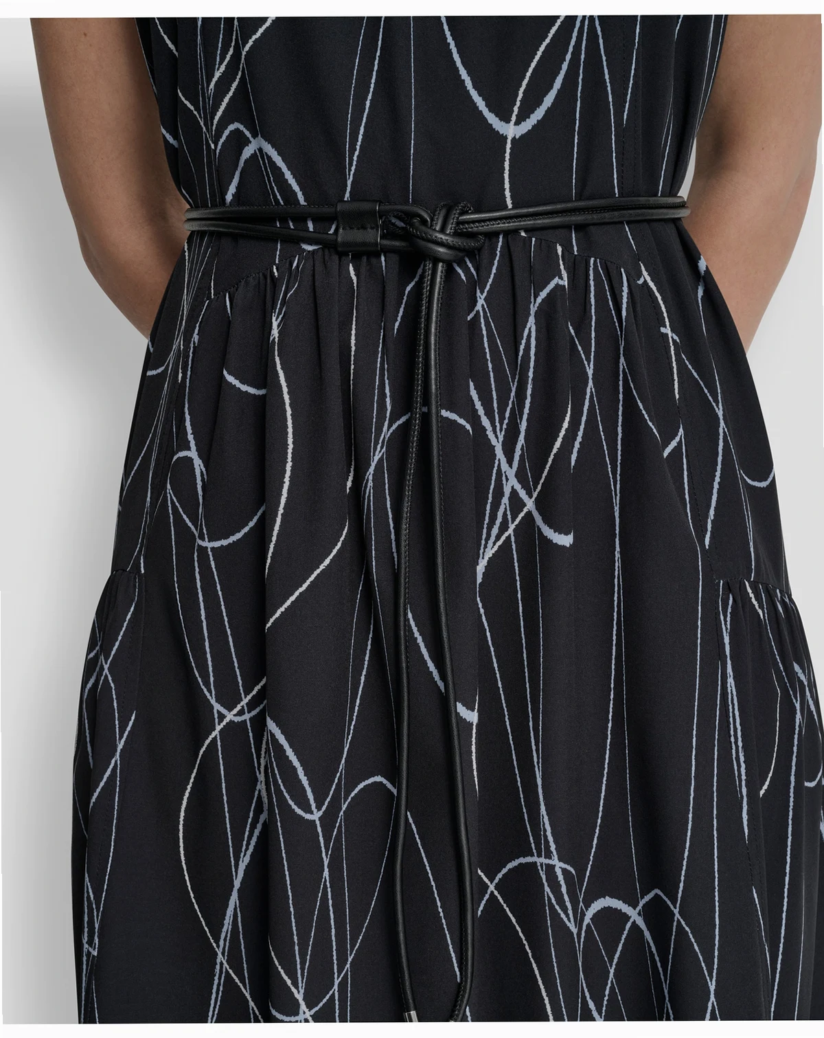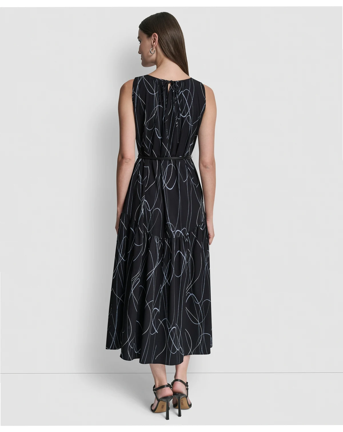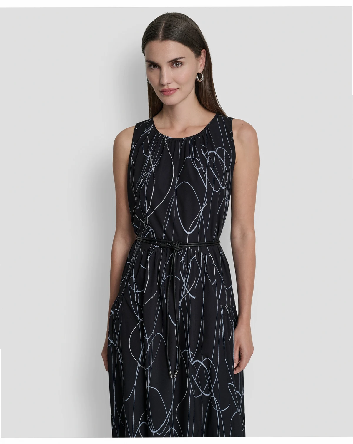 Turn heads in this DKNY midi dress with a jewel neckline and distinctive drop waist. A removable belt and drawstring back allow for a personalized, polished fit.