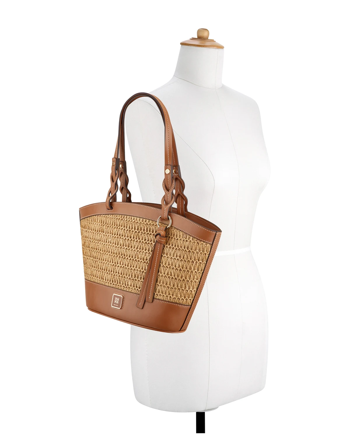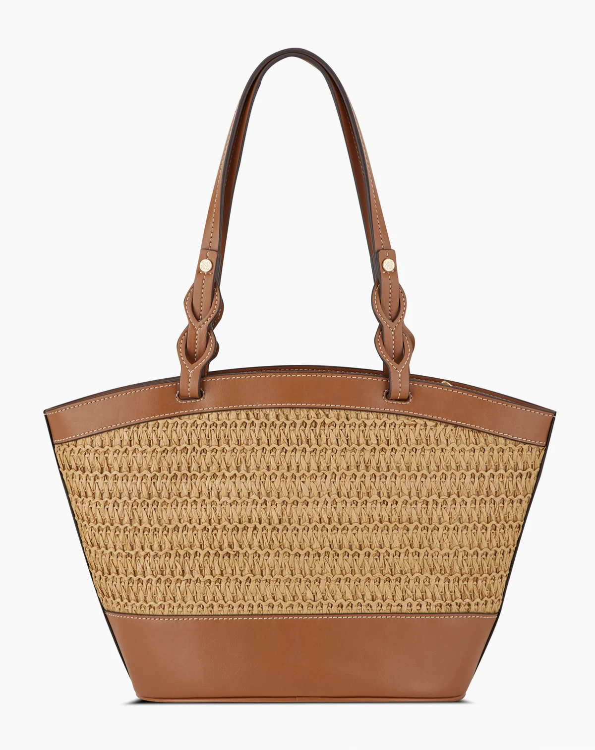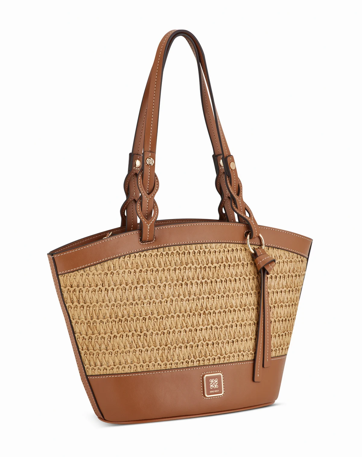 Nine West designer Nefi tote shopper bag in luxe raffia material which elevates your spring and summer outfit along with it's braided strap details and hardware branding. Internal organization and full zipper closure