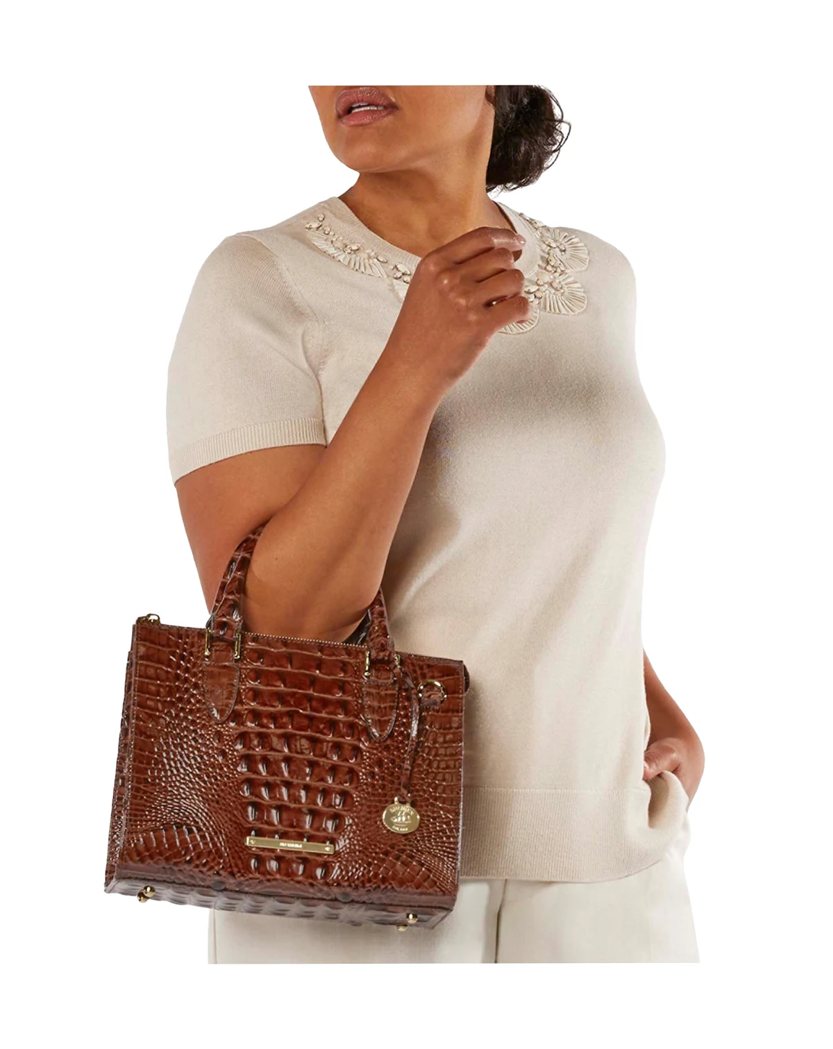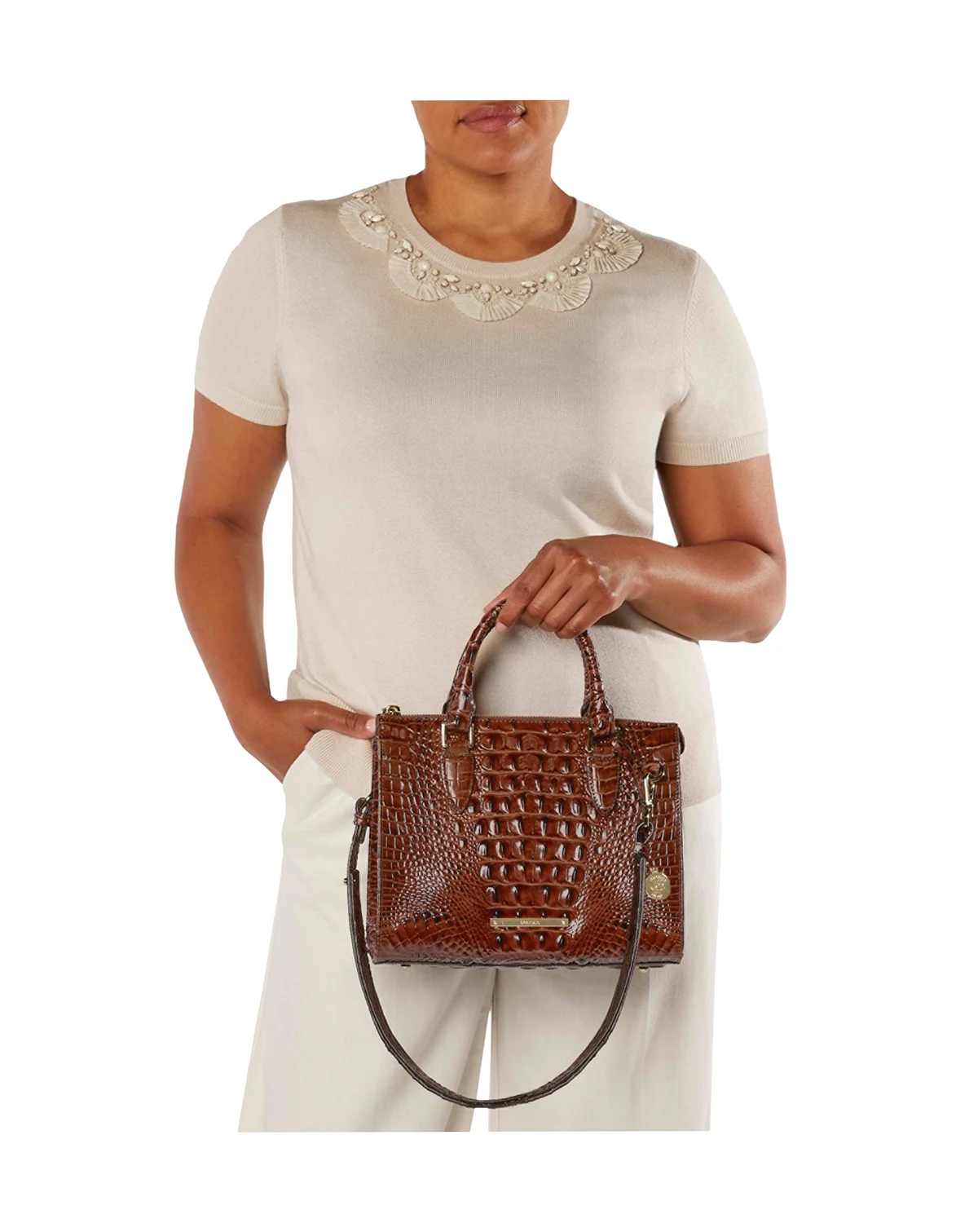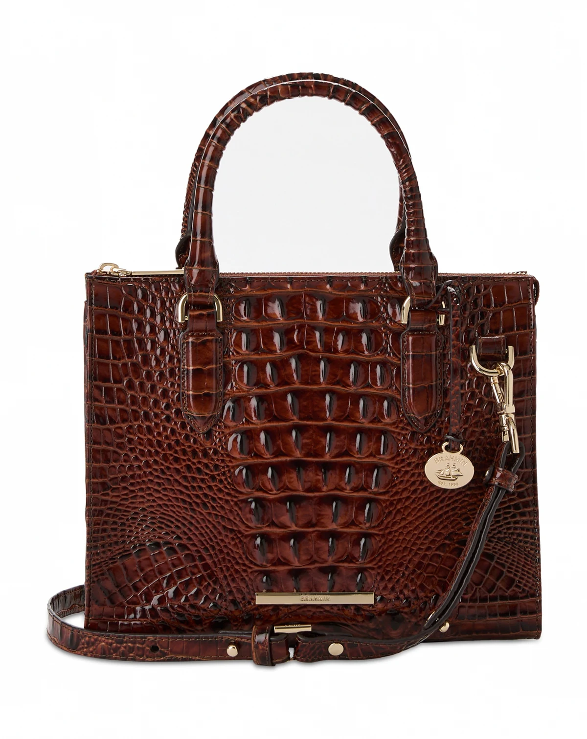 Exquisitely crafted in luxurious croc-embossed leather, this Brahmin carryall offers intuitive organization in a classic, structured silhouette that never goes out of style and converts from crossbody to satchel via the removable strap.