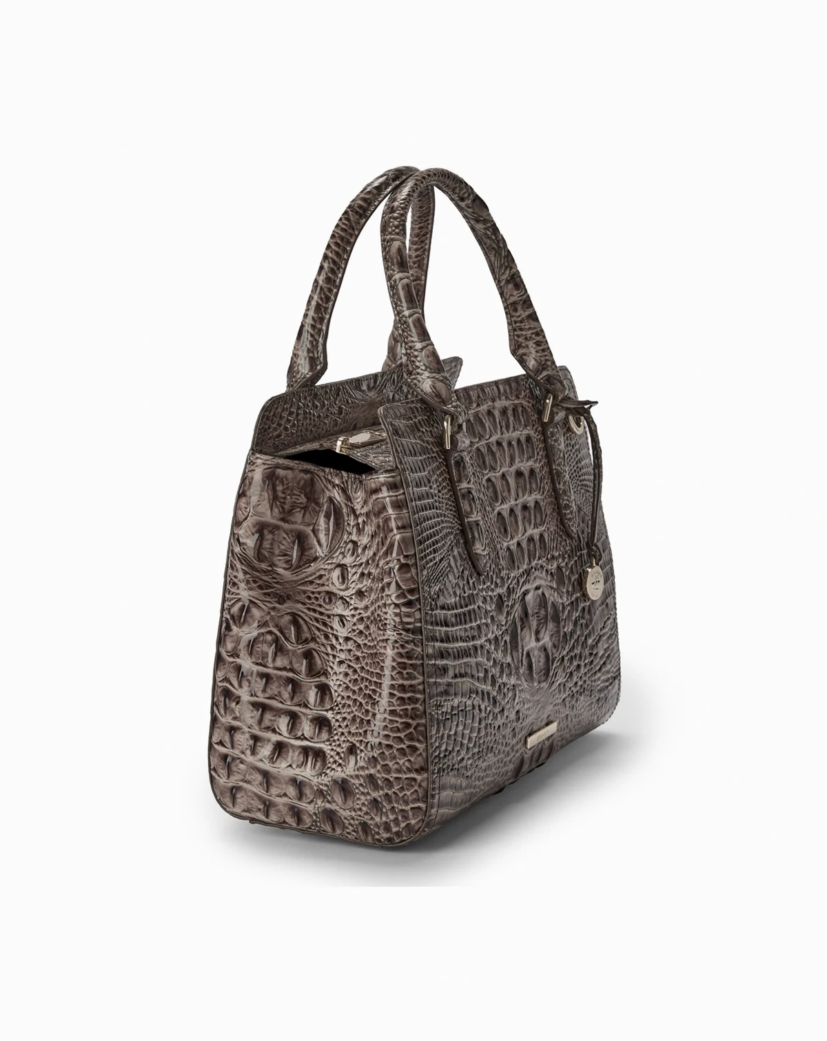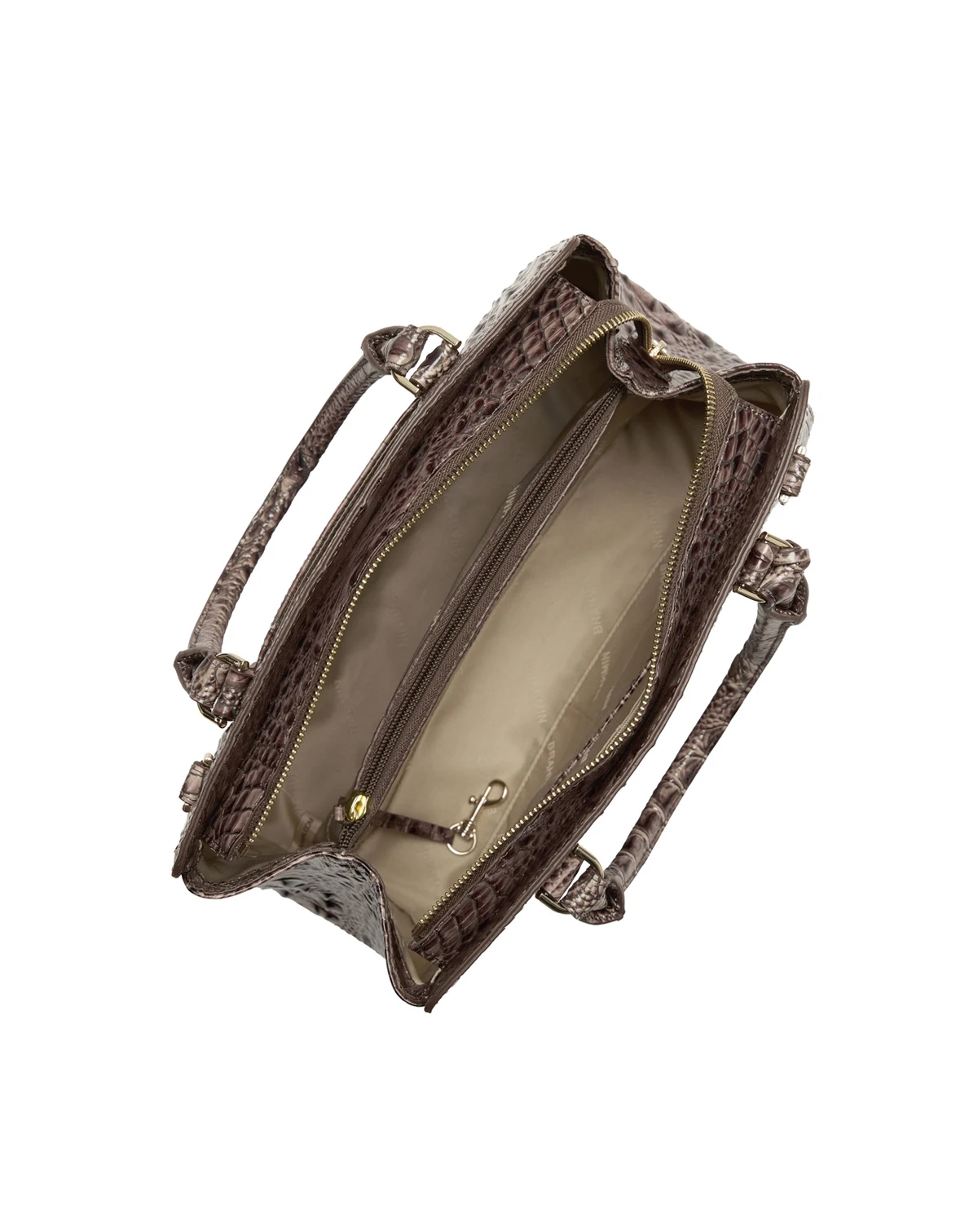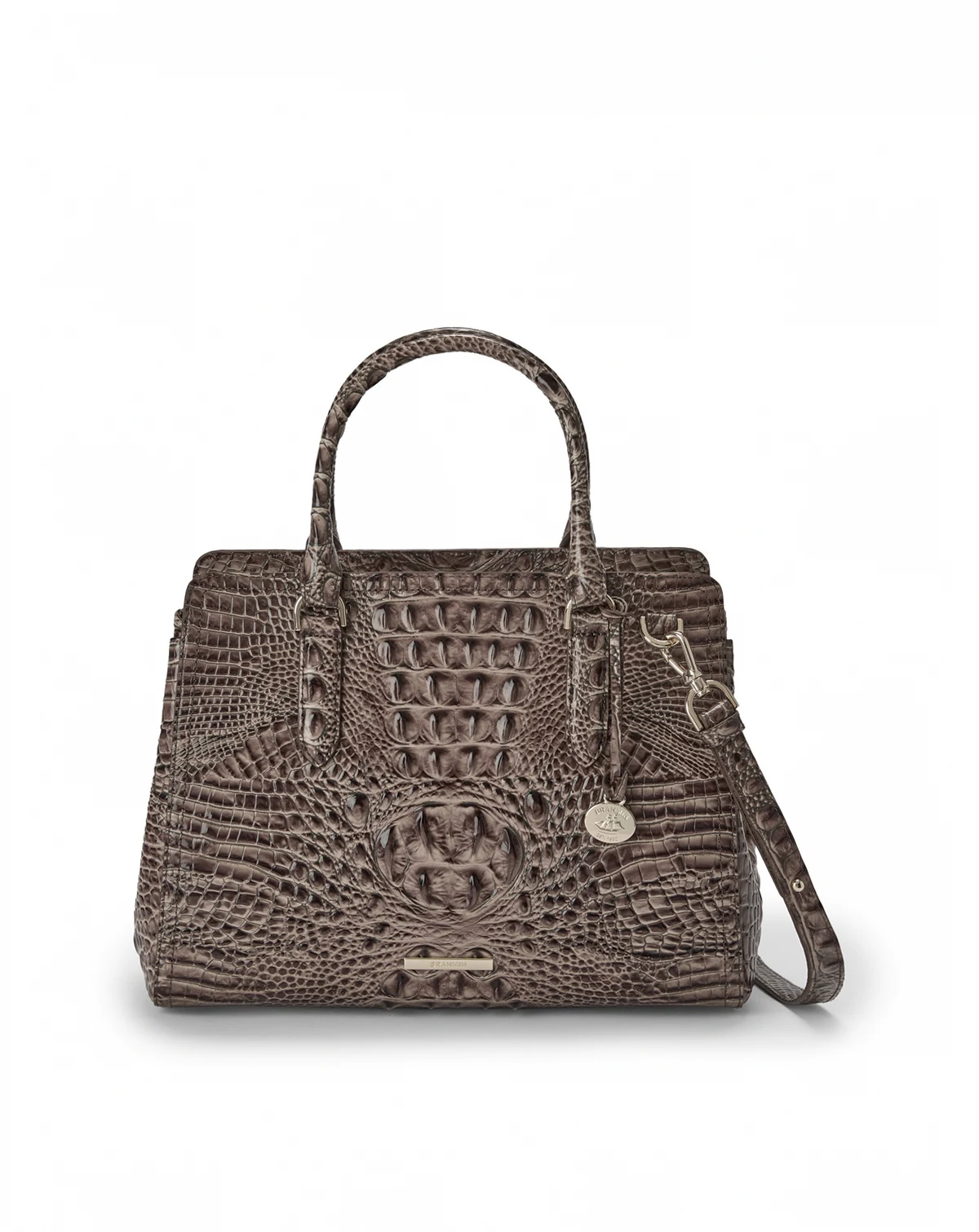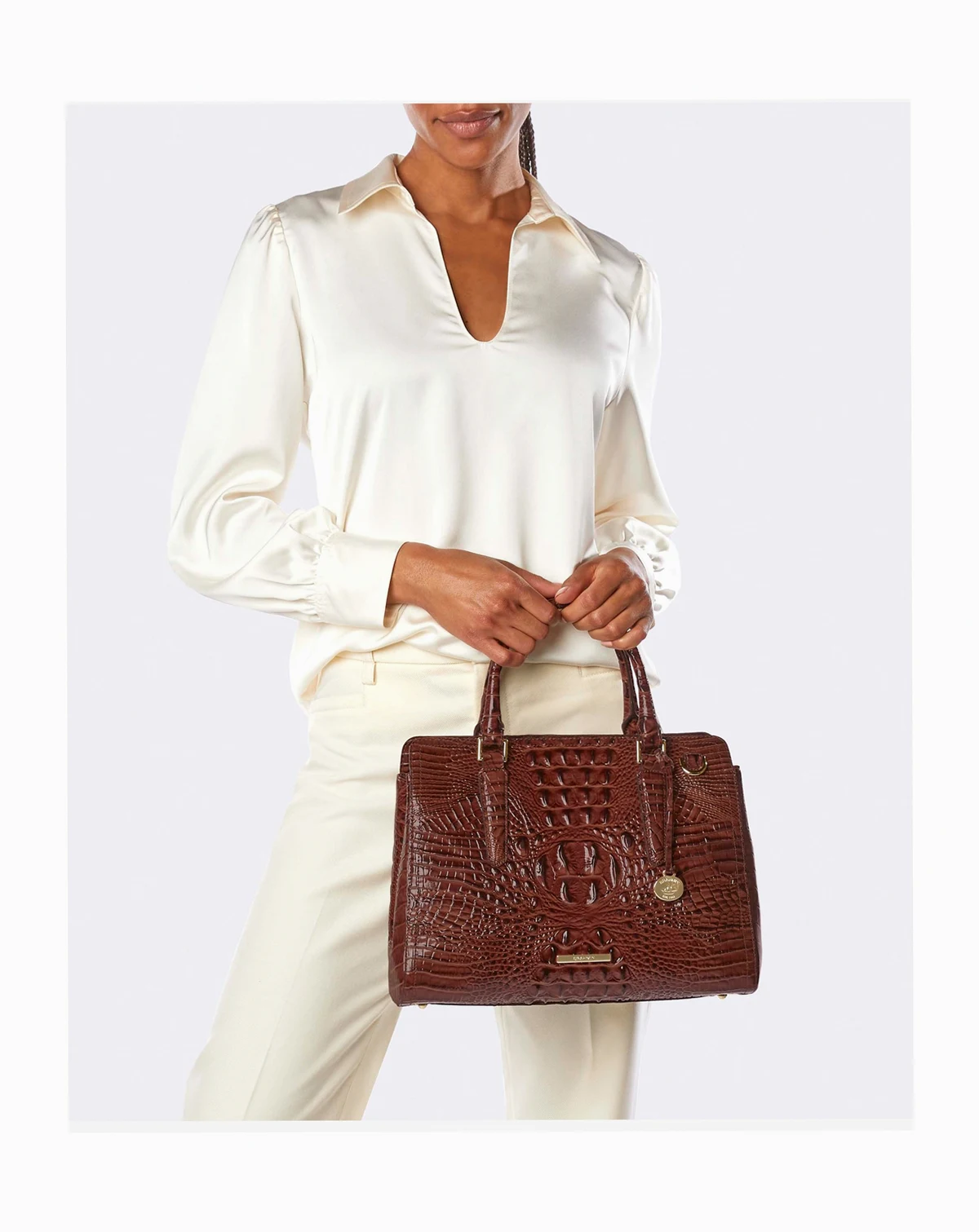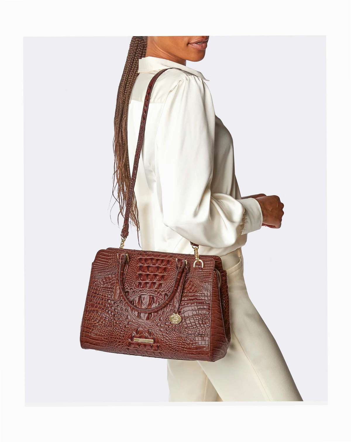 Suited for both date nights and day trips, this Brahmin satchel is crafted from smooth leather and features multiple interior and exterior pockets for organized storage. Gold-tone hardware accents the design, and a dust bag is included.