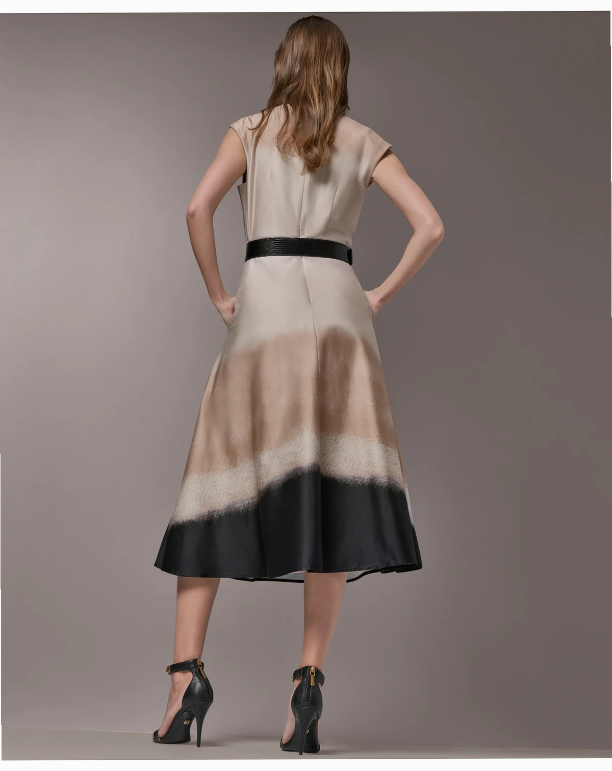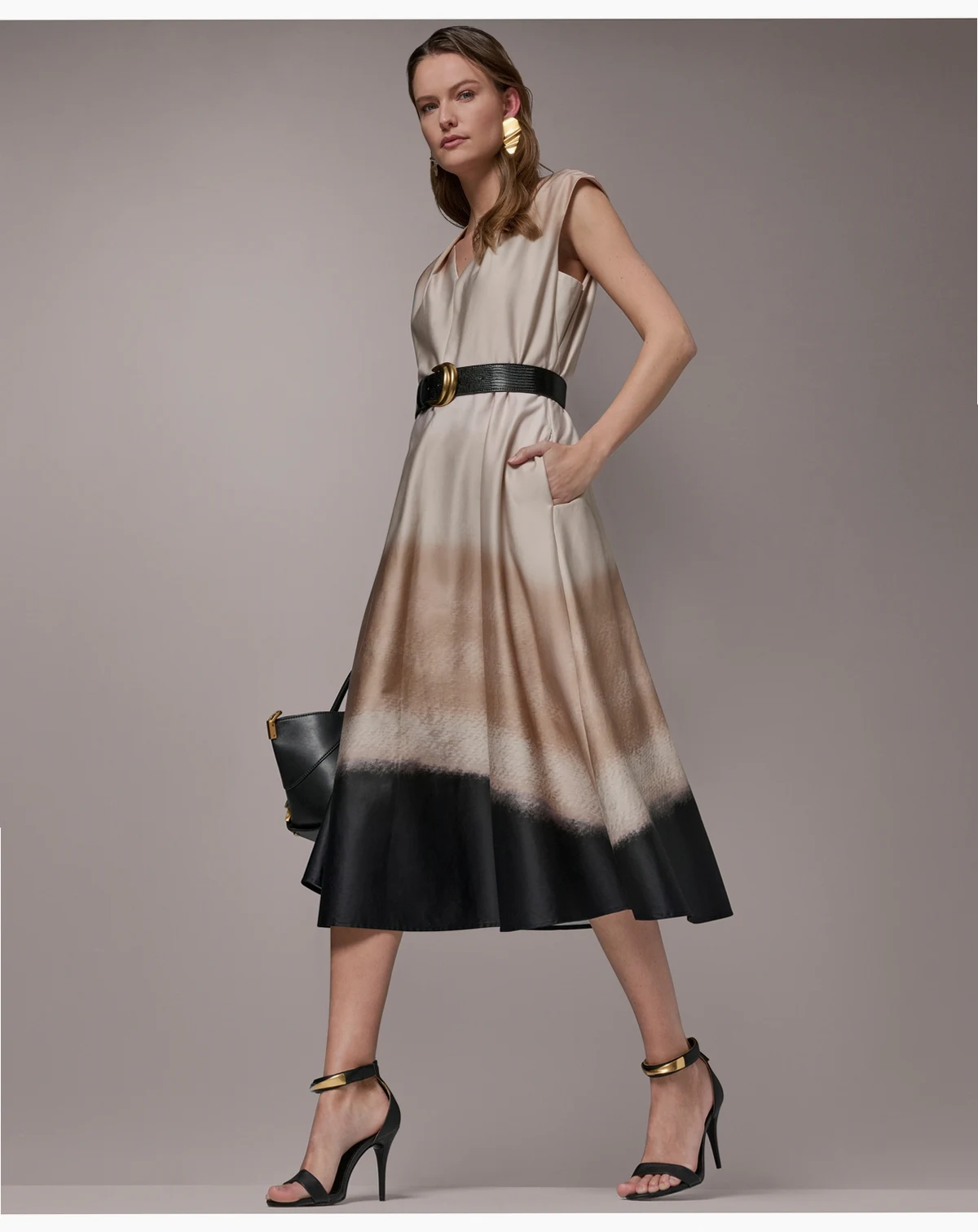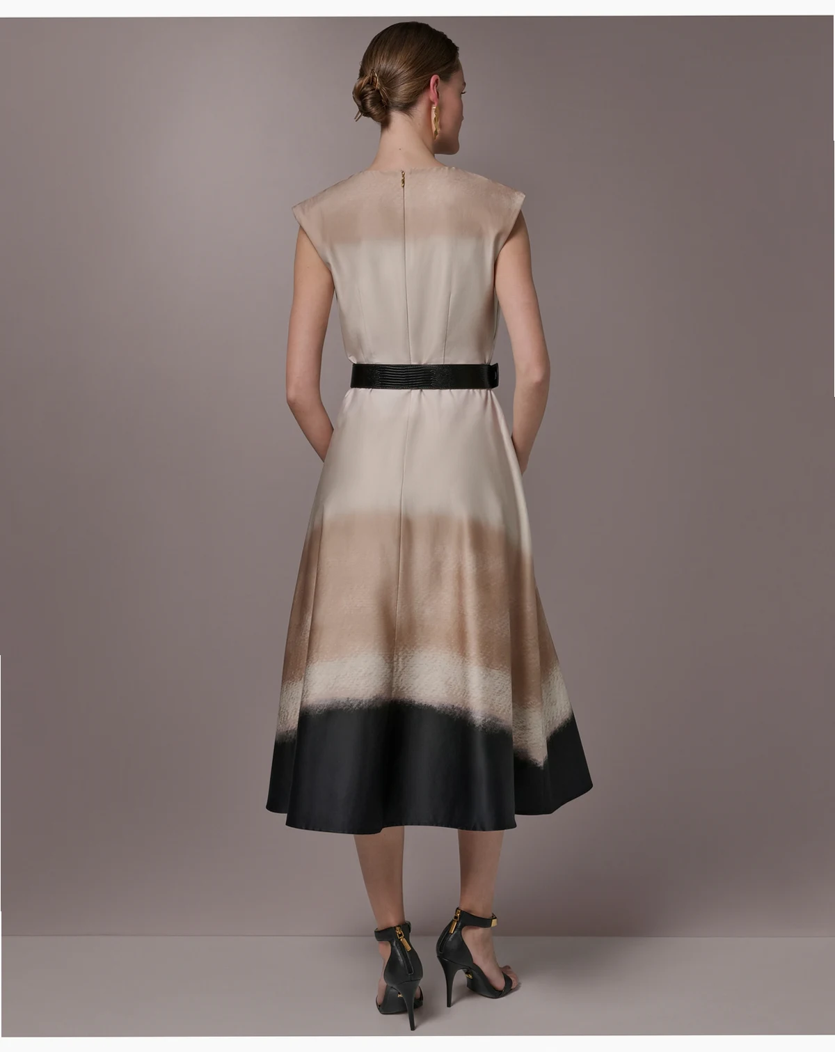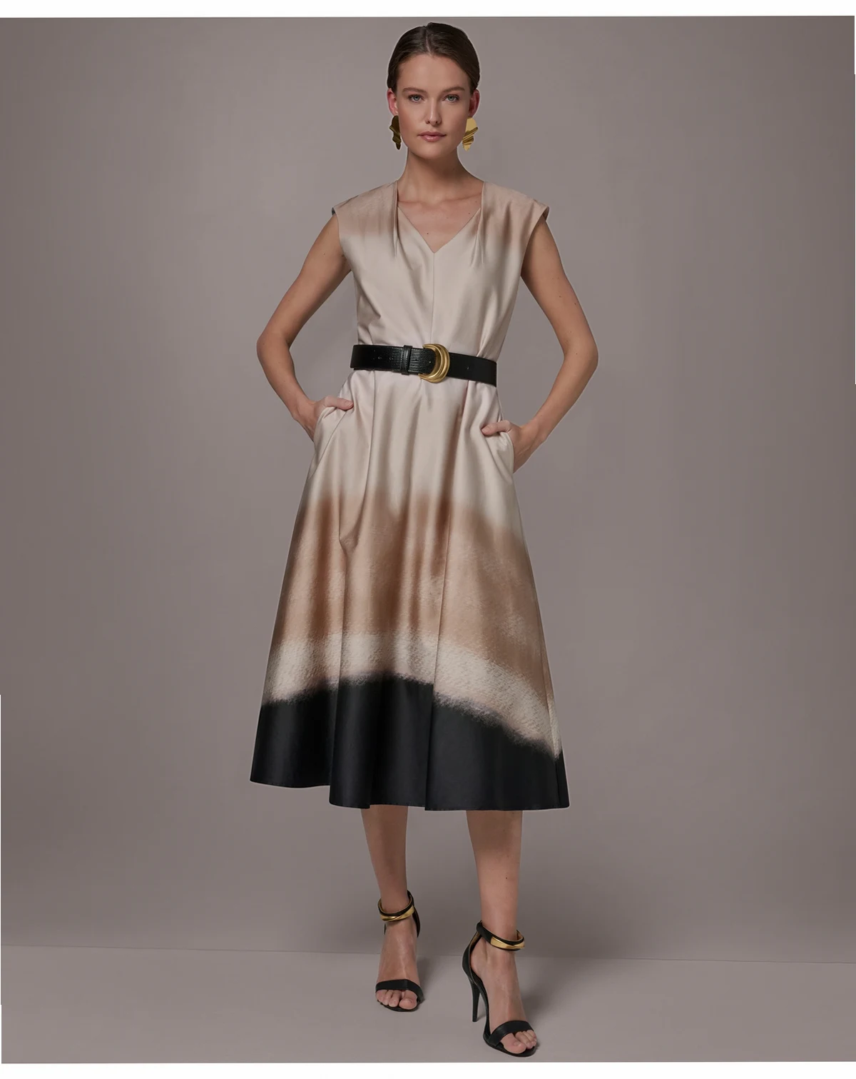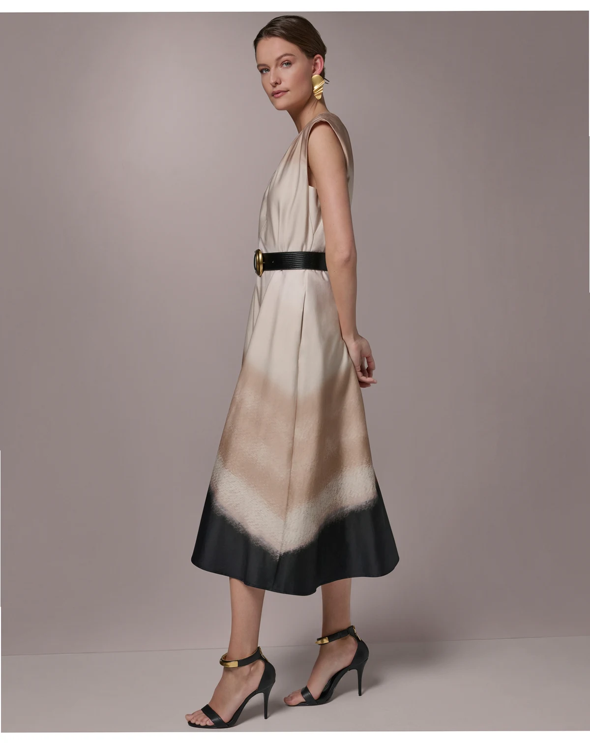 Refresh your style with this Donna Karan New York dress, crafted with a sleeveless cut and removable belt for a tailored fit. The vibrant print and V-neck create a chic look for any occasion.