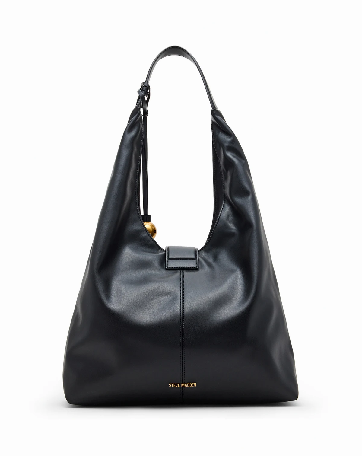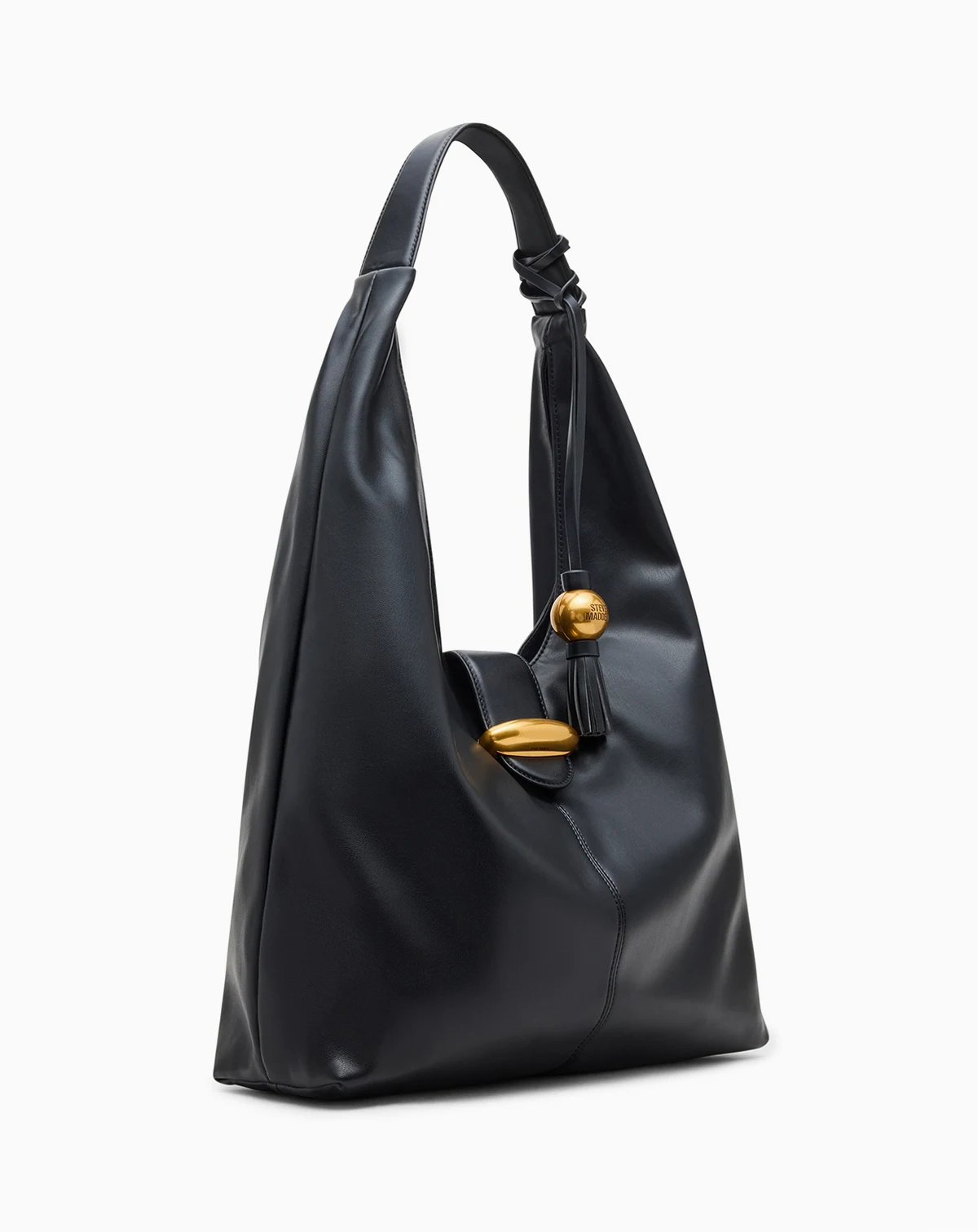 The Steve Madden Bbronwyn Hobo Bag offers a spacious, slouchy silhouette accented with a bold gold hardware detail on the front. Designed with a magnetic closure and a removable tassel charm, it also features an interior back wall zipper pocket and front wall slip pocket to keep your essentials organized.