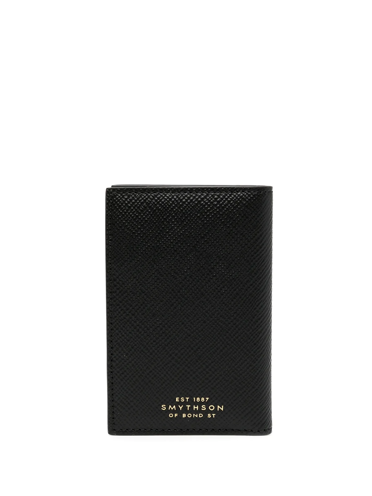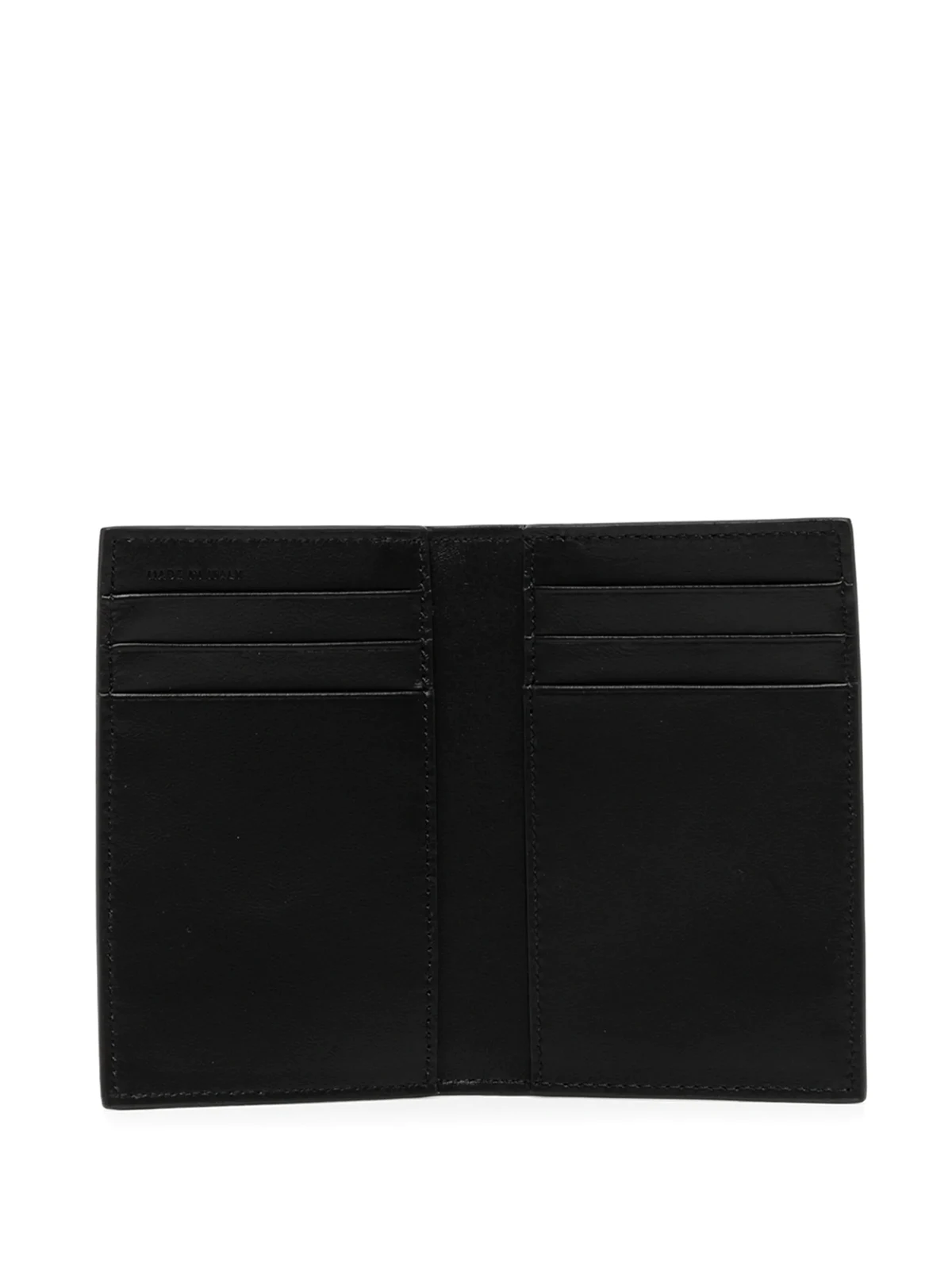 black/gold leather bi-fold design gold-tone logo lettering internal card slots gold-tone logo lettering