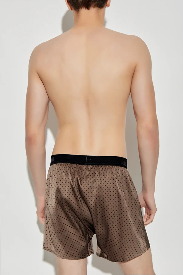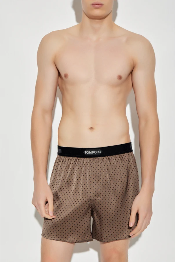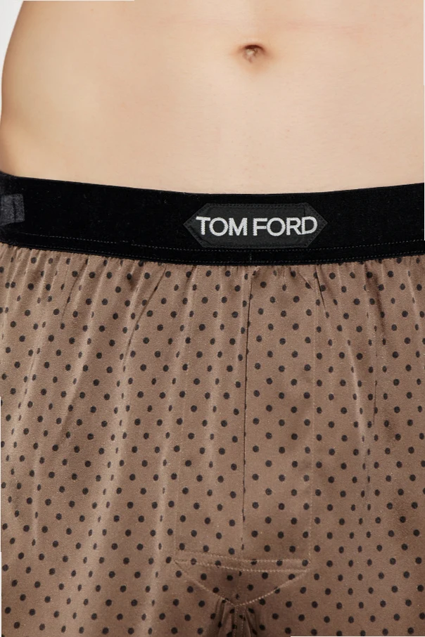 A refined pattern of small, dark dots punctuates the rich brown hue, while a contrasting black elastic waistband adorned with the iconic TOM FORD logo lends unmistakable distinction. Impeccably tailored, these boxers exhibit flawless finishes, free from visible seams or imperfections—testament to exceptional craftsmanship that defines sophistication.