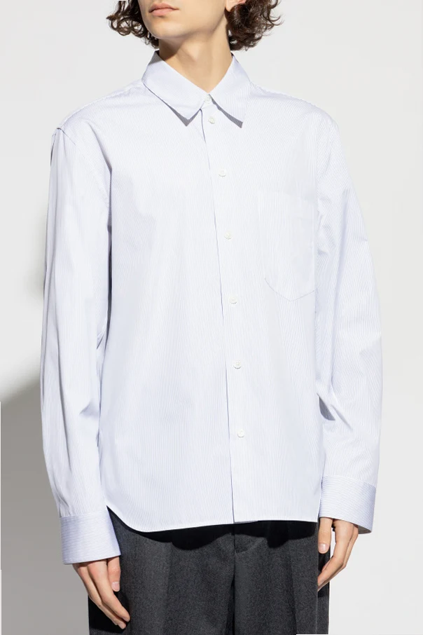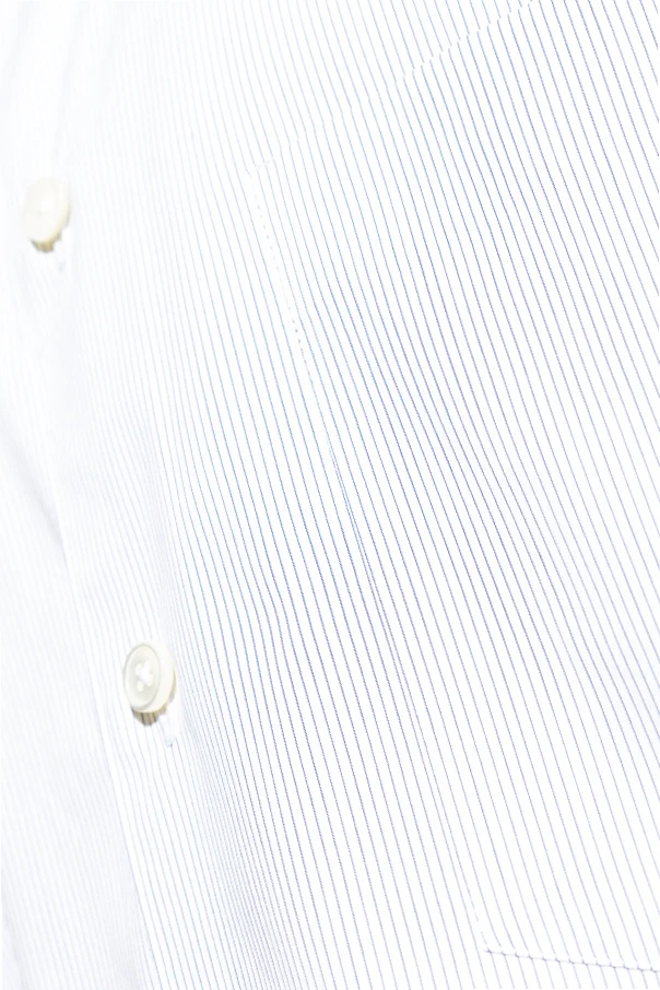 Its striking, almost pure white canvas is elegantly adorned with a whisper-fine pale blue micro-stripe, a detail that conveys both freshness and timeless charm. A discreet, rounded pocket seamlessly graces the left chest, offering both practicality and considered design. Polished, pearl-white buttons complete the look, uniting understated luxury with purposeful simplicity. Unadorned by external branding, this piece exemplifies Jil Sander’s commitment to purity and sophistication.