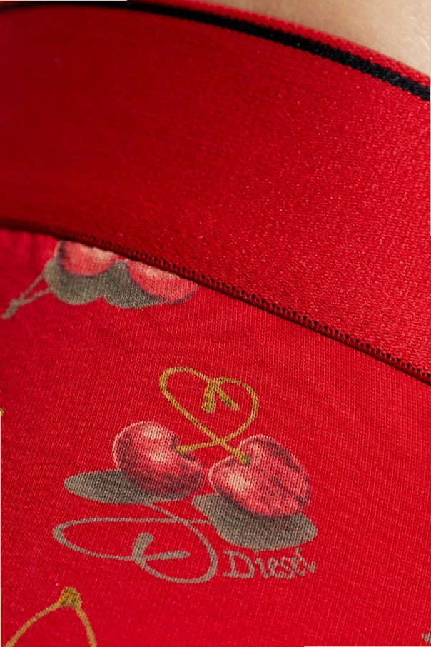 Elevate your essentials with the DAMIAN-GFT Trunks from Diesel’s exclusive collection. Radiating sophistication, these trunks feature a vivid red hue adorned throughout with a delicate pattern of cherries—some artfully connected by stems shaped into hearts, infusing the design with charm and subtle playfulness.