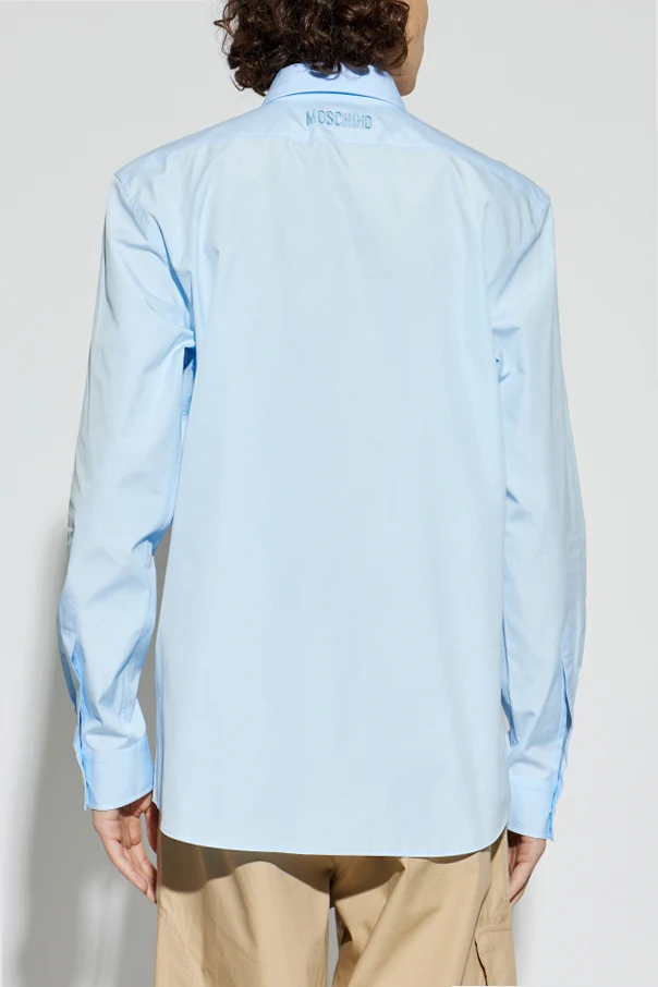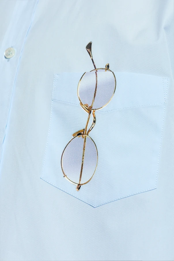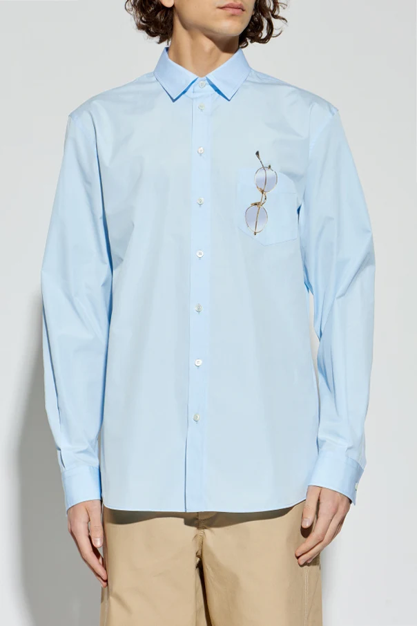 The defining element—a finely executed chest pocket—is adorned with a whimsical, designer touch: an artful sunglasses motif, rendered in either print or embroidery, ingeniously simulates frames casually tucked into the pocket. Discreet finishing details accent the placket and collar, exemplifying Moschino’s signature panache and playful luxury since 1983. This shirt is an embodiment of refined optimism and Italian sartorial wit.