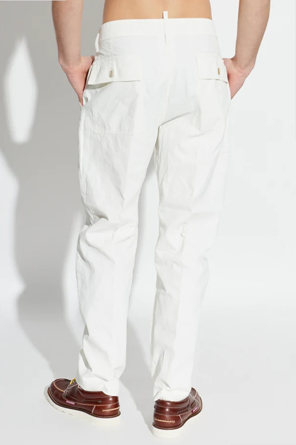 Discover refined sophistication with these white tapered-leg trousers from Dsquared2 . Effortlessly merging modern aesthetics with timeless elegance, this piece captivates with its smooth, matte finish and subtly structured, high-quality cotton fabrication. The silhouette features a relaxed fit through the hips, gently narrowing towards the ankle, offering a distinguished, contemporary profile.