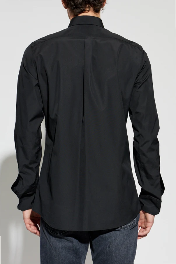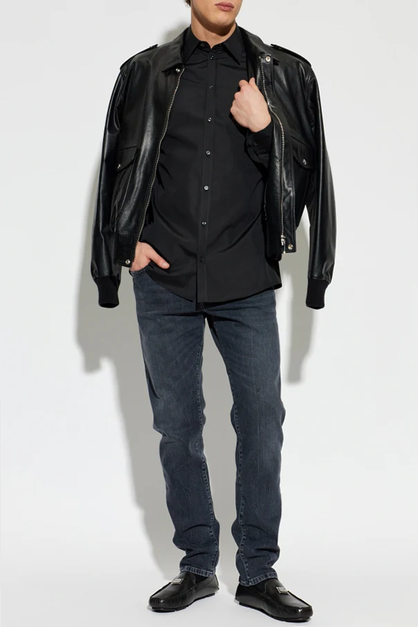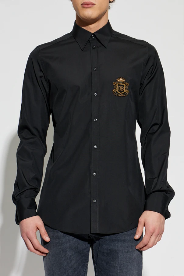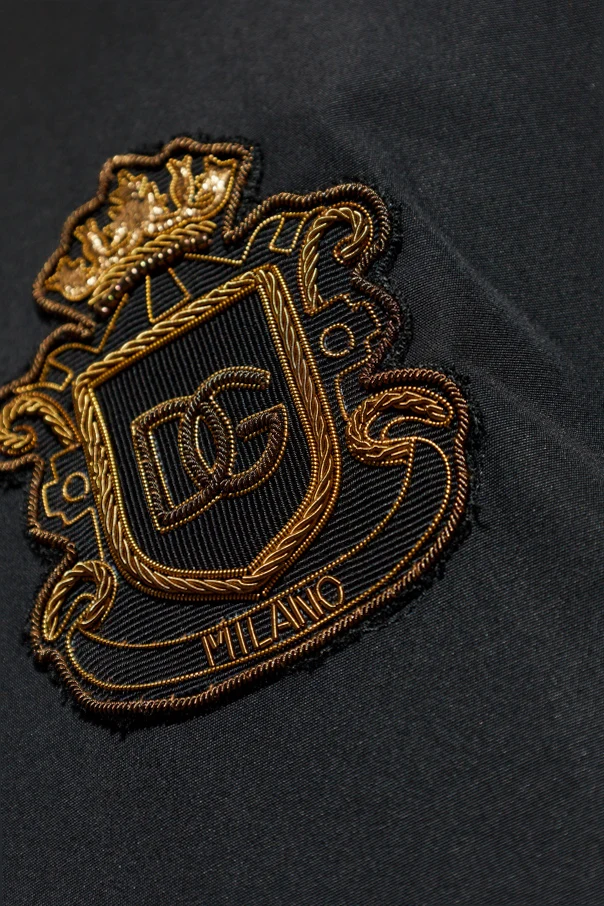 The signature detail—an ornate, embroidered golden crest with “DG” initials, crown, and “MILANO” inscription—graces the left chest, announcing an unmistakable affiliation with the legendary house of Dolce & Gabbana. Discreet, classic buttons descend the front, reflecting the Italian design duo’s dedication to refined simplicity.