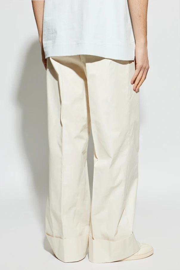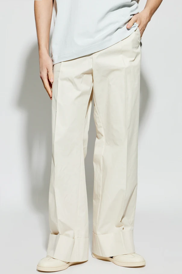 Distinguished by prominent, thick cuffs at the hem, these trousers make a bold statement, while the single pale button at the waist and discreet front zip reflect understated elegance. The design is completed by two neatly integrated side pockets, ensuring both form and function in every detail. Unlined, solid in color, and devoid of pattern, they manifest timeless versatility.