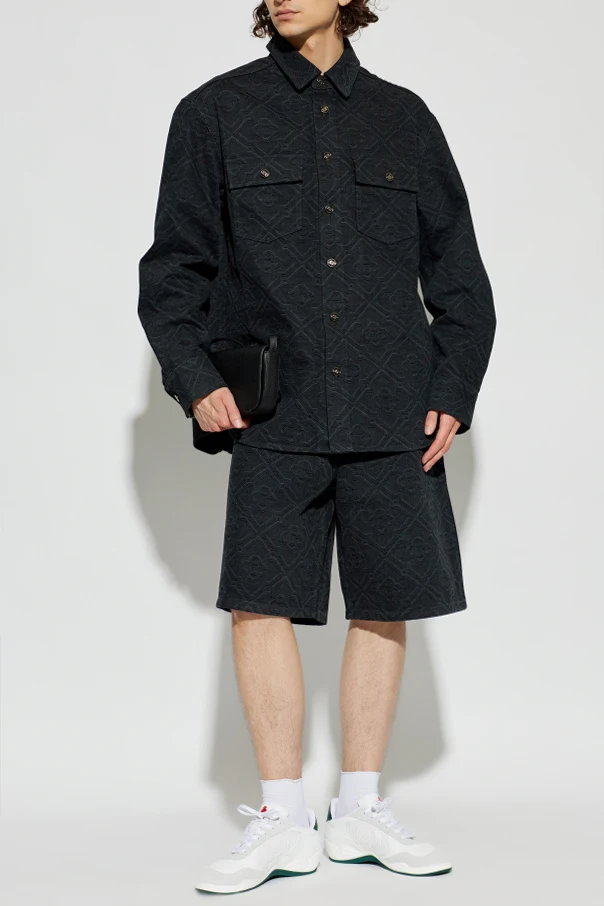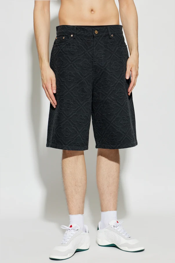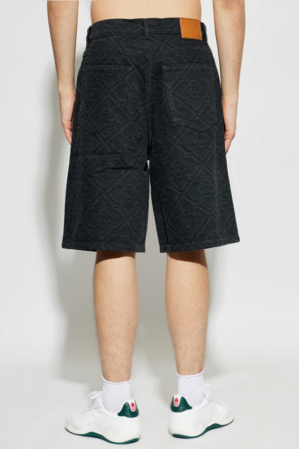 Experience refined sophistication with these black denim monogram shorts by Casablanca . Crafted from premium, densely woven cotton denim, these shorts showcase an exquisite jacquard monogram—an understated geometric motif expressed across the fabric for a distinctive visual signature. The classic, straight-cut silhouette with wide legs falls effortlessly to the knee, offering a modern yet timelessly comfortable fit.
